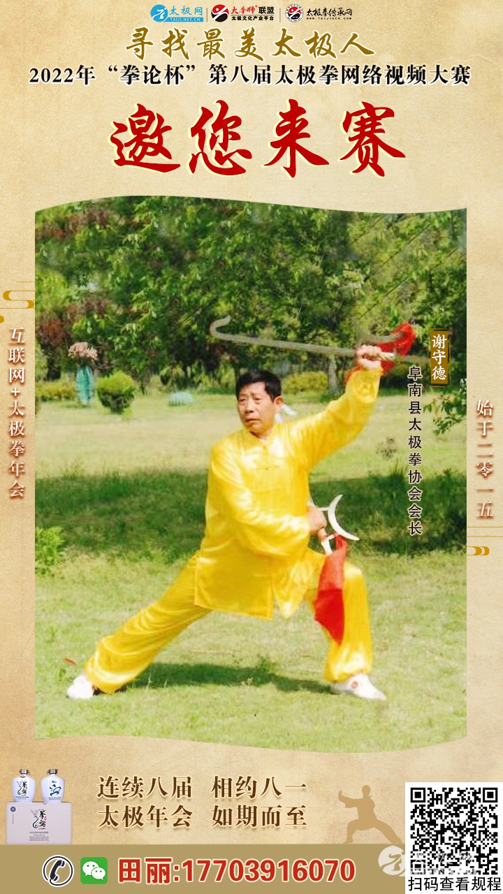 谢守德老师演练陈式太极拳 谢守德,生于1952年,安徽省阜南县人。国家级社会体育指导员,一级武术裁判,中国武术六段,中国武术段位制考评员。现任阜南县太极拳协会会长、阜阳市太极拳协会副会长。自幼习武,精通少林拳,查拳,八卦掌,中年开始研习太极拳。1998年起传授太极拳至今,现有学员500余人。谢守德老师武德并重,热心公益事业,在广场免费传教中老年练太极拳,并率领团队积极代表县里参加省市比赛和活动,为阜南县太极拳的发展做出了重要的贡献。2013年至2014年度协会工作中成绩显著,为阜阳武术事业发展做出积极贡献,被阜阳市体育总会、阜阳市武术协会评为“先进个人”。2013年8月“体彩杯”安徽省“千百十”社会体育指导员评选表彰活动中,被评为“群众最喜爱的社会体育指导员”。2020年11月被中国武术联合会授予为《中国武术家》称号。2020年12月被阜阳市武术协会评为“先进个人”。 太极网创立于1997年,创始人刘洪奇,现任总编李超。领衔太极文化网络传播与武术产业运营20余载。 2005年太极网即首创“国际太极拳DV大赛”,十年磨一剑,自2015年首创国际太极拳网络视频大赛以来,持续引领“互联网+太极拳”赛事模式运营及标准制定和探索,近年来,依托太极网平台及大拳师赛事系统,与多地文旅/体育局、武协及馆校组织等合作,成功组织举办武术网络赛事近百起,受到武术界广泛赞誉和肯定,当之无愧武术网赛的先行者、开拓者。 “寻找最美太极人——太极拳网络视频大赛”至今已连续成功举办七届,成为“互联网+太极拳”年度标志性盛会,2021年“拳论酒”第七届大赛国内外拳友和太极拳组织共3000余人参赛,千万拳友踊跃互动交流,盛况空前,好评如潮。 应广大太极拳爱好者的热烈要求,寻找最美太极人——2022年“拳论杯”第八届太极拳网络视频大赛“大阅兵”即将上演。连续八届,相约八一。太极年会,如期而至!组委会恭候拳友们上线展示太极拳风采、交流太极拳心得、切磋太极拳技艺、共享太极拳之美。 |