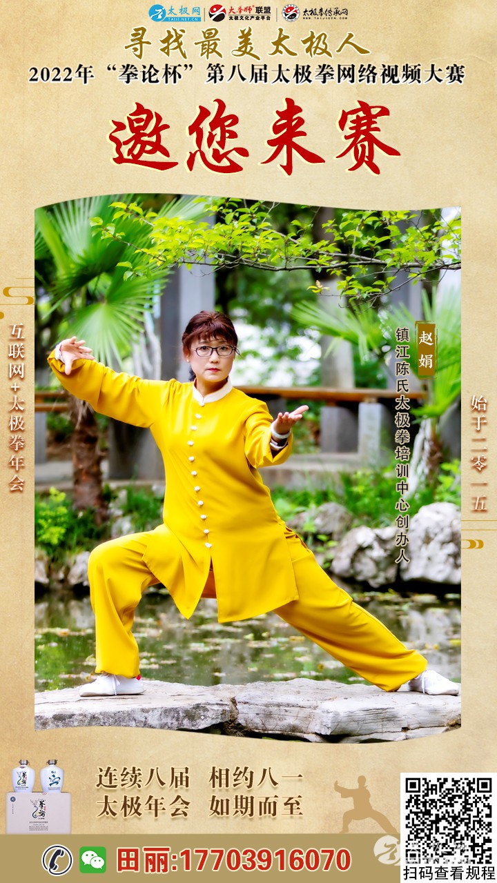 赵娟,1996年习武,后拜在陈家沟陈氏第十九世陈小旺先生门下,正式成为陈式太极拳第十二代传人。跟随陈小旺先生修习陈氏太极拳,得到陈小旺先生的悉心指导,加之聪颖刻苦,勤于钻研,精熟陈氏太极拳各种套路,刀、枪、剑、棍及推手,无一不精。在镇江创立陈氏太极拳培训中心,致力于陈氏太极拳在镇江的推广与传承,多次荣获国际国内陈式太极拳比赛一等奖,在多年的教学中,其亲授学生数万人,培养出数名全国、国际太极拳、剑、推手冠军。还率领太极代表队,参加全国各项比赛,均取得了优异成绩,硕果累累。 2003年至今,将陈氏太极拳普及推广到镇江各企事业机关单位,教学学员达到几千人次,并在企事业单位内部成立太极拳协会担任会长,定期组织爱好者们的太极交流。并将陈氏太极拳普及推广到各大高校,并担任指导老师,为太极文化在高素质年轻群体中的弘扬推广做出努力。