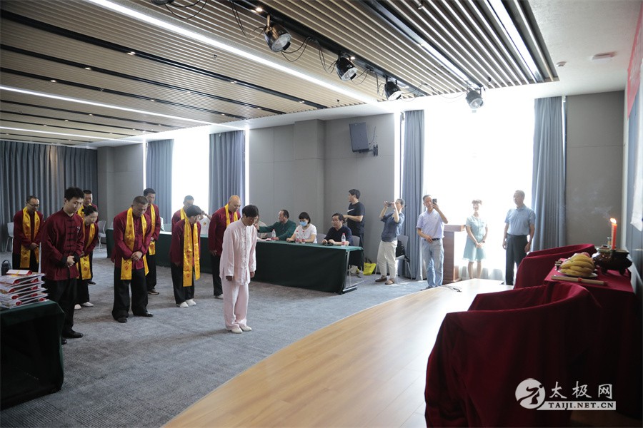 拜师仪式遵照传统仪式有序进行,陈素英老师首先向太极拳始祖陈王廷及历代先贤敬香行礼,追忆先辈创拳之恩德,感念先贤传拳之辛劳。新入门弟子依次上前递交拜师贴、行拜师礼,师父回帖,颁发太极拳传承人证书。随后,师公亲自为新入门弟子披挂太极拳传承人绶带。陈素英老师带领新入门弟子向太极拳始祖行礼,以示礼敬先贤之意。在众人的见证下,拜师仪式圆满礼成。