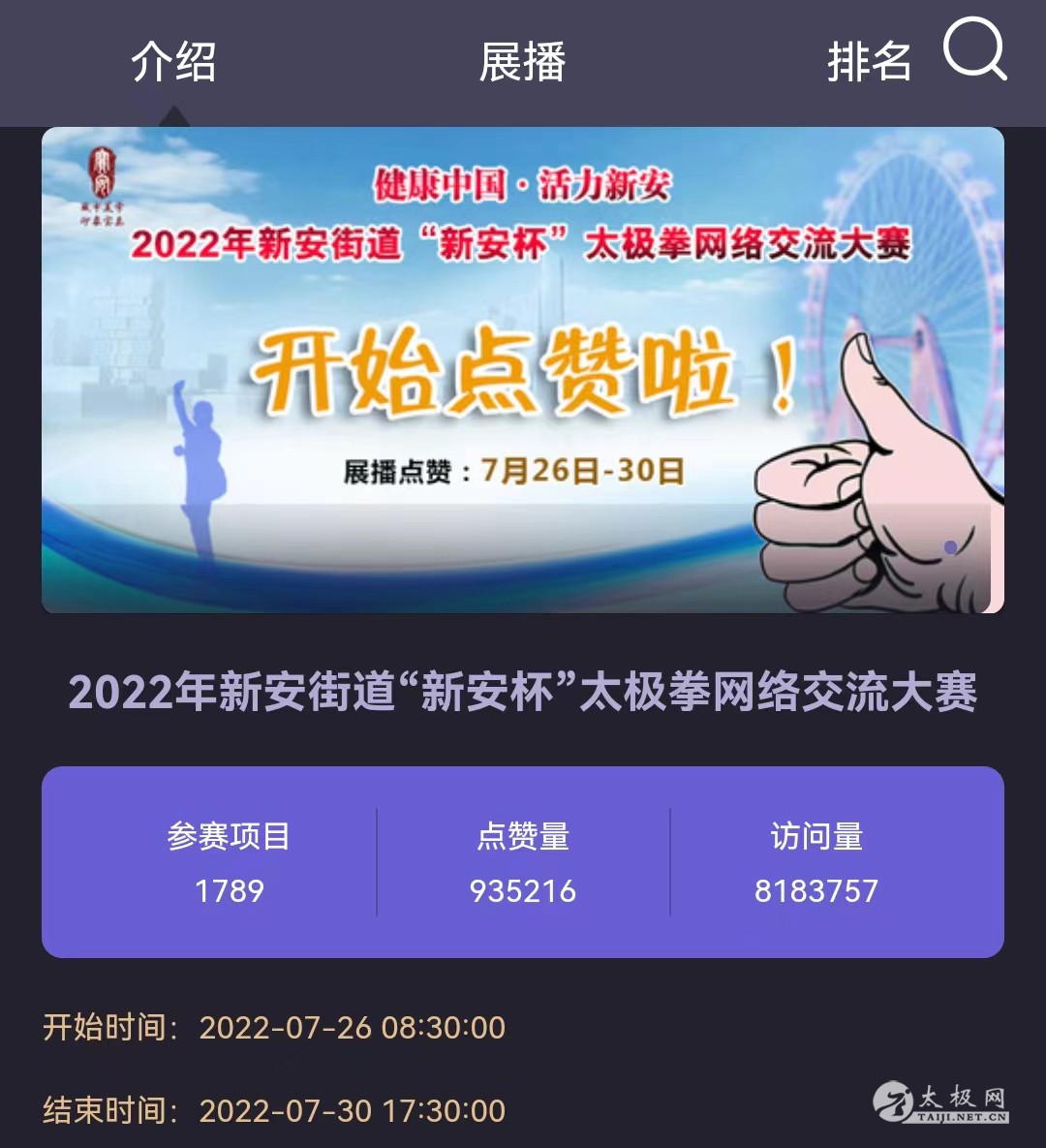 | 7月30日下午5点30分,由深圳市宝安区新安街道党工委、办事处主办,新安街道党建服务中心(文体)、深圳市宝安区太极拳研究会承办的2022年新安街道“新安杯”太极拳网络交流大赛经过5天网络展播圆满收官。 继2020年、2021年连续两年成功合作,本届大赛继续由业界权威媒体平台太极网提供全面网络运营服务,大赛一经发起,各地太极拳组织积极响应,最终累计3000余人参赛,精选1789部参赛作品(含集体项目)参与展播,大赛规模呈倍增态势受到各地拳友广泛关注和强烈热议。 本届大赛全体同台展播点赞从7月26日开始,截至30日17:30收官,平台累计网络访问量高达800余万次,投票点赞90余万次,广大拳友们互动留言频繁刷屏,连续5天燃爆太极人的朋友圈! 本着"公开透明、客观全面、权威公正"的评审原则,在大赛展播点赞的网络基础上,组委会将邀请专业裁判员组成强大的评审阵容为大赛评审工作提供坚实保障,让大赛兼具观赏性和权威性。大赛评审结束后统一公示成绩,敬请期待。 “新安杯”太极拳网络交流大赛组委会 2022年7月30日 |