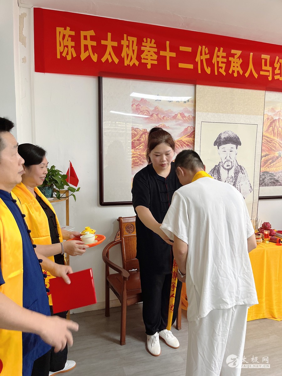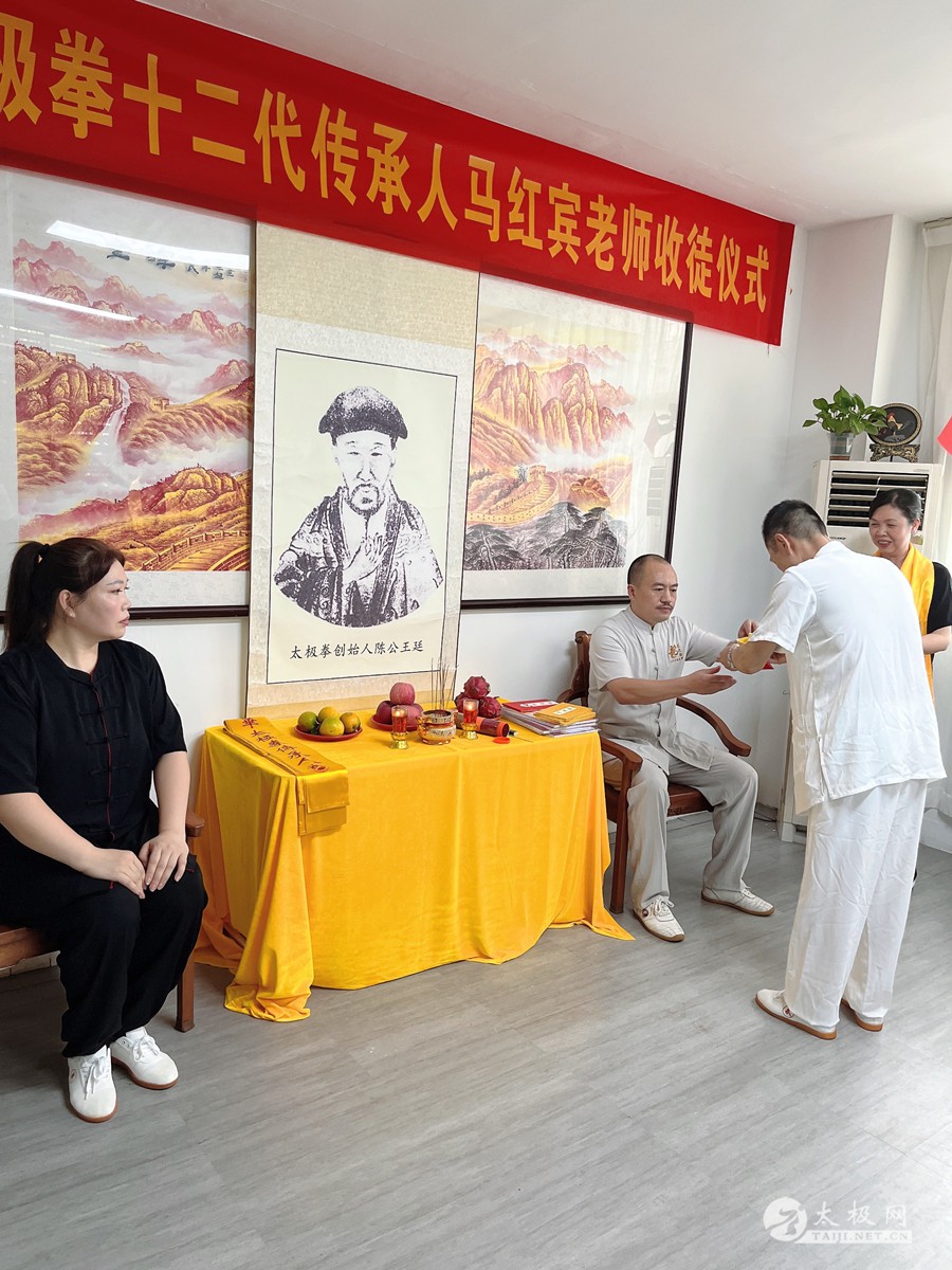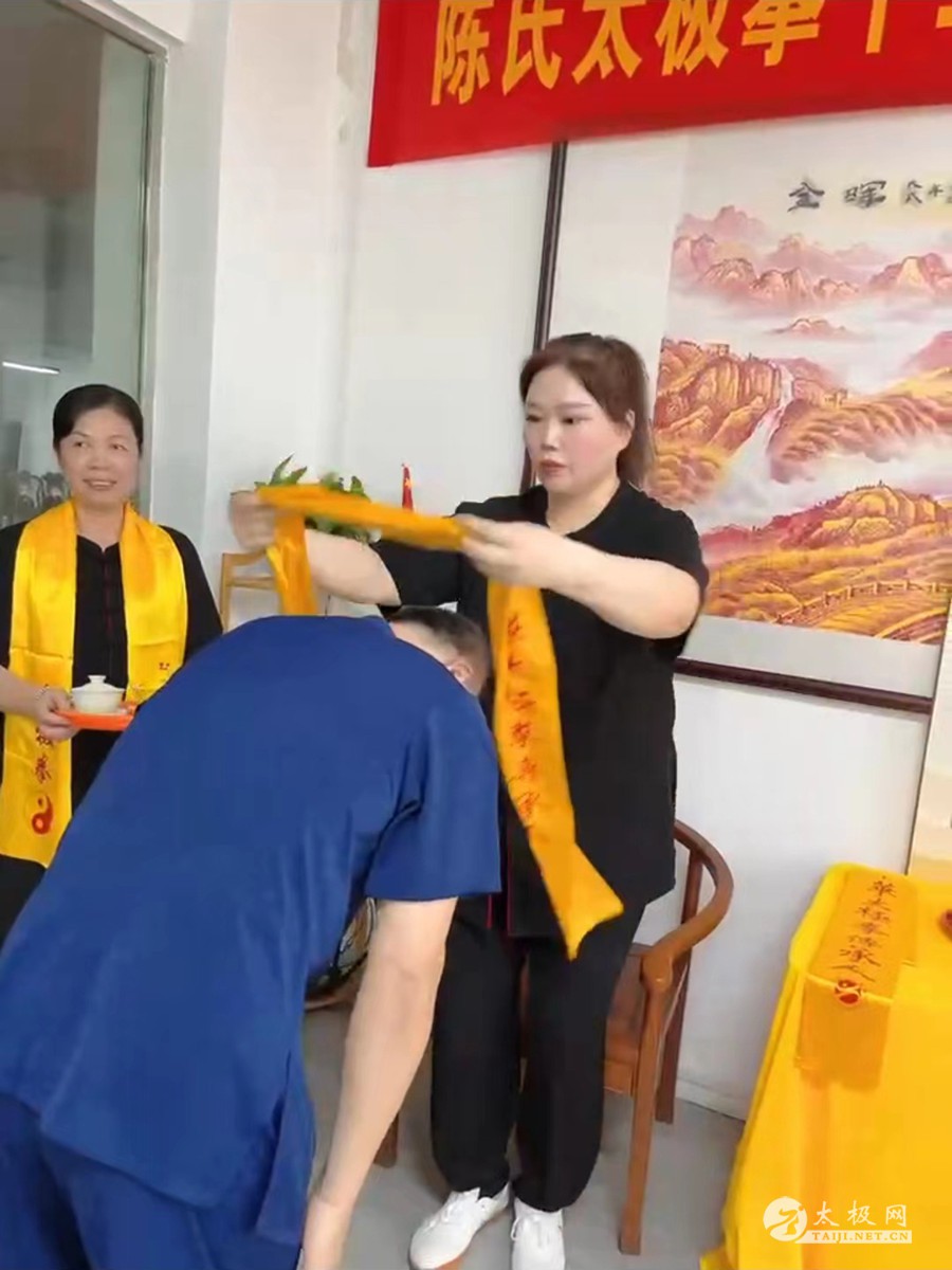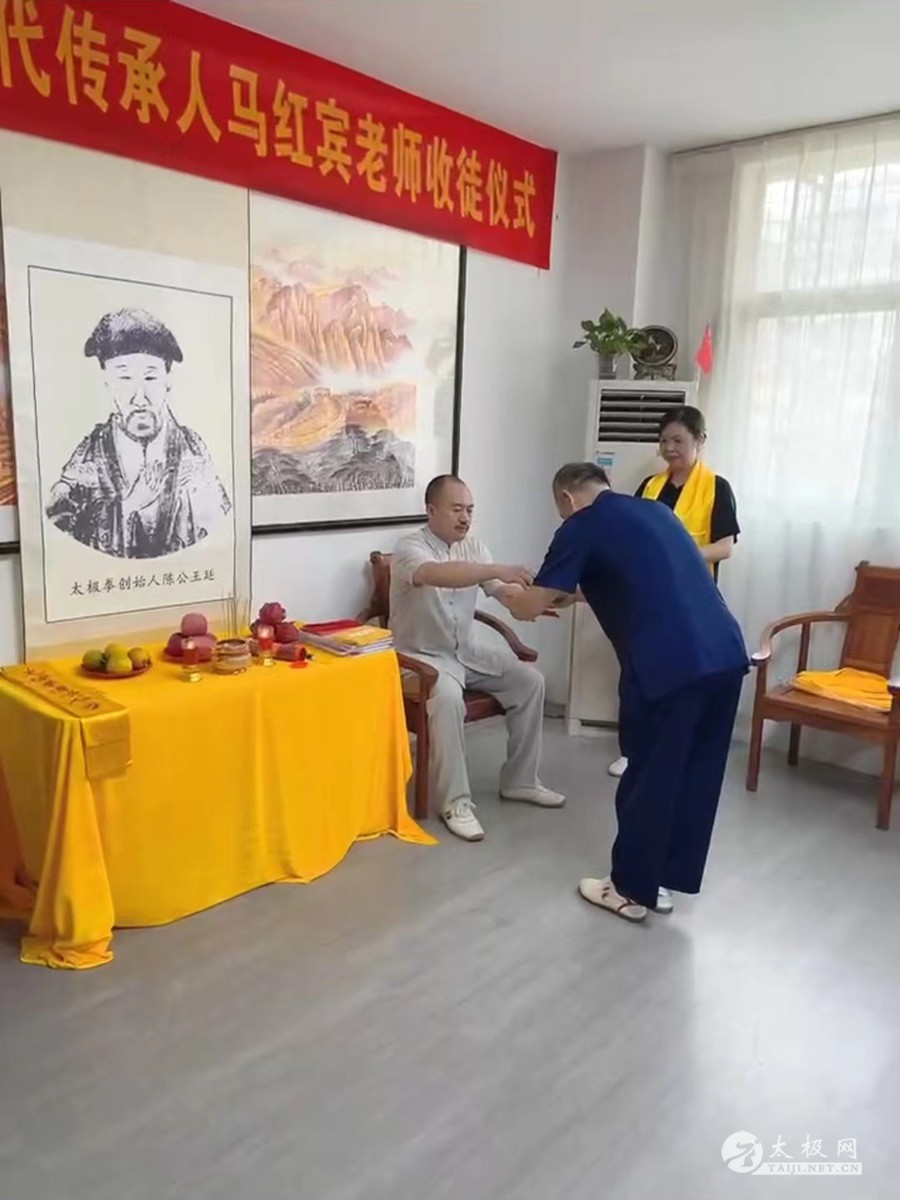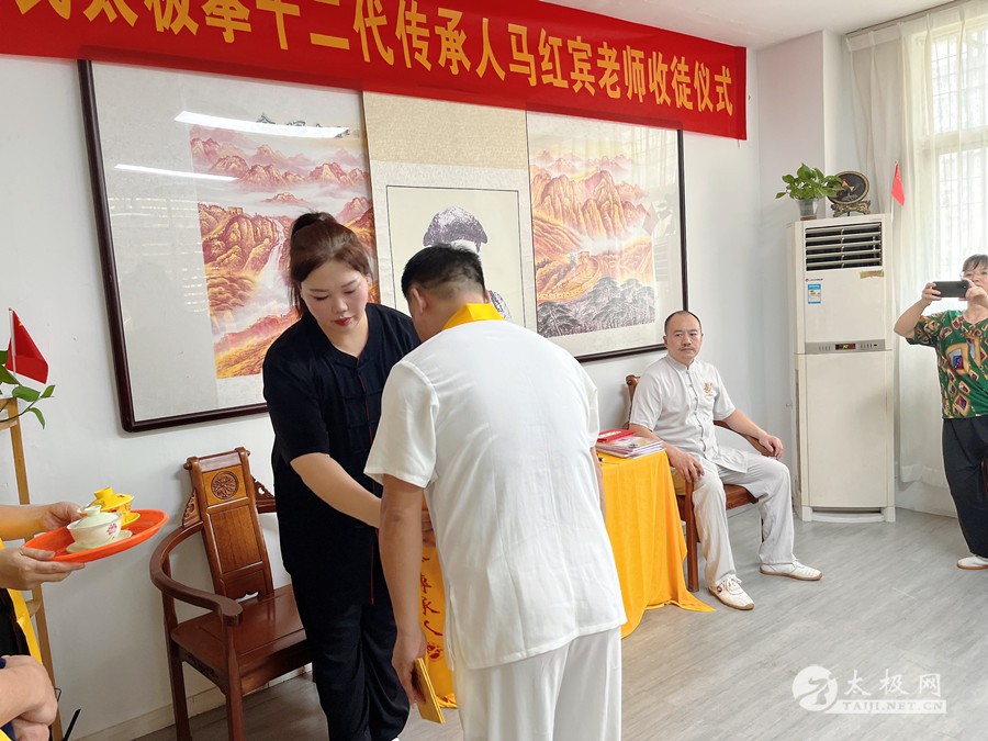 (太极网讯)中华优秀传统文化太极拳,薪火相传,生生不息。2022年7月30日,当代太极拳名家、陈式太极拳第十二代传人马红宾收徒仪式于广东省揭阳市龙之韵太极拳俱乐部举行。本次拜入马红宾老师门下的有吴小彤,黄二军,何小灯,黄庆东等四名优秀的太极拳爱好者。通过传统拜师仪式正式成为陈式太极拳第十三代传承人,肩负起传播太极拳,弘扬太极文化的责任使命。 新入门弟子上前向师父、师母行鞠躬礼,师母为弟子披挂太极拳传承人绶带。随后,新入门弟子依次向师父师母递交拜师帖、行拜师礼、敬拜师茶。 |