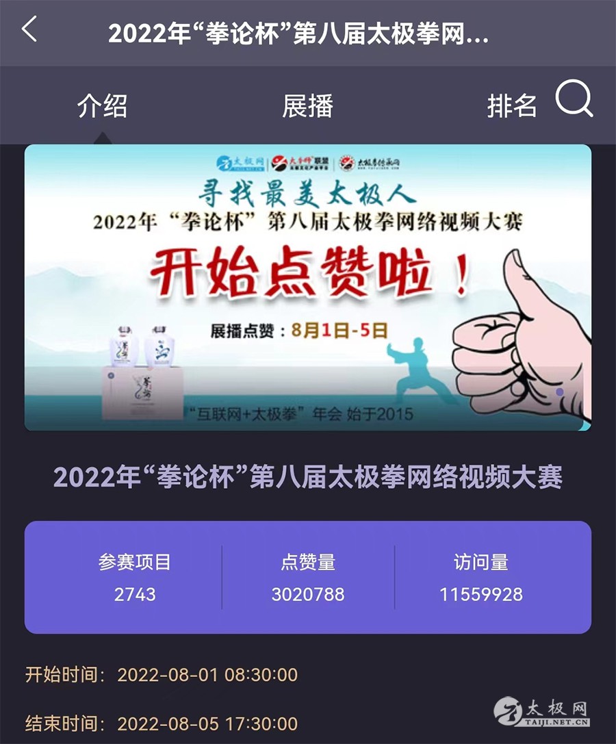 健康中国,太极同行。太极,以网会友。寻找最美、展示最美、传播最美、点赞最美!8月5日下午,一年一度的“互联网+太极拳”盛会、万众瞩目的寻找最美太极人——2022年“拳论杯”第八届太极拳网络视频大赛网络展播点赞活动经过5天持续高能燃烧圆满收官。 连续八届的大赛始终保持规模增长,本届大赛再创新高,不足一月时间启动报名至上线展播,参赛便突破3000余人。在全球广大拳友及太极拳组织的参与和支持下,“互联网+太极拳年会”的影响力在千万拳友的星火汇集下成燎燃之势。 本届大赛展播点赞依旧延续历届赛事时间传统,自从8月1日开始,截至8月5日收官,平台累计网络浏览量达1155余万次,投票点赞高达300余万次,广大拳友踊跃互动交流,盛况空前,好评如潮,连续5天燃爆太极人的朋友圈! 深耕太极文化传播推广20余载的太极网自2015年首创“互联网+太极拳”赛事模式,至今已连续举办七届,引发全球拳友高度关注,影响力、权威性逐年迭增,是武术网赛领域当之无愧的标杆赛事。 接下来大赛将进入专家评审阶段,为保证评审工作的专业性、权威性,组委会将特别邀请来自全国各地的各流派名师名家及专业裁判为全部作品进行打分。大赛评审团将认真对待每一位选手的参赛作品,给予选手们专业打分、点评及中肯建议。 大赛评审结束后统一公示成绩,届时大赛组委会将在充分考虑防疫要求的前提下,依照惯例举办本届大赛颁奖典礼等线下主题活动通知,期待拳友们以网会友、以武会友,交流、交心、交朋友,让“永不落幕的太极拳大赛”伴随广大太极人在太极大道上同行。 大赛组委会 |