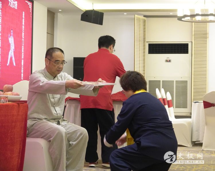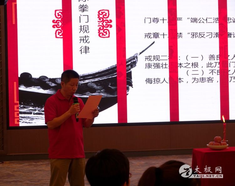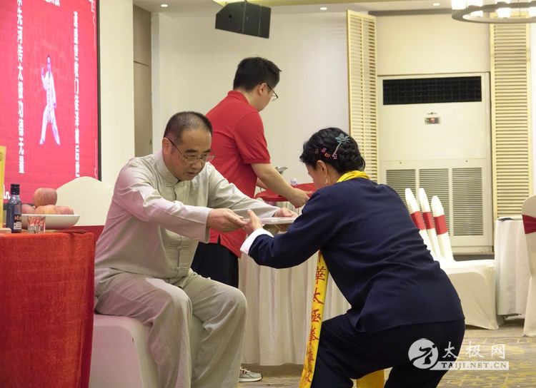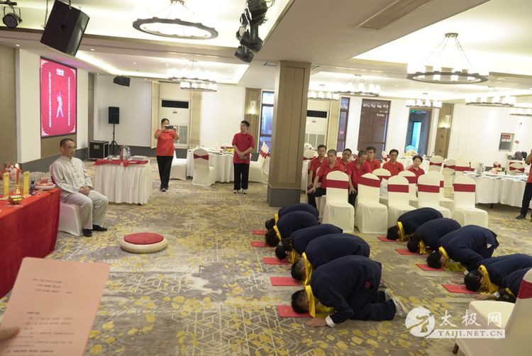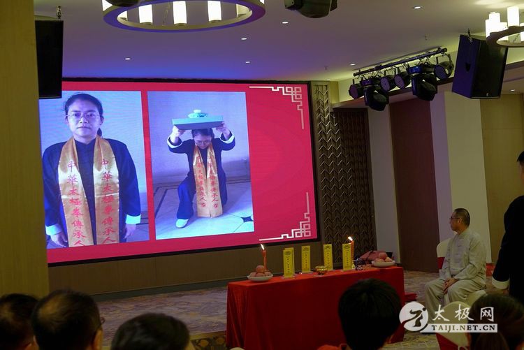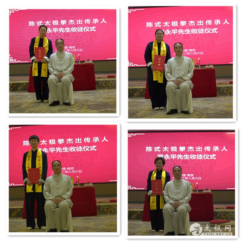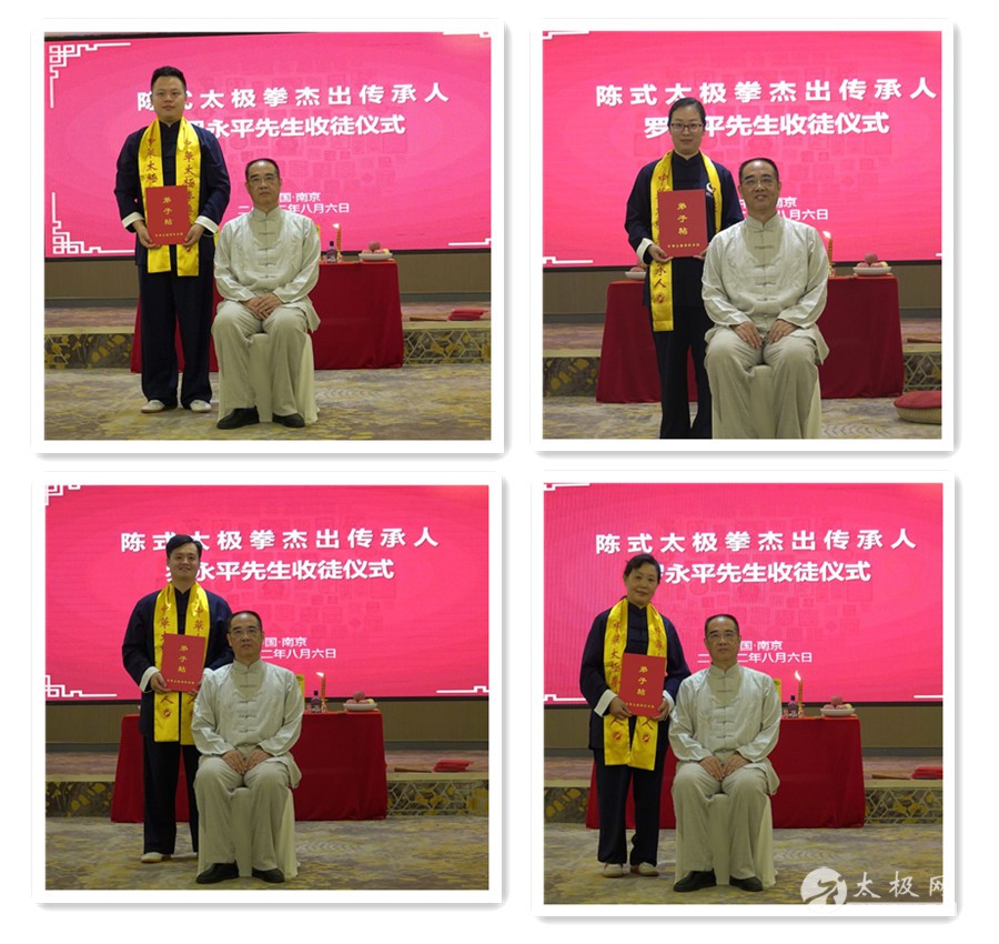 新入门弟子和递贴弟子依次向师父罗永平先生敬茶 新入门弟子李娜身在成都,因疫情无法到宁,但李娜拜师虔诚,经弟子理事会研究,同意李娜以视频方式拜师敬茶。 罗永平先生为新入门弟子回赠礼物 回赠一本书,希望读书明拳理,学明白拳,学文化拳,不练糊涂拳 回赠一套练功服,希望勤练不辍,身穿练功服,练好罗架拳 回赠一本弟子贴,师徒关系书面合约,见证和延续一段机缘 然后,罗永平先生率新弟子祭拜陈式太极拳师祖。背景墙出现五位师祖像,罗永平先生点火焚三柱香,洒三杯酒于地,向陈式太极拳祖先陈王廷、陈长兴、陈发科、顾留馨、徐忠琦祭拜。 罗永平持香在前,高声道:“众位师祖在上,本门弟子、第十二代传承人罗永平率众弟子祭拜祈告,今新入门弟子10位、递贴弟子一位为第十三代传承人,望师祖们允纳,并庇佑他们艺成功就。”