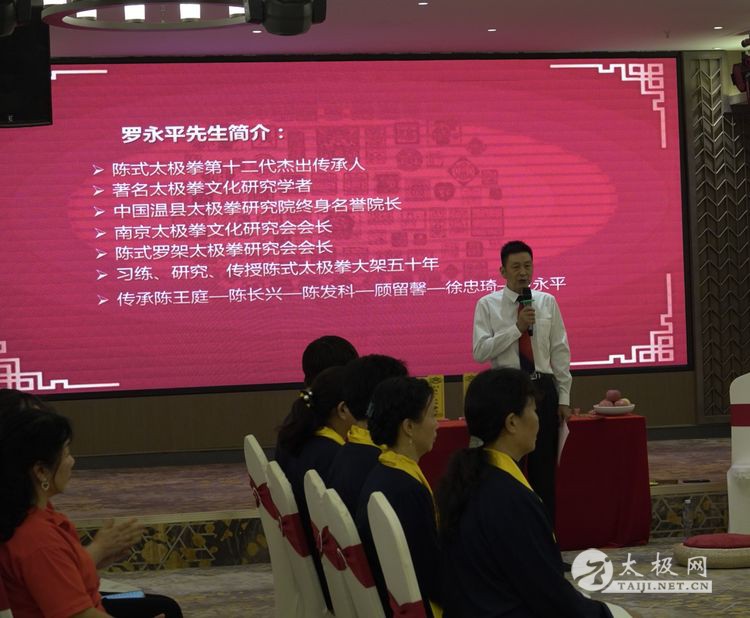 古都南京龙盘虎踞,钟山秦淮人文荟萃。在全国人民同心同力抗击新冠疫情期间,太极拳以其特有的功效为增强人们免疫力发挥了良好作用。越来越多的人爱上太极拳运动。2022年8月6日下午,著名陈式太极拳师罗永平先生第七期收徒仪式在南京隆重举行。收徒仪式由陈式罗架太极拳研究会秘书长黄振平主持。 罗永平先生为陈式太极拳第十二代杰出传承人,传承脉系为陈王廷......陈长兴——陈发科——顾留馨——徐忠琦——罗永平,习练、研究、传授陈式太极拳大架已整整50年,是著名太极拳文化研究学者,任南京太极拳文化研究会会长,陈式罗架太极拳研究会会长,并被中国温县太极拳研究院聘为终身名誉院长。 受邀出席仪式的嘉宾有著名拳师蒋宏生先生、陈巧玲女士、张宁航先生等。 本次仪式是罗永平第七期收徒仪式,新入门弟子有10名,其中有1名弟子来自成都市,递贴弟子1名。 收徒仪式进入第二项,分别由推荐人介绍新拜师弟子的基本情况和学拳经历。首先由推荐人李晓明介绍梁鹏等新入门弟子的自然情况和学拳经历。 罗永平先生入室弟子李晓明向新入门弟子宣读陈拳门规戒律。 李晓明引领新弟子集体拜师。众拜师新弟子跟随李晓明高声朗诵:我自愿拜罗永平先生为师,传承恩师拳技,传颂恩师师德,恪守门规戒律;谨遵师训,刻苦研习,团结同门,尊师重道;弘扬太极文化,探索太极精义,科学健体强身,为继承发扬陈式罗架太极拳而刻苦努力! 拜师弟子向师父恭行跪拜礼