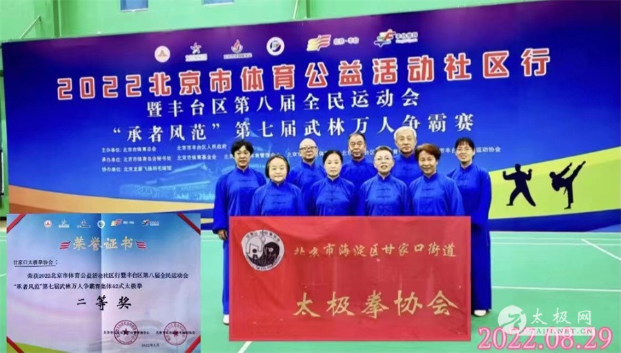 2022年8月29日由秦兰玲会长率领的甘家口地区太极拳协会团队,参加了“北京市体育公益活动社区行”丰台万人争霸赛。荣获团体第二名。 秦兰玲会长与八名参赛队员 八名队员在比赛场上 这次“争霸赛”太极拳只设一个比赛项目,就是囯家竞赛套路42式太极拳,如大家所知,42式太极拳套路严谨,动作规范,基本功技术高。 由一名国家一级社会体育指导员、三名二级指导员和4名拳友组成8人团队,经过一个多月的学习培训,因其良好的“精、气、神”,规范的动作,舒展大方的行拳走架,整齐划一的展示,获得大赛裁判的积极肯定,在十九支42式太极拳参赛队伍,获得第二名。 这也是甘家口地区太极拳协会成立以来第一次参加“万人争霸赛”。 作者:姚恒田 责编:申烜臣 |
