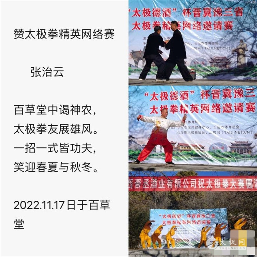 “太极德酒” 晋冀豫三省太极拳精英网络邀请赛启动仪式于2022年11月17日在始祖百草堂正式开幕,此次活动由长治市体育局主办,长治市全民健身中心、长治市体育总会、太极网承办。 为了庆祝二十大胜利闭幕,提倡全民抗疫,提高全民素质,本着“练太极、抗疫情”全民健身的宗旨。此次大赛共邀请了三省十一个太极协会组织的共同参与:山西省长治市太极拳协会、山西省运城市太极拳协会、山西省晋城市武术协会、山西省临汾市杨氏太极拳协会、河北省邯郸市太极拳运动促进会、河北省邯郸市陈式太极拳专业委员会、河北省曲州县太极拳协会、河北省石家庄市鹿泉区太极拳协会、河北省正定县尚泽内家拳法研究会、河南陈照森太极拳研究会、河南省驻马店泌阳罗汉山翟文胜太极研修院。 为期一个月的赛期,涉及参赛项目约2000项,不限年龄,不分场地,采取线上评分+线上点赞的综合成绩,评出个人一二三等奖,团体一二等奖。我市将根据大赛组委会评出的成绩,位于前茅的选手颁发一二三等奖的个人与团体奖项。让各路拳友汇聚在网络,赛出风格,赛出水平,更好的展示的太极拳魅力所在,影响更多的爱好者参与。 晋承酒业董事长韩满军、十万甘泉水杜社广总经理最后预祝晋冀豫三省太极拳精英网络邀请赛圆满成功!也祝愿各路运动员赛出优异的成绩,祝各位领导、各位来宾、各位拳友们身体健康、阖家幸福、工作顺利! 本次特邀嘉宾名长治市太极拳协会顾问张治云、长治市太极拳协会名誉主席李耀武、始祖百草堂养生园董事长管建平、北京醉美乐和印象文化传媒有限公司董事长崔保国、长治市人文饭店合伙人邢晋盈、山西晋承酒业董事长韩满军、乐汤汗蒸生活馆总经理王瑞锋、藏红花长治种植基地总经理陈杰、长治市摄影家协会副主席李建华、山西德慈健康管理有限公司董事长杜社广、舒尔登鞋业有限公司总经理李福生、长治市太极协会名誉会长于承宏、长治市太极拳协会执行会长于亮。 太极拳节目展演: 1.潞泽太极拳辅导站表演:简化24式太极拳 2.滨河公园辅导站表演:42太极剑 3.健身养生协会表演:健身气功大舞 4.隆重推出由名誉会长于承宏和郭洪波表演太极推手 5.复兴小区太极拳辅导站表演:陈式太极拳 6.24节气养身小队表演:八法五步 7.康逸苑小区太极拳辅导站表演:陈式太极拳30式 7.个人表演自愿: 桑慧芬表演陈式太极扇 彭庆明表演杨氏太极拳 长治市合唱团协会会员前来助兴 直接扫描下方二维码可在线报名: |