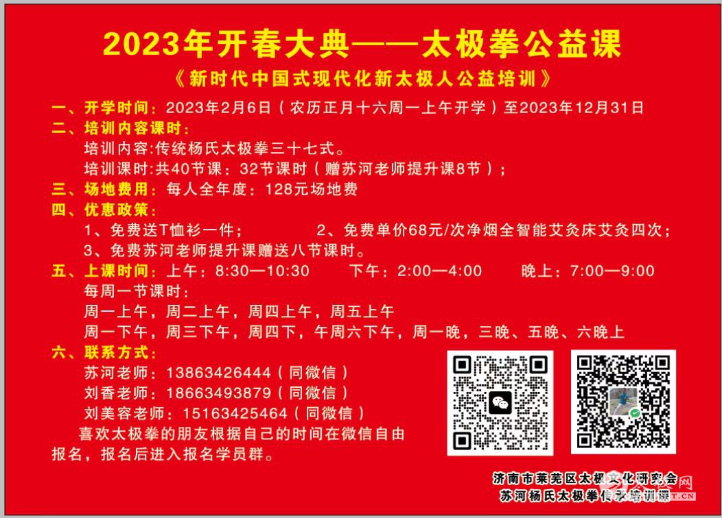 济南市莱芜区太极文化研究会、苏河杨氏太极拳传承培训中心推出《新时代中国式现代化新太极人公益培训》年度公益课。 二十大指出推进健康中国建设“把保障人民健康放在优先发展的战略位置,完善人民健康促进政策,人民健康是现代化最重要的指标。”研究会及培训中心本着与时俱新,与时俱进,文化自信,文化传承,让更多人实现健康快乐太极梦想,通过太极文化普及,太极拳推广长期锻炼强身健体,提高免疫力,抵抗一切突变疫情来袭,确保全民健康状况持续改善,健康获得感持续增强,全民健康是一切资本,全民健康成为人民幸福生活的基础。健康支撑带动财富,财富延续转化健康,享受新时代中国式现代化新生活,必须有一个健康的体魄,为推进健康中国建设筑牢健康之基——传承中国太极文化,济南市莱芜区太极文化研究会尽绵薄之力。 公益培训具体事宜: 一、开学时间: 2023年2月6日(农历正月十六周一上午开学)至2023年12月31日 二、培训内容课时: 培训内容:传统杨氏太极拳三十七式。 培训课时:共40节课,32节课时(赠苏河老师提升课8节); 三、场地费用: 每人全年度:128元场地费 四、优惠政策: 1、免费送T恤衫一件; 2、免费单价68元/次净烟全智能艾灸床艾灸四次; 3、免费苏河老师提升课赠送八节课时。 五、上课时间: 上午:8:30—10:30 下午:2:00—4:00 晚上:7:00—9:00 每周一节课时: 周一上午,周二上午,周四上午,周五上午 周一下午,周三下午,周四下,午周六下午,周一晚,三晚、五晚、六晚上 教练团队教师任课: 七、联系方式: 苏河老师:13863426444(同微信) 刘香老师:18663493879(同微信) 刘美容老师:15163425464(同微信) 八、喜欢太极拳的朋友根据自己的时间在微信自由报名,报名后进入报名学员群。 |