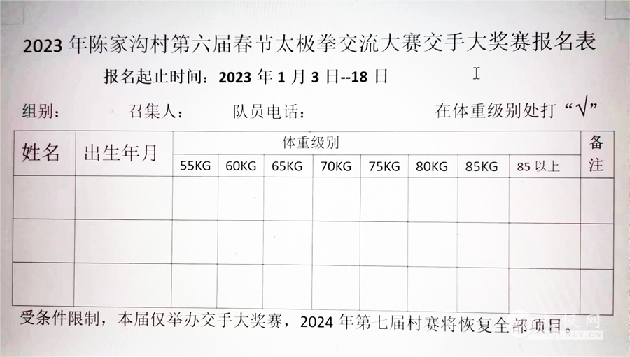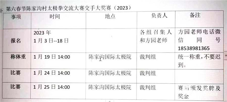 因准备时间有限,2023年春节第六届陈家沟村赛将仅举办“松泉杯”男子太极交手擂台大奖赛,其他项目将在第七届全面恢复。 报名级别:55KG、 60KG、65KG、70KG、75KG、80KG、85KG、85KG以上。 竞赛规则:延用前四届村赛规则。 特别规定: 一)采用单败淘汰赛,每局净时间2分钟,以两局得分多少判胜负。 二)级别赛:每胜一场,奖金300元。 三)各级别第一名将获冠军奖1000元。 四)总决赛:分70KG以下轻量级和75KG以上重量级两个级别。 五)轻量级70KG以下各级别冠军抽签对阵,重量级75KG以上各级别冠军抽签对阵,胜一场500元。 六)最终获得轻量级冠军和重量级冠军者将各奖金3000元。 七)每级别报名人数若达不到四人,本级别队员将并入上一级别参赛。85+级别若人数不足则并入下一个级别。凡因弃权而胜者,奖金为100元。 八)赛场为6米直径圆形场地。 九)报名起始至截止日期为2023年1月3日起2023年1月18日止。 十)称体重时间2023年1月19日下午14:00于陈家沟国际太极院办公室。 十一)比赛日期为2023年1月24-25日每天下午14:00开战。 十二)报名资格范围仅限村赛规定的1--15组。 组别划分说明如下: 1--10组为陈家沟村内的十个生产队组成。 11组为辛堂队。 12组为陈新庄和留村联队。 13组为陈家沟村西队,包括刘圪垱、徐沟、冉沟、杨沟、卫沟、朱家庄、南张羌、北张羌8个村庄。 14组为陈家沟村东队,包括西马村、中马村、东马村、南平皋、东平滩、军地滩、汜水滩、赵堡村8个村庄。 15组为陈家沟外迁居民队。 16组为陈家沟拳师海外入门弟子队。 报名规定: 1,运动员年龄限制为17-45岁。 2,报名者以拍照微信发送或复印件形式向组委会提交身份证或户口本。 3,运动员必须提交身份证复印件、人身意外保险复印件。 4,凡登记参赛的运动员,必须尊敬裁判员、尊重对手,服从大会规定、遵守大会纪律。 5.未尽事宜,再做通知。 报名电话:方园老师18538981365(微信同号) 本站责编:申烜臣 |