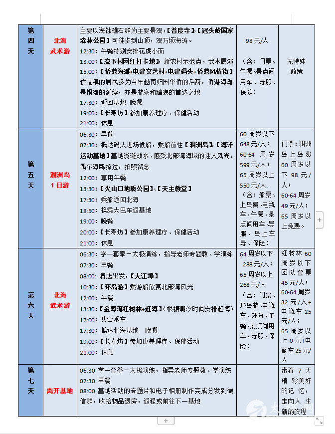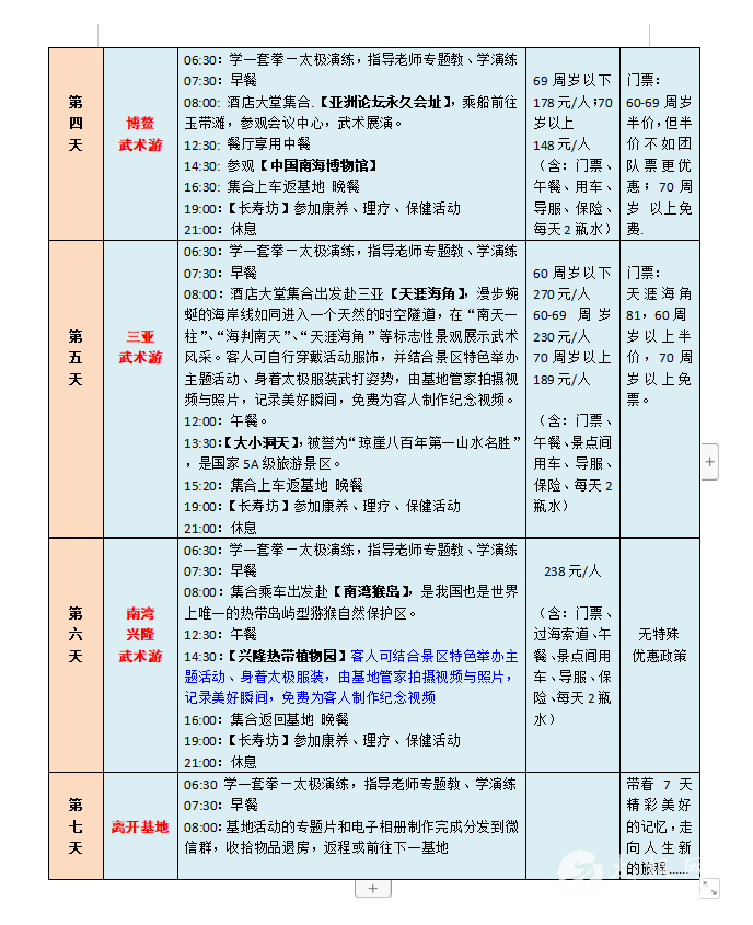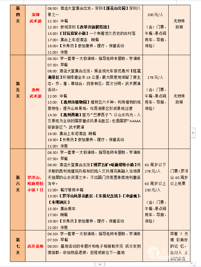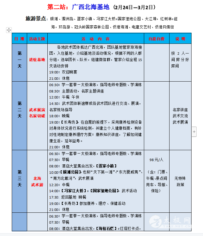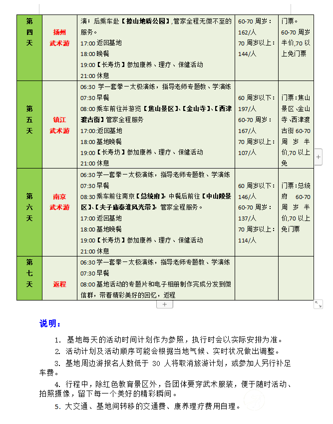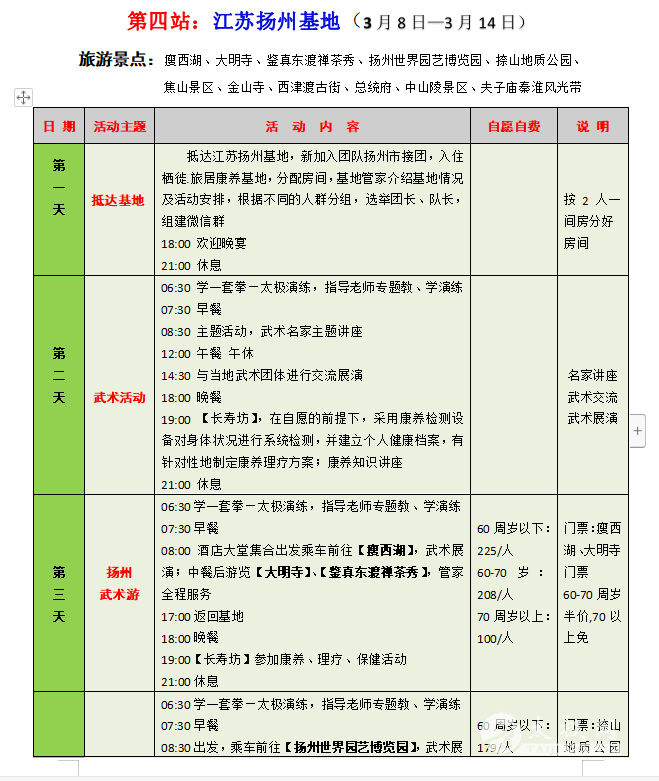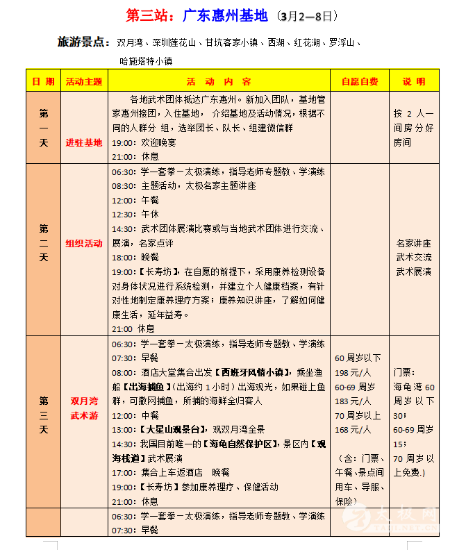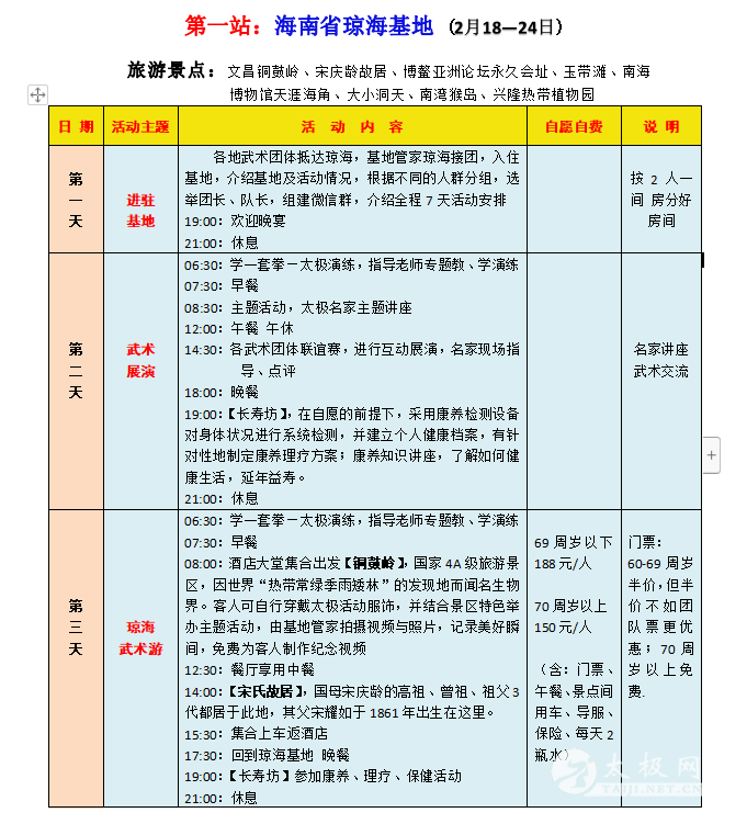 一、活动主题 新春之际,疫散花开,全国武林豪杰们压抑了三年的活动热情迅然爆发!为弘扬中华武术文化,加强各地武术文化交流,太极网与盛世方舟文旅集团合作开展以武术太极拳交流为主题的全国各地拳友组团旅居巡游活动,依托遍布全国的栖徙.旅居康养基地由南向北逐渐展开,第一期2023年2月18日从海南开始,依托海南、北海、广州、扬州四个基地,以“武术表演+比赛联谊+红色旅游+健身康养”为主要内容,在各基地和旅游景区的优美环境中联谊交流,展示武术风采,开启身心康养之旅。 二、活动组织 主办方:太极网 承办方:盛世方舟文旅集团 协办方:海南、广西、广东、江苏等地旅游主管部门、各省(市)武术协会组织、中国异地养老网 接待方:海南、北海、惠州、扬州四个栖徙.旅居康养基地 三、活动时间 2023年2月18日—3月14日,四个基地,每个基地活动7天,全程共25天时间。各地武术团体既可以全程参加,也可以选择参加其中的1-2个基地,随时加入、随时退出,自由灵活。其中: 第一站:海南琼海基地(五星级) 2月18—24日 第二站:广西北海基地(四星级) 2月24—3月2日 第三站:广东惠州基地(四星级) 3月2—8日 第四站:江苏扬州基地(五星级) 3月8日—3月14日 四、活动内容 1.联谊:全国各地武术爱好者齐聚一堂,以武会友,广交朋友。 2.比赛:在基地举行武术友谊赛,颁发奖品和证书,媒体宣传报导。 3.讲座:邀请武术名家,讲授武术技巧和功法,助推武术传承。 4.旅游:在每个基地有3-4天的周边旅游活动计划,参观当地最知名的旅游景区、红色旅游教育基地、博物馆、人文风情、自然风光,轻松慢游。在旅游景区的如画美景中,会员和团队随时拍摄展示武术风采的视频及图片,赋予旅游文艺气息和文化内涵。 5.康养:针对会员不同身体状况,如三高、糖尿病、风湿骨痛、肥胖、各种慢性病等,提供康养理疗设备、功能性食品、民族验方、药膳等,达到明显身体调理效果。 6.民俗体验:深度体验当地民俗文化,参加民俗活动,感受民族风情。 7.视频随拍:武术展演的全程活动都有管家视频随拍,制作成专题纪录片和电子相册,每人赠送一份。 五、我们与众不同—— 以武会友,展演联谊—— 主题活动丰富多彩 高标旅居,精致服务—— 享受旅居幸福时光 品质第一,安心开心—— 坚决避免传统旅游的低价陷阱 天下美景,处处有家—— 全国基地开心巡游,不负精彩人生 六、费用标准 栖徙.旅居康养基地功能齐全、设施高档,北海、惠州是四星级酒店、 海南、扬州是五星级酒店,但费用却很“平民”,正可谓“高星级的服务,农家院的价格”。 海南、扬州基地(五星级):每个基地7天费用 1580元/人 北海、惠州基地(四星级):每个基地7天费用 1360元/人 费用包含:基地所在城市落地接送、管家服务、用餐、比赛奖品、基础保健、主题讲座、活动视频拍摄、保险等,每间房住2人。 七、自愿自费项目 1. 往返大交通、基地间交通:往返大交通可自行解决或由旅居管家协助安排;基地间交通由管家统一安排,费用按人均摊。 2. 旅游:根据各基地每天的旅游计划,自愿选购参加。 3. 康养理疗:结合自身健康状况,自愿选购。 八、活动组委会 顾 问:原福全 原温县体育局局长 主 任:刘洪奇 太极网创始人 副主任:项争鸣 承德市武术协会主席,马虹弟子 苏 郁 承德市武术协会副主席 王臻舟 承德市武术协会副主席,盛世方舟文旅集团董事长 秦开众 中国异地养老网创始人 九、活动组委会报名咨询电话 赵金慧:13363141623 李栋俊:15725272871 2023栖徙旅居·太极文旅康养活动安排详情表: |
