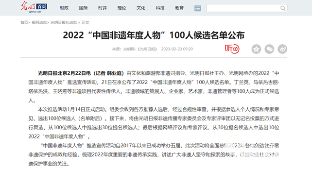 由文化和旅游部非遗司指导、光明日报社主办、光明网承办的2022“中国非遗年度人物”推选宣传活动,21日在京公布了2022“中国非遗年度人物”100人候选名单。丁兰英、马依热古丽·塔依热洪、王晓燕等非遗项目代表性传承人,非遗领域的策展人、企业家、艺术家,非遗管理者等100人成为正式候选人。 国家级非物质文化遗产代表性项目太极拳(陈氏太极拳)省级代表性传承人陈炳入选该名单。陈炳,1971 年出生于太极拳名门世家,太极拳发源地温县陈家沟人,陈氏太极拳第十二代嫡宗传人,现任陈家沟太极拳协会会长、陈家沟国际太极院院长、中国非遗协会太极拳专业委员会副主任。 据《光明日报》消息,本次推选活动1月14日正式启动。组委会收到各方推荐人选后,经过合规性审查,并根据参选人个人情况和专家意见,选出100位候选人(名单附后)。接下来,将由光明日报非遗传播专家委员会及专家评审团以无记名投票的方式进行复选,从100位候选人中推选出30位提名候选人;最后根据网络评议和专家评议,从30位提名候选人中选出10位2022“中国非遗年度人物”。 “中国非遗年度人物”推选宣传活动自2017年以来已成功举办五届。此次活动将全面总结2022年各地创造性开展非遗保护的成效和经验,梳理2022年度重要的非遗传承实践,讲述广大非遗人坚守和探索的故事,以推动全社会对非遗保护事业的关注。 来源:光明网 本站责编:申烜臣 |