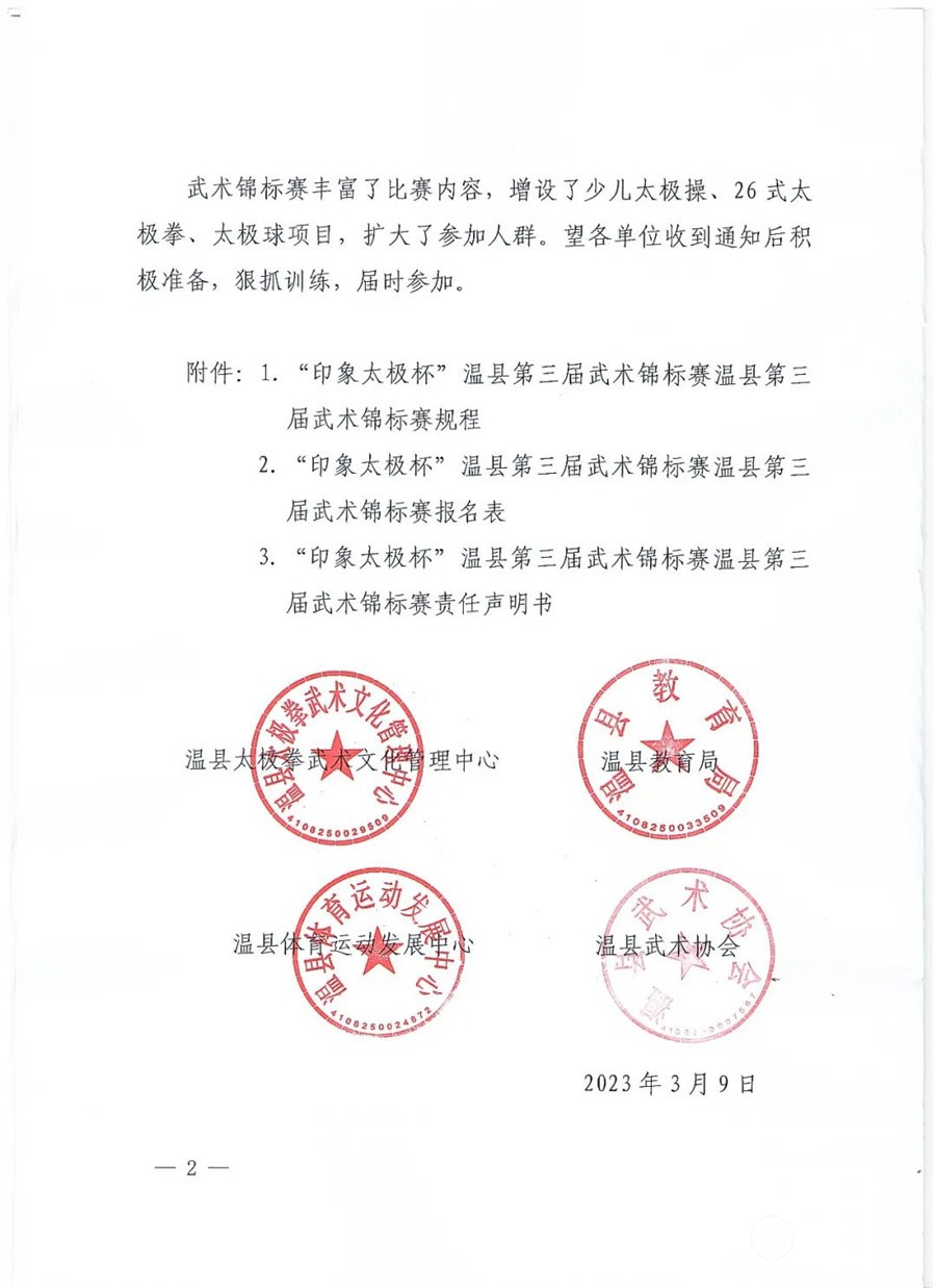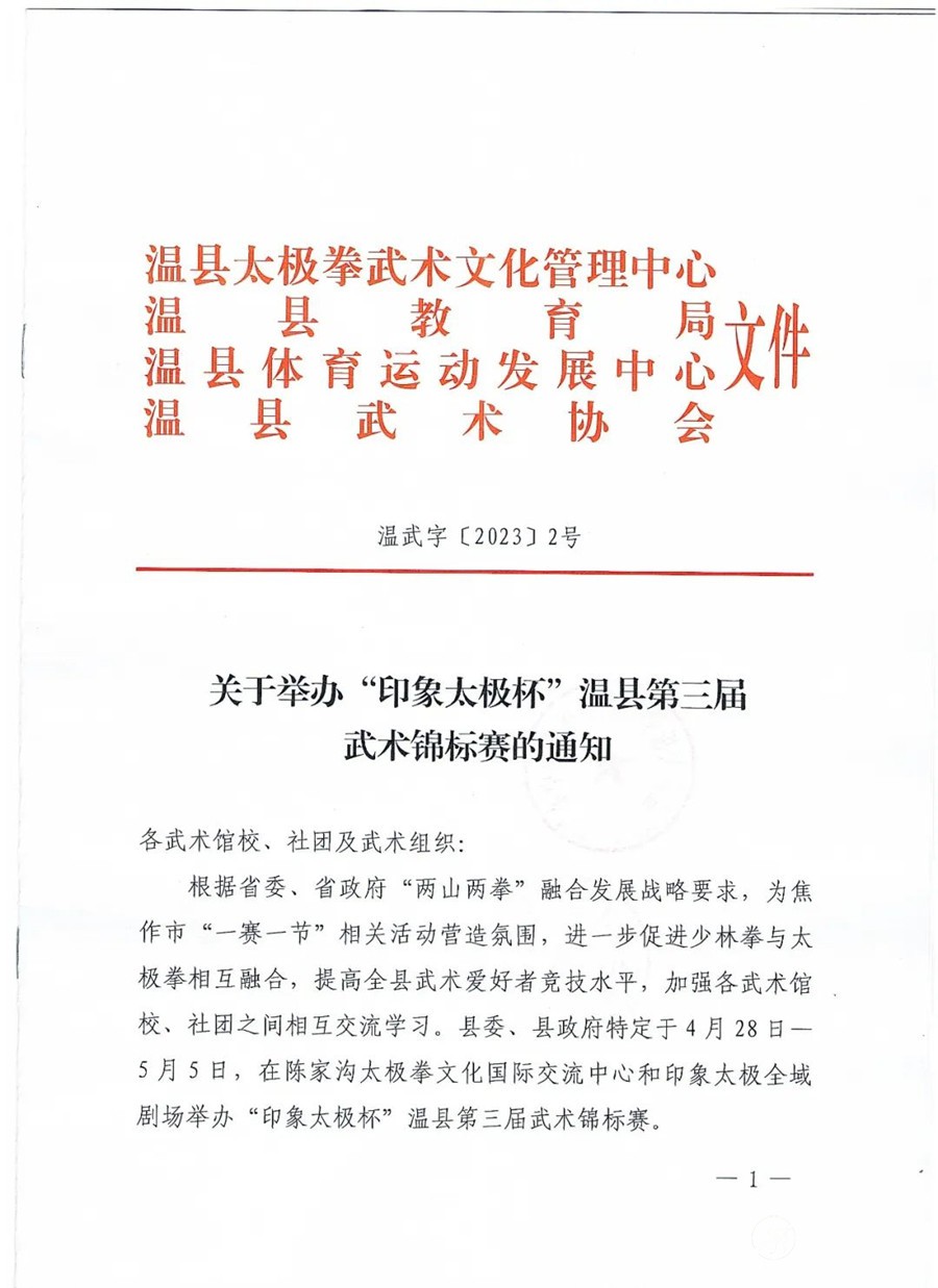“印象太极杯”温县第三届武术锦标赛 一、比赛时间 二、比赛地点 武术套路:陈家沟太极拳国际文化交流中心 三、主办单位 四、承办单位 温县太极拳武术文化管理中心 温县教育局 温县体育运动发展中心 五、协办单位 河南省知行太极文化旅游有限公司 六、参加单位 七、比赛项目 (一)太极拳比赛项目 1. 太极拳、械传统项目 (1)各式太极拳:陈式、杨式、武式、吴式、孙式、和式、26式太极拳、陈式小架、忽雷架任选一项; (2)太极短器械:传统刀术、剑术套路、太极球任选一项; (3)太极长器械:传统枪术、棍术、春秋大刀任选一项;(儿童组限报) 2. 太极拳规定项目 陈式、杨式、武式、孙式、吴式规定太极拳、42式太极拳、42式太极剑、24式太极拳任选一项; 3. 太极拳对练项目 徒手与徒手、器械与器械、徒手与器械项目任选一项。 (二)少林拳比赛项目 1. 传统拳术:简化少林拳、七星拳、通臂拳、罗汉拳、大洪拳、小洪拳任选一项; 2. 传统器械:少林单刀、阴手棍、少林单剑、少林十三枪等任选一项; 3. 少林拳对练项目 徒手与徒手、器械与器械、徒手与器械项目任选一项。 (三)推手比赛项目 1. 推手比赛运动员年龄16—45周岁(1978年1月1日—2007年12月31日); 2. 推手比赛设男子组60公斤级(≤60Kg)、70公斤级(≤70Kg)、80公斤级(≤80Kg)、80公斤以上级四个级别。设女子组无差级一个组别。 (四)集体项目 1. 每队限报一项,拳、械内容不限,必须配乐(自备CD音乐盘、U盘,无歌词说唱),按类别分为拳术类、器械类、拳械混编类划分。 2. 单设少儿太极操集体项目,配口令音乐不予扣分。 (五)年龄分组 1. 太极拳、少林拳、对练、集体比赛项目分组 (1)儿童组(A组):12岁以下(2011年1月1日之后出生) (2)少年组(B组):12岁至17周岁(2006年1月1日-2010年12月31日) (3)青年组(C组):18岁至39岁(1984年1月1日-2005年12月31日) (4)成年组(D组):40岁至59岁(1964年1月1日-1983年12月31日) (5)老年组(E组):60岁以上(1963年12月31日前) (6)集体项目:不分年龄组别 八、参加办法 (一)太极拳、少林拳、对练、集体项目参加办法 1.每单位可派领队1人,教练1人,随行医生1人,运动员人数不限,男女不限; 2.拳术、器械每一个单项不足8人时,均编入相邻组别。 (二)推手比赛项目参加办法 1.每队可报领队1人,教练1人,随队医生1人,运动员人数不限。 九、竞赛办法 (一)太极拳、少林拳、对练、集体项目竞赛办法 1.本次比赛分武术套路、太极推手两个大项比赛,每项比赛计算积分,设比赛团体积分奖励; 2.本次比赛遵循中国武术协会审定的(2012)《武术套路竞赛规则与裁判法》及有关补充规定; 3.太极拳类项目 (1)太极拳、械传统套路必须具有传统风格特点的技术动作为基本内容的套路形式,演练中掺杂有太极拳、械竞赛套路内容不予评分。 (2)规定项目中陈式、杨式、吴式、武式、孙式、42式太极拳、42式太极剑、24式太极拳和32式太极剑,分别采用中国武术研究院编印的《太极拳竞赛套路》、《四式太极拳竞赛套路》、1996年编印的《武式太极拳竞赛套路》和1991年编印的《太极剑竞赛套路》。 (3)传统太极拳演练时间3-4分钟(运动员演练至3分钟时,裁判长鸣哨提示); (4)规定项目必须按照规定套路顺序演练,不得增减和改变动作。每增减一个动作或每改变动作一次,均扣0.1分,累计扣分。裁判长吹哨之后的剩余套路未完成不予扣分。 (5)传统太极剑和42式太极剑演练时间3-4分钟(运动员演练至3分钟时,裁判长鸣哨提示); (6)太极单刀演练时间不少于1分钟(运动员演练至1分钟时,裁判长鸣哨提示); (7)其它器械和对练套路演练时间2—3分钟(运动员演练至2分钟时,裁判长鸣哨提示)。 4.少林拳类项目 (1)少林拳传统项目必须具有传统性,充分体现少林拳的风格特点,不得改变动作。 (2)少林拳传统拳术、器械、对练项目演练时间不超过2分钟。 (3)少林拳集体项目演练时间不少于1分钟。 5.其它 (1)比赛按照各项目运动员比赛顺序,每2~6名运动员一组,同场比赛,分别评分。 (2)集体项目应具观赏性,有主题,有创意,具有较高的审美价值;演练时间不少于4分钟,每队6-12人,男女不限,不足6人,每少1人由裁判长扣0.5分。 少儿太极操按动作要求熟练完成,不作时间限制,每队不少于12人。 (3)运动员的参赛服装不作规定,但要体现出民族特色、项目特色、运动特色和时代特色。 (二)推手比赛项目竞赛办法 1.比赛采用单败淘汰制; 十、录取名次与奖励 (一)太极拳、少林拳、对练、集体项目名次录取与奖励 1.儿童组、少年组、青年组、成年组、老年组各单项男、女均分别录取前8名,颁发获奖证书,按9、7、6、5、4、3、2、1计分。 2.对练项目录取前6名(不足6队减一录取),颁发获奖证书,按7、5、4、3、2、1计分。 3.集体项目录取前6名(不足6队减一录取),颁发奖匾,按7、5、4、3、2、1计分; 4.少儿太极操集体项目单独录取前6名,本次比赛不参与团体积分。 (二)推手项目名次录取与奖励 推手比赛每个级别按实际参赛人数录取名次。该级别运动员在12人以上的录取前8名,不足12人的组别减一录取,颁发获奖证书;冠亚季军分别奖励人民币3000元、2000元、1000元;按9、7、6、5、4、3、2、1计分。 (三)团体代表队名次录取与奖励 1.设套路比赛团体总积分奖,按实际参赛队每单项积分计算,团体总分从高往低降序,团体第一名单位奖励价值5000元训练器材,第二名奖励价值3000元训练器材,第三名奖励