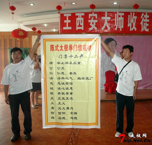 俗话说:国有国法,家有家规,作为王西安大师的入室弟子,也必须遵守陈式太极拳门规。仪式上,主持人特为两人宣读门规戒律和太极拳门规师训。