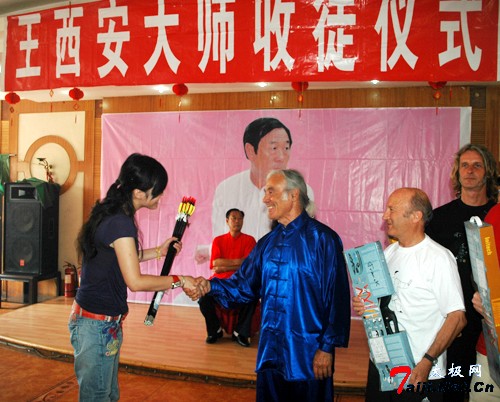 [page]  王西安大师创办的陈家沟武术学院多年来接纳来自世界各地30多个国家的太极拳爱好者,他们在此刻苦学艺,研究拳理,与学校和老师结下了深厚的友谊。在仪式的现场,来自法国王西安拳法研究会法国分会会长勾丁那.阿兰,副会长菲立普先生及分会会员也将为曾经培育过他们的陈家沟武术学院赠送弓箭,陈家沟武术学院也回赠他们锦旗一面,希望真诚永远,友谊长存!同时,国内的各地分会也纷纷互赠礼品,进行友好交流。