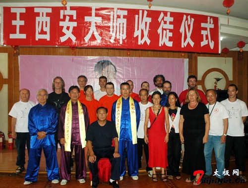 这天上午,来自王西安拳法研究会法国分会、意大利分会以及韩国、澳地利等国的太极拳爱好者朋友欢聚一堂,共同参加王西安大师的收徒仪式。温县体育局负责人,温县红棉鞋业集团顾问、原体育局局长原福全等也到会祝贺。