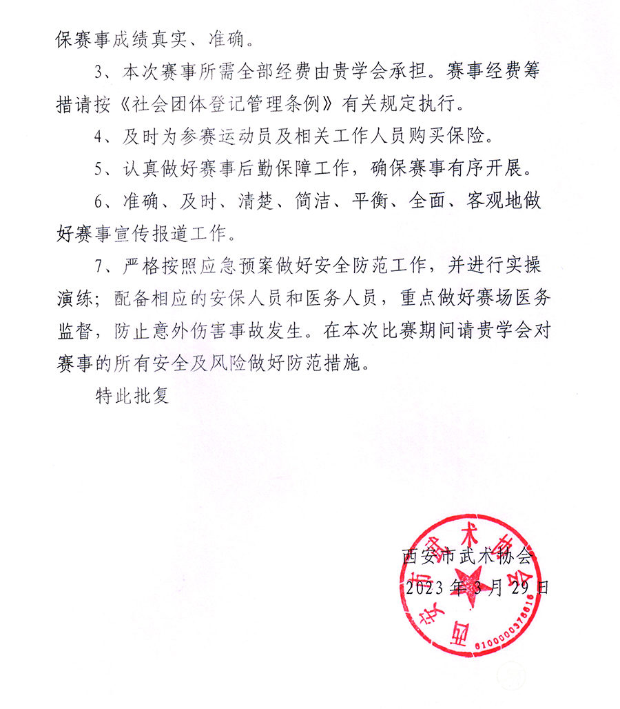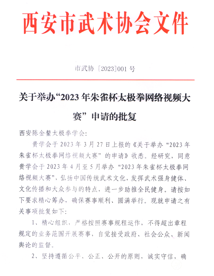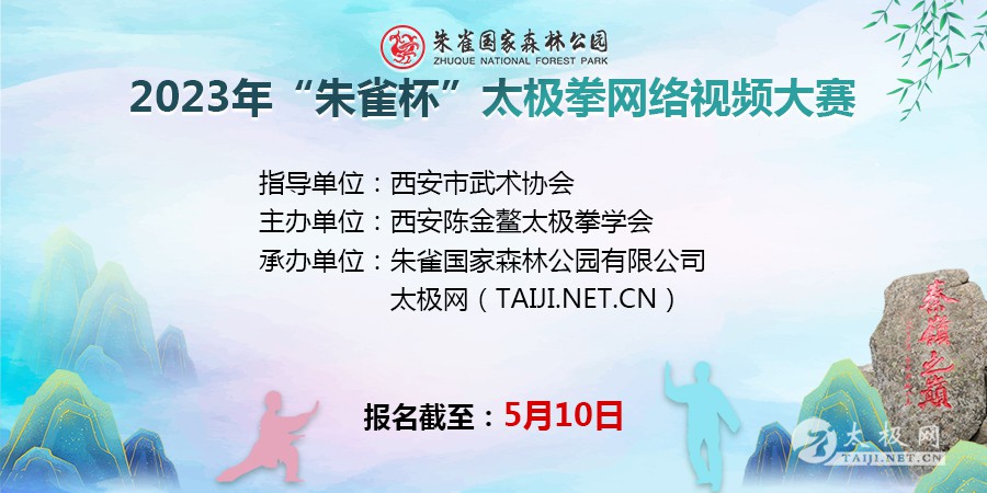 为传承推广太极拳贡献力量,扩大太极拳的民生影响力,冬去春来,疫情散去,正值秦岭山脉,花开灿烂时节,让太极拳与秦岭山相约,2023年,“朱雀杯”网络视频大赛,在西安市武术协会的指导下,西安陈金鳌太极拳学会、太极网、西安朱雀国家森林公园,共同发力,让太极拳传承事业扬帆起航,弘扬太极正能量。 大赛组委会成员名单 大赛组委会主任:刘永强 大赛组委会副主任: 张勇刚、刘洪奇、关宇涛、李 超、 马文国、高建武、王建民、毛尔建、 李尔荣、职胜奇、赵学法、于 东、 惠合同、兴 隆、余郅铖、职永成、 雒春慧、唐志典、李 刚、肖均寿、 杨晓瑜、张 斌、刘波涛、董曙光、 解腾飞。 大赛组委会委员: 王亚利、易 凯、李飞龙、张占飞、 陈 增、姬有斌、杨博龙、赵国祥、 张纪伟、李维民、张鼎贵、汤红艳、 贺晓清、宋群群、刘 巍、温 健、 段普发、高 庞、段 鹏、刘 波、 刘保欢、张光辉、杨广德、傅乃斌、 别发民、赵红安、陈静君、张碧海、 贾国升、金留根、杨俊峰、梁秦岭、 刘根福、张卫东、党淑静、王新华、 李 卓、彭龙贵、魏 强、程 潇。 大赛组委会仲裁主任:赵幼斌。 大赛组委会裁判长:韩俊霞。 2023年首届“朱雀杯”太极拳网络视频大赛 竞赛规程 一、活动组织 指导单位:西安市武术协会 主办单位:西安陈金鳌太极拳学会 承办单位:西安朱雀国家森林公园、太极网(TAIJI.NET.CN) 支持单位:西安市各武术场馆 二、活动时间 赛事由报名、在线展播及投票、专家评审、颁奖典礼等环节组成。 (一)报名和视频接收:即日起至5月10日,报名后,收到太极网电子版参赛证件,凭电子参赛证,可到朱雀国家森林公园打卡,拍摄视频。 (二)集中展播和网络投票:5月13日至5月17日。 (三)专家评审及成绩公布5月份。 (四)颁奖盛典活动在朱雀国家森林公园举办,日期待定。 三、参赛单位 太极拳爱好者个人及组织均可参赛。既可个人报名,也可组队报名。 四、竞赛项目 1、个人项目: 陈式、杨式、吴式、武式、孙式、和式太极拳等各流派传统套路、国家规定竞赛套路及其他传统武术套路,允许一人参加拳术和器械两项。 2、对练项目: 徒手对练、器械对练(含徒手与器械对练)。 3、集体项目: 集体演练的(每队6至10人)太极拳、太极剑、太极刀、太极扇和其他武术集体编排项目。 4、项目要求: 个人太极拳3至4分钟,器械不超过3分钟。对练项目完成表演时间不超过3分钟。集体拳术及混编时间不超过5分钟,器械时间不超过4分钟。 五、评审规则及办法 (一)采用中国武术协会印制的最新版《传统武术套路竞赛规则》及有关规定。 (二)评分要素:评审标准包含技术分100分(裁判评审)、人气分10分(网络投票),按总分统计结果,按比例评选出各奖项。 (三)年龄分组 儿童组:12岁及以下; 少年组:13岁至17岁; 青年组:18岁至39岁; 中年组:40岁至60岁; 老年组:60岁以上。 六、评选及奖励办法 (一)个人项目:分套路和器械,设置一等奖(按30%比例录取)、二等奖(30%)、三等奖(40%),录取比例按照实际人数采取四舍五入,颁发奖牌、证书。 (二)集体项目:统一组别,设置一等奖(按20%比例录取)、二等奖(40%)、三等奖(40%),颁发证书和奖牌。 (三)最佳人气奖:依据大赛全体同台展播的网络投票结果,“最佳人气奖”个人录取总票数排名前3人,集体项目票数排名第1名颁发“最佳人气团队”。 (四)特别奖项:对表现突出的个人和集体设置“优秀教练员”“优秀领队奖”“最佳组织奖”等。 七、参赛视频要求 (一)参赛作品要求为参赛者本人近期演练的视频影像。 (二)视频要求清晰流畅,图像稳定。参赛视频质量差或不符合标准的,谢绝参赛,报名费不退。参赛作品一经提交发布,更换或更改参赛视频费用为100元/项。 (三)因赛事标准统一和宣传,组委会有权对参赛视频进行剪辑并添加片头片尾,同时对不符合要求的视频片头片尾进行修改调整。 (四)凡有悖社会公德或含有违反相关法律规定的图文影像将被取消参赛资格;画面禁止包含他人权利的商标标识、商业招牌、广告植入等。 (五)参赛者提供的视频版权、肖像权自负,主办方、承办方不承担因参赛作品导致的包括但不限于肖像权、名誉权、隐私权、著作权、商标权等纠纷而产生的法律责任。 八、报名及视频提交办法 (一)推荐扫描下方二维码直接在线报名,按平台提示要求操作即可。 (二)1. 联系组委会获取电子参赛证前往西安朱雀国家森林公园拍摄参赛视频;2. 参赛人员也可就近录制视频。视频文件发送至组委会。文件命名格式应标准,例:李XX + XX分站 + 42式太极拳。 (三)QQ/邮箱传送:811178358;或上传至云盘联系组委会登录下载。 九、展播说明 组委会搭建专属大赛展播投票平台,微信端即可互动交流。太极网及微信矩阵、大拳师赛事APP等平台活跃粉丝千万级,均设置大赛专题展播栏目,并在其他各大视频网站发布传播。 十、参赛费用说明 1. 个人项目:参赛及评审费为100元/项,一人可报多项。 2.对练项目:参赛及评审费为150元/项,每队可报多项。 3. 集体项目:参赛及评审费200元/项,每队可报多项。 4. 汇款方法:通过在线系统报名可直接缴费,或与组委会办公室联系确认。 十一、联系方式: 1.大会联系人: 大会策划人:张勇刚 139-9188-3986 大会联系人:王亚利 153-0921-8505 2.太极网: 田 丽 177-0391-6070 李 宁 177-9668-5993 邓豪杰 130-0765-9881 杨 超 152-3915-0487 郭