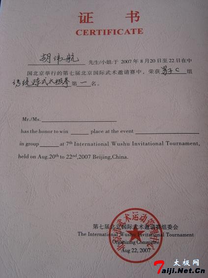 07年8月陈照奎拳社第七届北京国际武术邀请赛获奖