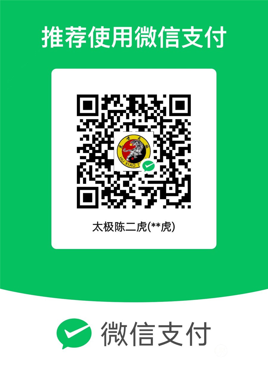 培训对象: 喜欢太极拳,身体健康,无传染性疾病的广大太极拳爱好者及全体虎啸会员。 培训时间: 2023年5月2日至6日。 培训地点: 河南温县太极武术馆(黄河路272号)。 收费标准: 优惠福利: 1. 所有陈二虎老师粉丝1980元/人; 2. 抖音购买过陈二虎老师课件及全国虎啸太极会员的1280元/人; 3.抖音购买过陈二虎老师入门弟子课的598元/人; 食宿交通费用自理。五一假期房源紧张,住宿学校负责订好房,不需要安排住房的请提前电话告知。 报名及缴费方式: 报名时间: 即日起至2023年4月25日截止,(不接受空降)名额有限,按报名顺序安排,1号报到,2号开始上课。 温县黄河路太极武术馆招生办 联系人:陈先生 手 机:15713911117 13938160007 微信号:hxtj0007 电 话:0391--6188588 开户行:中国银行温县支行 帐 号:6217-9080-0000-6008-038 户 名:职莉萍 微信/支付宝扫码付款