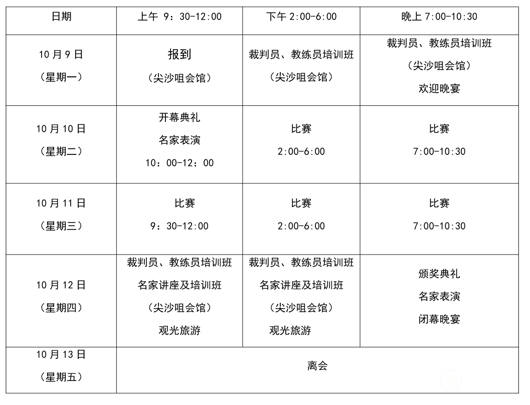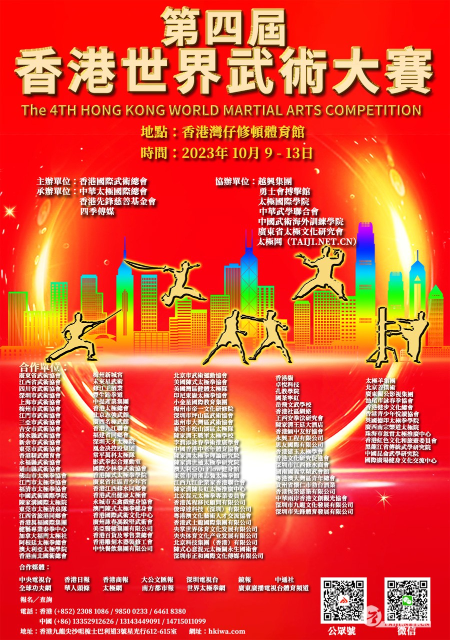 第四届香港世界武术大赛 The 4TH HONG KONG WORLD MARTIAL ARTS COMPETITION 比赛规程 日期:2023年10月9-13日 地点:香港湾仔修顿体育馆 主办单位: 香港国际武术总会 承办单位: 中华太极国际总会 香港先锋慈善基金会 协办单位: 越兴集团 太极网(TAIJI.NET.CN) 勇士会搏击会 太极国际学院 中华武学联合会 中国武术海外训练学院 广东省太极文化研究会 支持单位:排名不分先后 支持媒体: 一、 比赛项目 (一)武术套路(包括各流派的拳术、器械)。 (二)太极套路(陈、杨、吴、武、孙、和、李、武当、八法五步及其他拳术、器械)。 (三)健身气功(五禽戏、六字诀、易筋经、八段锦、马王堆导引术、导引养生功十二法、太极养生杖、大舞等)。 (四)跆拳道比赛项目 (五)精英赛(所有参加者均获发奖杯及奖牌) (六)集体项目(4人或以上) (七)对抗赛(太极推手、咏春黐手、中国式摔跤、跆拳道、泰拳自由搏击等) (八)网络视频赛 二、 培训项目: (一)国家级名家讲座及培训班(人民币1980元\4节) (二)国际武术教练员、裁判员培训班(可同时报考两项,颁发资格证书) 1)初级教练证\裁判证(人民币1980元) 2)中级教练证\裁判证(人民币2980元) 3)高级教练证\裁判证(人民币3980元) 4)2023年6月24-25日(第六期培训班) 5)2023年8月12-13日(第七期培训班) 三、 参加办法 (一)各国家、地区武术协会、社团组织、健身气功组织、大专院校、武术馆校、中老年人体育协会、青少年活动中心、健身俱乐部、中小学、幼儿园、街道社区和武术爱好者均可组队或个人参赛。 (二)参赛队可报领队、教练各1人,运动员男、女人数不限。 (三)每位运动员参加项目数量不限(项目分类表内所有项目均可选择) (四)集体项目要求4人或以上。 (五)参赛人员均须署《安全责任声明》。 (六)报名参赛人员必须办理香港入境签证,费用自理。 (七)网络视频赛要求为参赛者本人近期演练的视频影像,视频要求清晰流畅,图像稳定。 (八)组队超过20人以上参加比赛的单位可以委派一位大赛裁判员(需有裁判资格证)。 四、 竞赛办法 (一)本次比赛为个人单项赛,双人赛、集体项目赛、对抗赛、精英赛。 (二)竞赛规则采用国家体育总局武术运动管理中心审定的《传统武术竞赛办法》、 国家体育总局健身气功管理中心审定的《健身气功交流展示竞赛评分方法与标准》和本规程及各分项目竞赛规程的有关补充规定。 (三)套路竞赛年龄分组: 1. A组 A1组:6岁以下(2017年10月10日以后出生) A2组:6-7岁 A3组:8-9岁 A4组:10-11岁 2. B组 B1组:12-13岁 B2组:14-15岁 B3组:16-17岁 3. C组 C1组:18-24岁 C2组:25-29岁 4. D组 D1组:30-34岁 D2组:35-39岁 D3组:40-44岁 5. E组 E1组:45-49岁 E2组:50-54岁 E3组:55-59岁 6. F组 F1组:60-64岁 F2组:65-69岁 F3组:70-74岁 F4组:75-79岁 F5组:80岁或以上 (四)太极推手赛分学生组和公开组(每个级数按体重计算分组),详细见附件(一)。 (五)网络赛详情见附件(二)。 (六)运动员年龄、健康状况均由各代表队自己审核,以报名表上盖章或签字后确认。 竞赛期间因健康情况而引发的伤病等,均由各单位和个人自行负责,经费自理。参赛运动员请自行办理好"人身意外伤害保险"。报名表见附件(三)。 五、 各项目比赛时间规定 (一)任何单练项目完成套路的时间为40秒至4分钟(不包括健身气功)。太极类演练至3分钟时,由裁判长鸣哨提示(原套路内容较多,可将套路进行删减;凡太极拳竞赛套路、规定套路从起势起至3分钟鸣哨声后即可准备收势,未完成部分可删除,不予扣分。 (二)集体项目完成套路的时间不得超过4分钟。 (三)健身气功项目类的时间(包括个人和集体)不得超过6分钟。 六、 项目配乐规定 集体项目可自行配音乐。 七、 集体项目参赛年龄组别 按报名参赛队员不分年龄,不分性别进行。 八、 服装、器材要求 参赛选手必须穿武术及各类功夫服装参加比赛和表演,服装、器材由参赛选手自备。 赛场设有比赛服饰、鞋、器械可供购买 九、 录取名次 (一)个人项目按组别30%一等奖(金牌);30%二等奖(银牌);40%三等奖(铜牌)。 (二)集体项目按类别30%一等奖(金杯);30%二等奖(银杯);40%三等奖(铜杯)。 (三)精英组录取前1—8名(颁发奖杯及奖牌) (四)所有参赛人员按成绩颁发奖牌和证书。 十、 仲裁委员会和裁判 (一)仲裁委员会人员组成和职责范围按《仲裁委员会条例》执行。 (二)仲裁和裁判由大会组委会统一聘请 十一、 相关费用 收费标准: 1、报名费:人民币 ¥300元/人(领队、教练、运动员和随队观摩人员报名参加大会的所有人员均需缴纳)。 2、项目费: 套路赛:人民币¥300元/项(不限数量) 精英赛:人民币¥1000元/项(不限数量) 网络赛:人民币¥100元/项(不限数量) 双人赛:人民币¥400元/人(不限数量) 集体赛:人民币¥200元/人(4人或以上不限数量) 对抗赛:人民币¥500元/人(不限数量) 酒店交通费:四天三晚(不含早中晚餐)宾馆1580元,三星级酒店人民币 1880元,四星级酒店人民币2580元,五星级酒店人民币3280元,(单人房需要补差价,三星人民币300/晚,四星人民币400元/晚,五星人民币500元/晚)包括深圳至香港接送,或香港机场接送,10月12日维多利亚港、星光大道、太平山顶、紫金花广场、黄大仙寺旅游(包特色午餐)。 晚宴费用:欢迎晚宴人民币500元/人(大小同价) 闭幕晚宴人民币500元/人(大小同价) 十二、 报名&报到 (一)报名截止日期:2023年9月15日(**6月1日之前报名享受9折优惠**)。 (二)报名时须备齐下列材