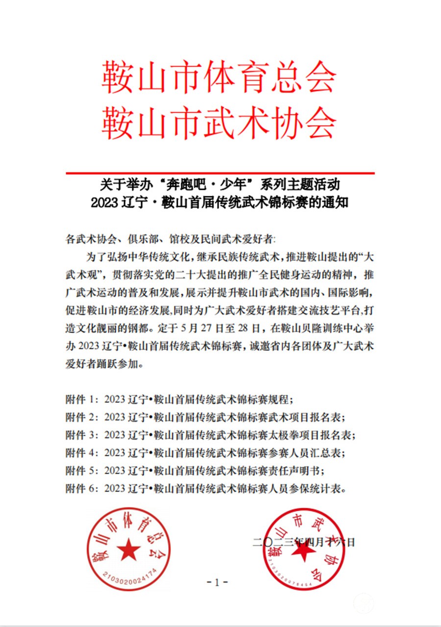 鞍山,简称鞍,辽宁省省辖市,辽宁省第三大城市,因市区南部一座形似马鞍的山峰而得名。鞍山是东北地区最大的钢铁工业城市、新中国钢铁工业的摇篮、中国第一钢铁工业城市,有着"共和国钢都"的美誉,因盛产岫玉,故而又有"中国玉都"之称。鞍山旅游资源丰富,有千朵莲花山、全国四大康复中心之一的汤岗子温泉、世界玉佛之最的玉佛苑、集自然、人文景观于一体的白云山,让人流连忘返。 千山风景名胜区 玉佛苑 汤岗子温泉 “奔跑吧.少年”系列主题活动 2023 辽宁鞍山首届传统武术锦标赛竞赛规程 一、业务指导单位: 辽宁省武术协会 鞍山市文化旅游和广播电视局 鞍山市体育事业发展中心 二、主办单位: 鞍山市体育总会 鞍山市武术协会 三、承办单位: 高新区武术协会 鞍山蕴仪陈氏太极拳馆 四、协办单位: 鞍山市红十字会 东武太极研修院辽宁鞍山分院 各市武术协会 五、竞赛日期、地点: 日期:2023 年 5 月 26 日-5 月 28 日 地点:鞍山市贝隆运动训练中心 六、竞赛项目 七、比赛项目分组 1.儿童组(A1 组)3 周岁~6 周岁 2.儿童组(A2 组)7 周岁~9 周岁 3.儿童组(A3 组)10 周岁~12 周岁 4.少年组(B1 组)13 周岁~17 周岁 5.少年组(B2 组)18 周岁~24 周岁 6.青年组(C1 组)25 周岁~29 周岁 7.青年组(C2 组) 30 周岁~39 周岁 8.青年组(C3 组)40 周岁~49 周岁 9.中年组(D 组)50 周岁~59 周岁 10.老年组(E 组)60 周岁以上 八、竞赛办法 1.比赛办法:釆用国家体育总局武术运动管理中心审定的《传统武术套路竞赛规则》(2012 版)及有关补充规定。 2.比赛时间:传统拳术、器械不可少于 40 秒~不可超过 2 分钟(太极拳类项目除外)。 3.太极拳 3~4 分钟,演练至 3 分钟时,裁判长鸣哨提示。 4.太极器械 2~3 分钟,演练至 2 分钟时,裁判长鸣哨提示。 5.竞赛套路及自选套路不得少于 1 分 20 秒。 6.对练项目不得少于 40 秒。 7.集体武术类项目不可超过 2 分,集体太极类项目不可超过 3 分钟,不可少于 6 人(自备音乐),比赛时可以派一人负责放音乐。 九、参赛办法 1.每队可报领队 1 名,教练 1 名,队医 1 名(儿童组及少年组可报助理教练 1 名),每名运动员只能代表一支队参赛。 2.每名运动员可以报单项(个人),同时可以兼报对练、集体项目。报名后,不得更改项目或组别。 3.每名运动员须必提交《第二代居民身份证》复印件、体检证明(含比赛日期 15 天内县区级以上医院出具证明、内容;心电图、血压、脉搏、脑电图及心肌酶谱等…)和人身保险证明(大会统一办理人身意外伤害保险证明),每人签署《责任声明》原件,以上三项缺少一项,将不能参加比 赛。 4.参加比赛未成年运动员(3 岁~17 岁),由本人和监护人在《责任声明》协议上签字。 十、录取与奖励办法 1.各单项按组別、性别、拳种、器械分别录取一等奖30%,二等奖 30%,三等奖 40%,颁发获奖证书和奖牌。按照实际参赛人数,采取四舍五入办法录取名次。 2.对练项目按照拳术对练、器械对练、拳术与器械对练分组,录取办法以单项相同。 3.集体项目比赛分别录取一等奖 40%,二等奖 30%,三等奖 30%,按照实际参赛人数,采取四舍五入的办法录取名次,集体代表队颁发匾额,个人发证书。 4.个人参赛 5 项的运动员(单项),授予“全能精英运动员”称号,颁发奖杯。 5.报名人数每 20 人以上,可以参加评选“优秀教练员” 1 名,颁发证书。 6.组委会评选“优秀裁判员”,颁发证书。 十一、参赛费用 1.每名运动员报名费 300 元/人(含两项:一套拳术,一套器械,含会务费 100 元)。每名运动员最多可报 5 项(集体项目除外)。 2.每名运动员每增加一项需交 50 元/项。 3.参赛满 6 人以上的队伍可报集体项目一项,不另外收取费用。(每队限报一项) 4.大赛组委会统一办理人身意外伤害保险,20 元/人。 5.各参赛代表队,电子板各项报表,请汇电子邮箱里。参赛费用和人身意外伤害险,请汇缴费银行帐号里。 十二、报名与报到 (一)、报名 1. 各参赛队 2023 年 4 月 10 日开始报名,2023 年 5 月 4日结止报名。 2. 这次比赛网上报名,电子邮箱号 744100078@qq.com 3. 缴费银行(参赛费用、人身保险): 收款单位:鞍山蕴仪陈氏太极拳馆 收款人:张 超 开户银行:中国银行 帐户号码:6217560500042556667 汇款之前,请各领队与赛事会务组沟通,确定款额正确后,方可汇款。汇款时附言注明代表队名称及款项用途。各参赛队报到时,请上交纸质板报名材料(报名表、体检证明、身份证复印件、责任声明),人身保险现场办理。报名材料(请全部用 A4 纸打印一式两份加盖单位公章或馆长签字,交一份,自留一份)。 (二)、报到 1. 5 月 26 日下午 13 点~16 点,各领队及教练(须带身份证)领取秩序册,参赛证,(领队、教练员及运动员)。 2. 5 月 26 日晚下午 16:30 召开比赛组委会联席会议。认真阅读秩序册內容,对项目和姓名有异议者,以原始报名表为准,(如有改项目和增项目,每一项需交 100 元)。由领队填写书面文字并签字和注明联系电话,会后递交大会组委会编排组。 3. 参赛运动员须穿武术表演服装,武术运动鞋,器械自备。(没有武术服装及武术运动鞋者不能参赛,并不能退各种费)。 4. 裁判员自备裁判服、深色裤子黑色皮鞋。5 月 26 日下午报到,下午 15 点裁判员学习。 5. 关注微信平台:“2023 辽宁鞍山首届传统武术锦标赛”。己经建立微信群,可以加微信号 yunyiquanguan,注明“武术参赛队名称”。 6. 仲裁人员、裁判人员由主办方选派。 十三、报到地点