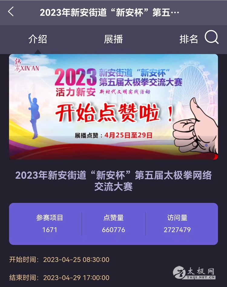 4月29日下午5点整,由深圳市宝安区新安街道党工委、办事处主办,深圳市宝安区新安街道党建服务中心(文体)、深圳市宝安区太极拳研究会承办,太极网提供网络支持的2023年新安街道“新安杯”第五届太极拳交流大赛(网络赛)经过5天网络展播圆满收官。 大赛一经发起,各地太极拳组织积极响应,最终累计3000余人参赛,精选1671部参赛作品(含集体项目)参与展播。 本届大赛全体同台展播点赞从4月25日开始,截至29日17:00收官,平台累计网络访问量高达270余万次,投票点赞60余万次,连续5天燃爆太极人的朋友圈! 本着"公开透明、客观全面、权威公正"的评审原则,在大赛展播点赞的网络基础上,组委会将邀请专业裁判员组成强大的评审阵容为大赛评审工作提供坚实保障,让大赛兼具观赏性和权威性。大赛评审结束后统一公示成绩,敬请期待。 “新安杯”太极拳交流大赛组委会 2023年4月29日 |