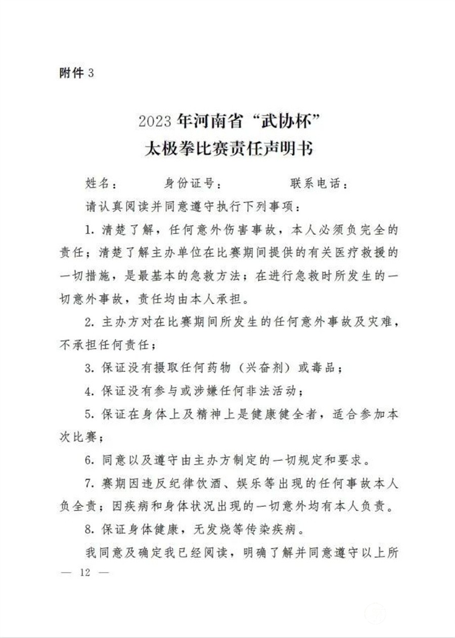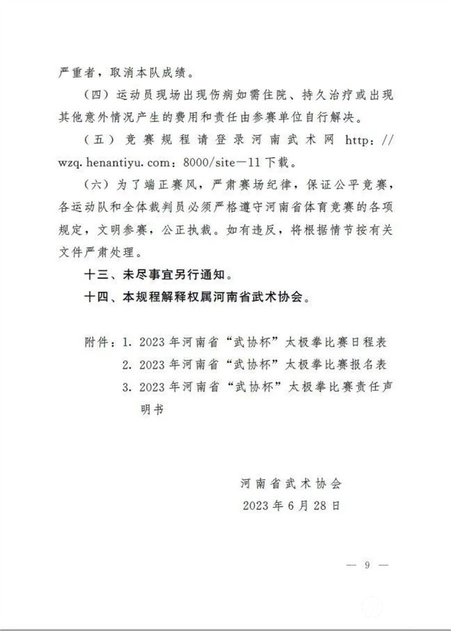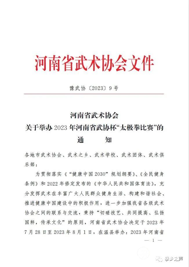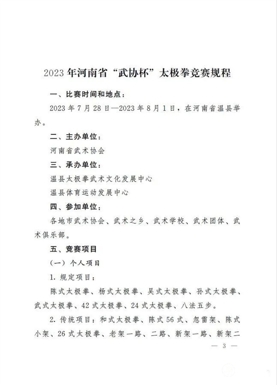 河南省武术协会 关于举办2023年河南省武协杯“太极拳比赛”的通知 各地市武术协会、武术之乡、武术学校、武术团体、武术俱乐部: 为贯彻落实《“健康中国2030”规划纲要》、《全民健身条例》和2022年修定发布的《中华人民共和国体育法》,充分发挥武术在丰富广大人民群众健身生活、构建和谐社会、推进健康中国建设中的积极作用,进一步加强我省各级武术协会之间的联系与交流,秉持“切磋技艺、共同提高、弘扬国粹,传承文化”的原则,河南省武术协会决定于2023年7月28日至2023年8月1日,在温县举办:2023年河南省武协杯太极拳大赛。现将竞赛规程印发给大家,望各单位认 真准备,积极参赛。 |