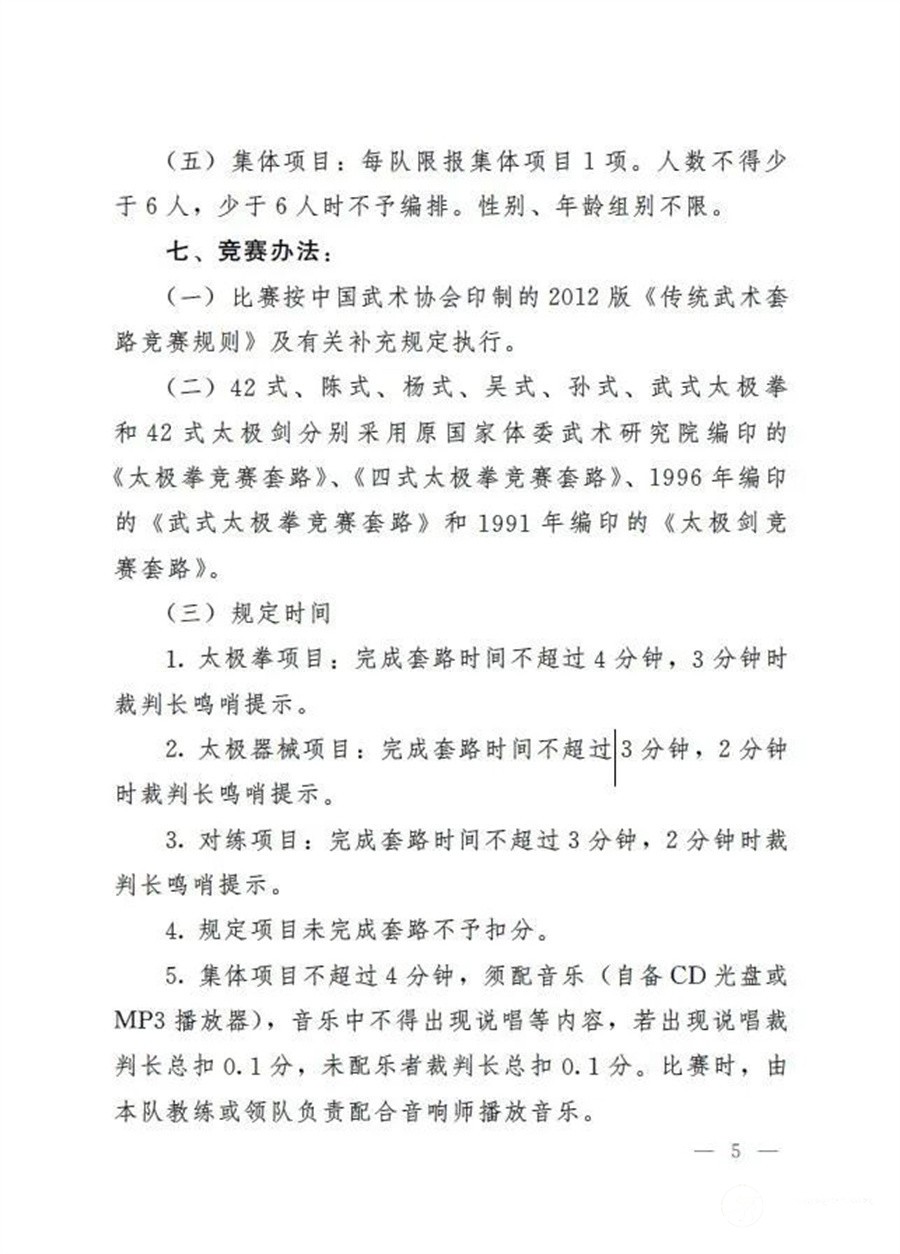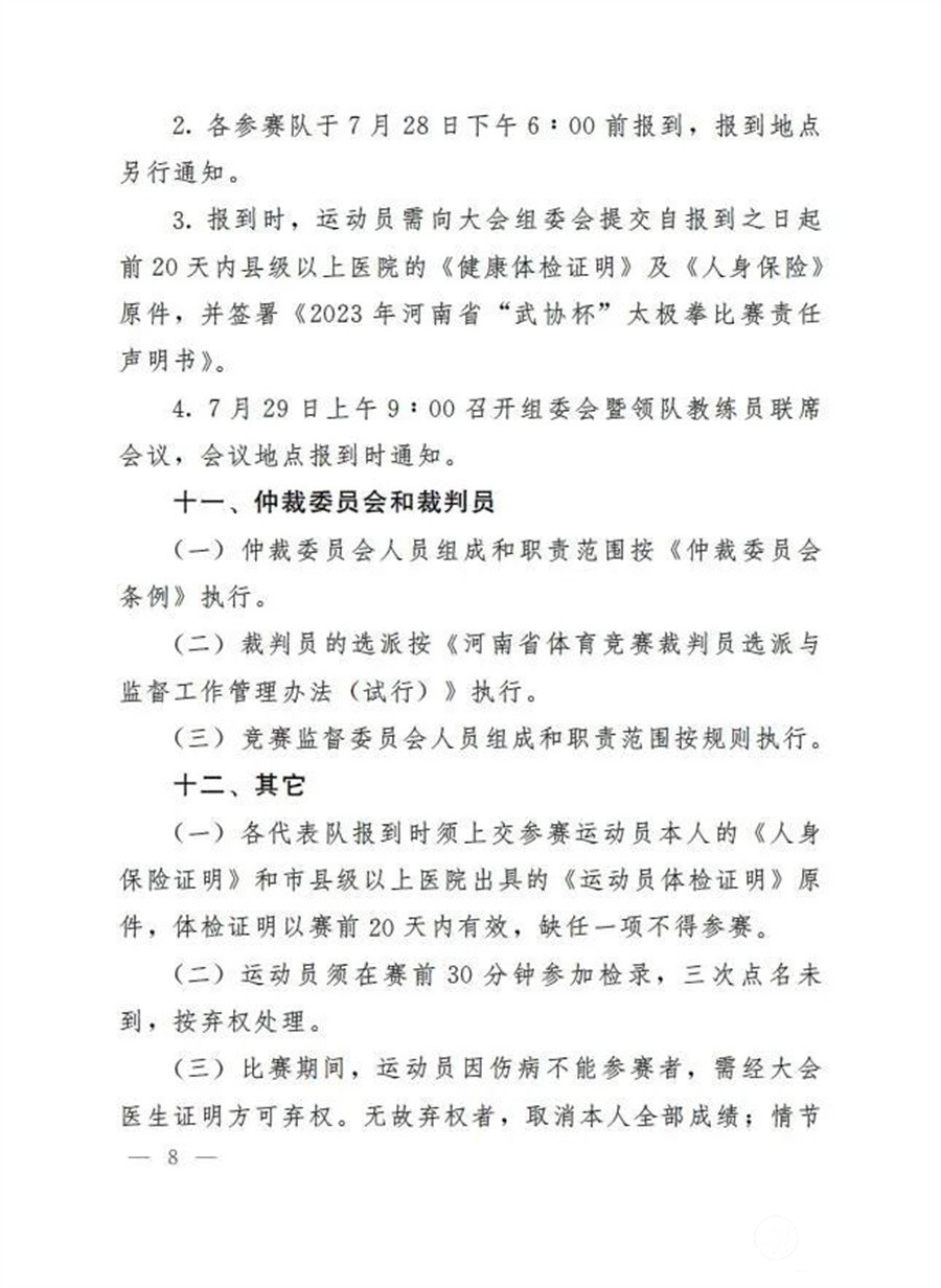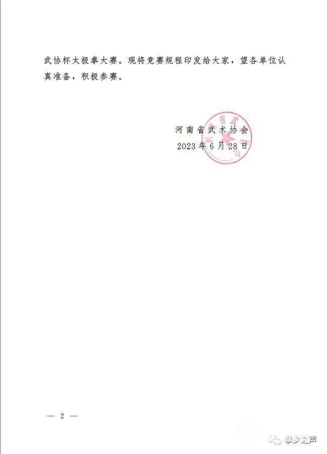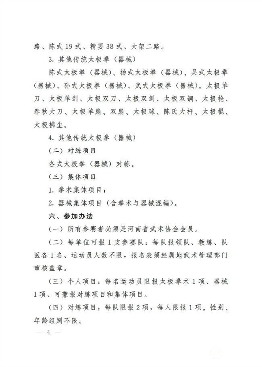 河南省武术协会 关于举办2023年河南省武协杯“太极拳比赛”的通知 各地市武术协会、武术之乡、武术学校、武术团体、武术俱乐部: 为贯彻落实《“健康中国2030”规划纲要》、《全民健身条例》和2022年修定发布的《中华人民共和国体育法》,充分发挥武术在丰富广大人民群众健身生活、构建和谐社会、推进健康中国建设中的积极作用,进一步加强我省各级武术协会之间的联系与交流,秉持“切磋技艺、共同提高、弘扬国粹,传承文化”的原则,河南省武术协会决定于2023年7月28日至2023年8月1日,在温县举办:2023年河南省武协杯太极拳大赛。现将竞赛规程印发给大家,望各单位认 真准备,积极参赛。 |
