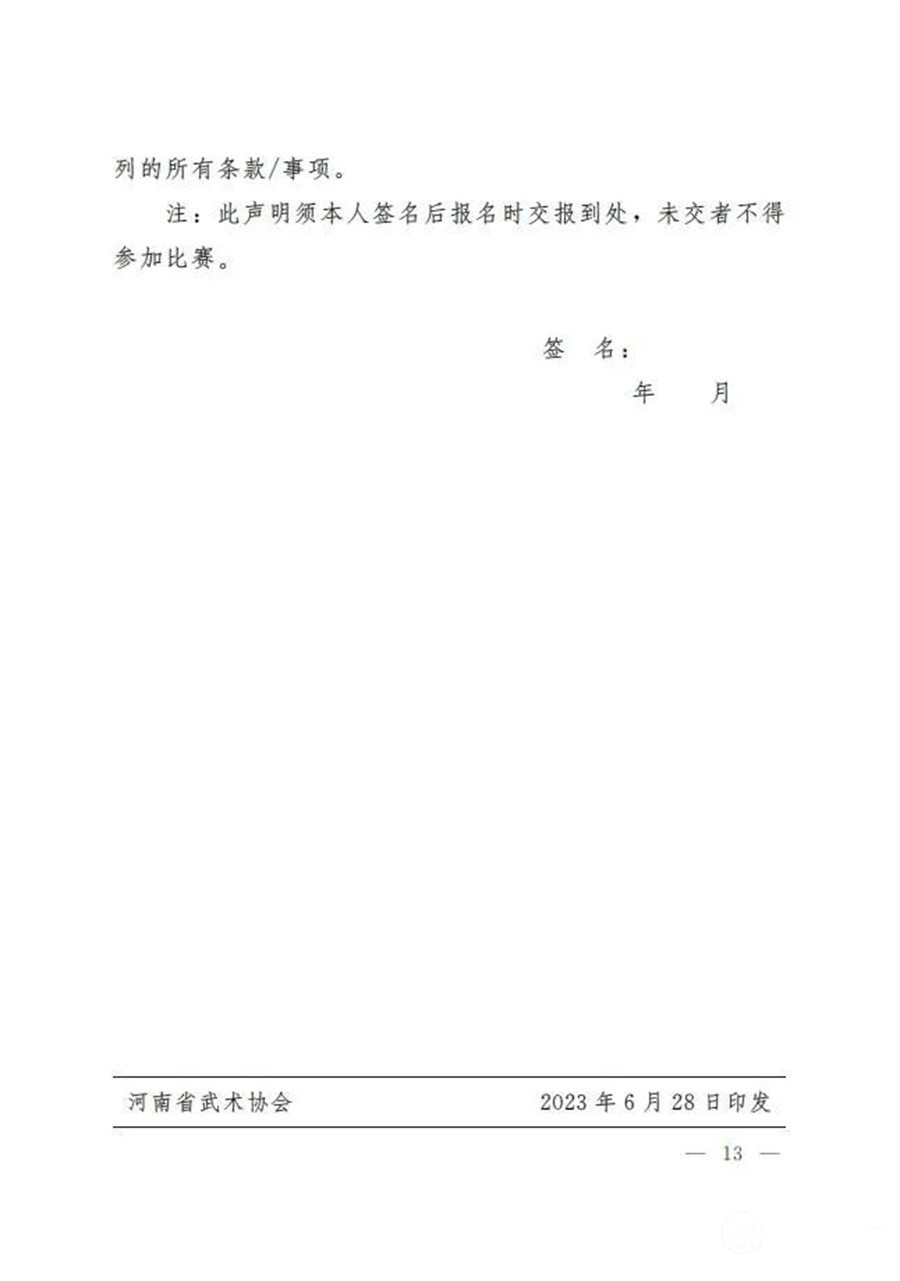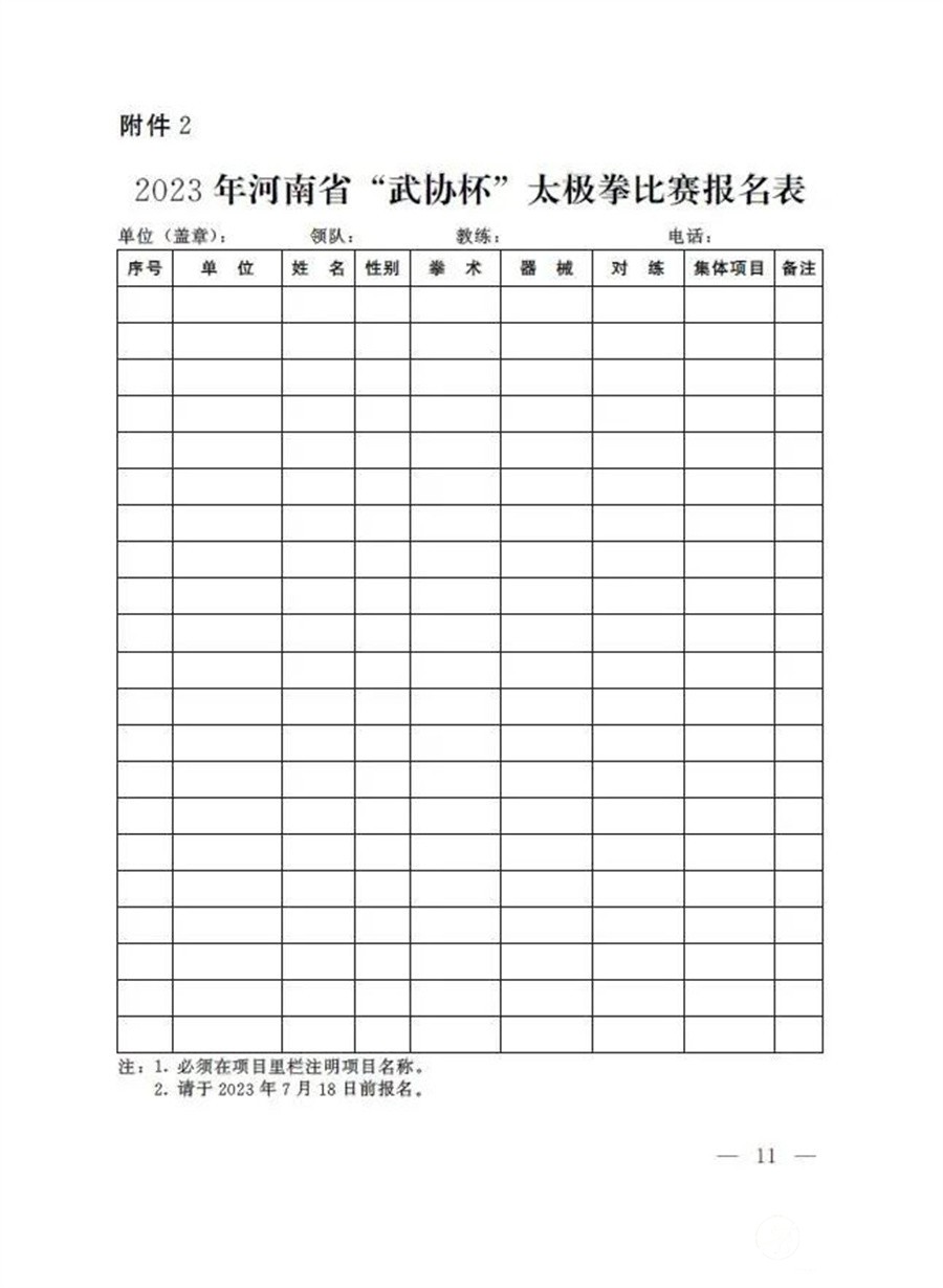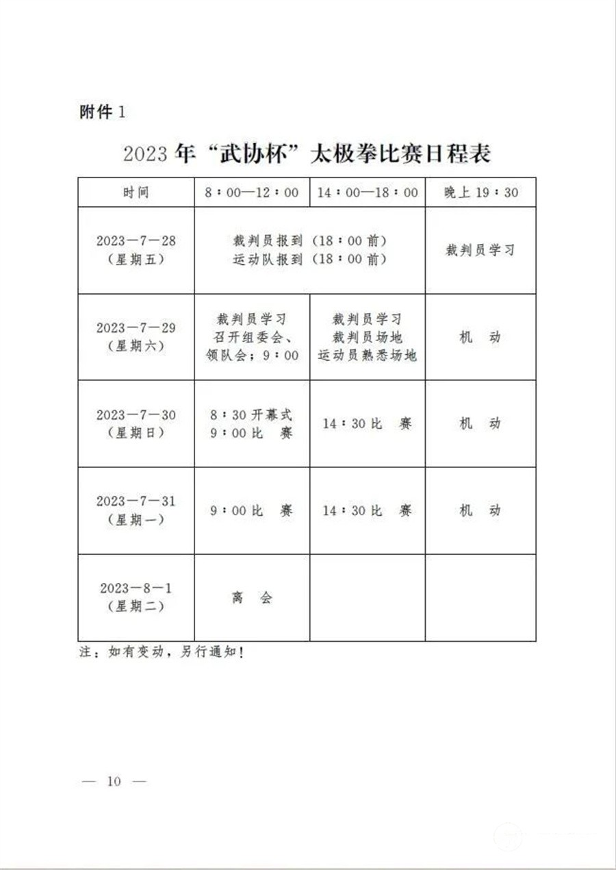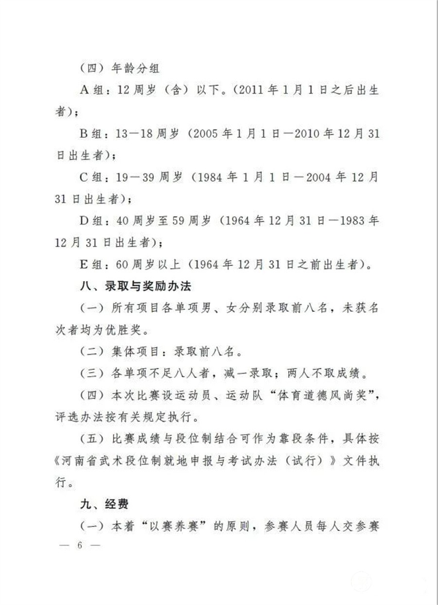 河南省武术协会 关于举办2023年河南省武协杯“太极拳比赛”的通知 各地市武术协会、武术之乡、武术学校、武术团体、武术俱乐部: 为贯彻落实《“健康中国2030”规划纲要》、《全民健身条例》和2022年修定发布的《中华人民共和国体育法》,充分发挥武术在丰富广大人民群众健身生活、构建和谐社会、推进健康中国建设中的积极作用,进一步加强我省各级武术协会之间的联系与交流,秉持“切磋技艺、共同提高、弘扬国粹,传承文化”的原则,河南省武术协会决定于2023年7月28日至2023年8月1日,在温县举办:2023年河南省武协杯太极拳大赛。现将竞赛规程印发给大家,望各单位认 真准备,积极参赛。 |
