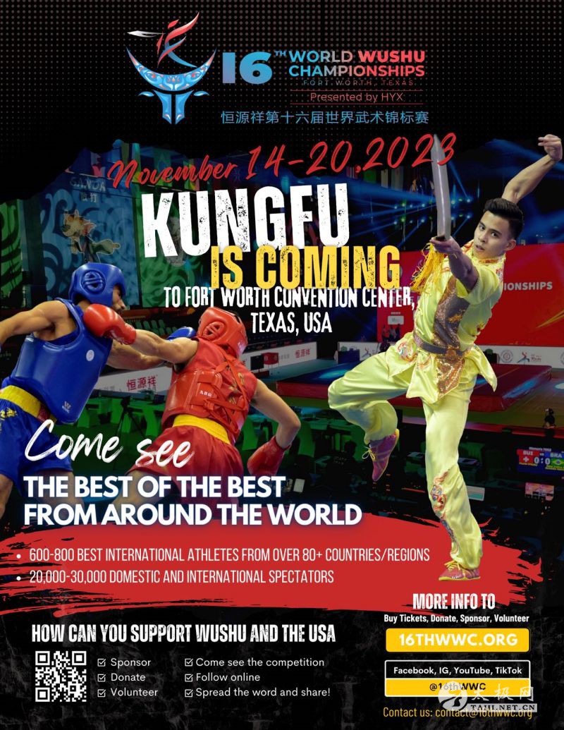 (钱承飞 报道)武术,源于中国,属于世界。2023年11月,世界顶级武术运动员将齐聚美国德克萨斯州沃思堡,参加国际武术联合会(IWUF)最高水平的标志性赛事:世界武术锦标赛。自1995年巴尔的摩举办第3届世界武术锦标赛以来,武术在美国和全球范围内得到了显著的发展,还成为2026年达喀尔青奥会的正式项目。武术这项中华传统体育项目,步步为营,剑指奥运。 第16届恒源祥世界武术锦标赛将于2023年11月16日至20日在美国德克萨斯州沃思堡举行。这个两年一度的全球性赛事将吸引来自80多个国家的一千多名选手和随行人员,预计将会有2-3万名现场观众。 世界武术锦标赛(WWC)由国际武术联合会(IWUF)主办,是该运动中的最高竞技水平的赛事。本届世锦赛由美国武术联合会(USAWKF)组织,由第16届世锦赛组委会(WWC16 Administration, Inc)承办,将在德克萨斯州的沃思堡会议中心举行。这是近30年来世锦赛首次重返美国。上一次这个国际性体育盛事在美国举行是1995年在马里兰州巴尔的摩。这次在德州的比赛将聚焦来自亚洲、欧洲、非洲、泛美洲和大洋洲的世界顶级运动员。从刚柔并济的剑术,到行云流水的太极拳,再到激烈的全接触散打,世界顶级冠军们将在比赛中展示各种武术项目的独特魅力。 吉祥物和奖牌 此次世锦赛官方吉祥物是德克萨斯州的长角牛和犰狳,都是德克萨斯州的著名本土动物,象征着力量和坚韧,与武术运动员一样。奖牌上有德克萨斯州长角牛的图案,动态的武术动作人物形象,以及象征古希腊冠军的月桂叶图案。 |