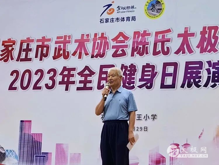 为了积极响应石家庄市武术协会2023年8月8日第15个全民健身日主题活动,做好“2023年全民健身日活动暨石家庄市武术节启动仪式”展演工作,陈氏太极拳专委会于2023年7月29日在南王学校,组织开展了“2023年全民健身日展演活动”,石家庄市武协主席、陈氏太极拳专委会会长杨合发先生出席本次活动并讲话。