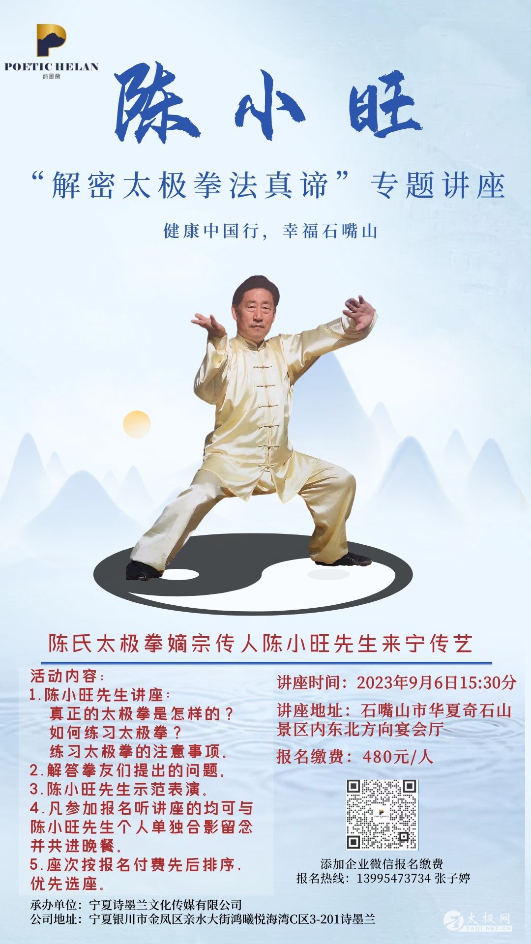 健康中国行 幸福石嘴山 2023年宁夏的体育事业也取得了全方位突破。自治区体育局坚持以习近平新时代中国特色社会主义思想为指引,认真学习贯彻党的二十大精神、习近平总书记视察宁夏重要讲话指示批示精神和关于体育的重要论述,在自治区党委、政府坚强领导和大力支持下,凝心聚力、开拓创新,全面推动群众体育、竞技体育、体育产业、青少年体育取得新突破,全区体育事业迈出了高质量发展的铿锵步伐。石嘴山市文化旅游局特邀请陈氏太极拳嫡宗传人陈小旺先生及世界陈小旺太极拳总会执行会长孙冬侠女士,于2023年9月6日下午在石嘴山市华夏奇石山景区举办太极拳讲座现将相关事宜通知如下。 邀请方: 石嘴山市文化旅游广电局 石嘴山市教育体育局 协办方: 石嘴山华夏奇石山有限公司 宁夏银川市武术协会 宁夏石嘴山市武术协会 宁夏石嘴山市太极拳协会 宁夏沐贺科技有限公司 执行方: 宁夏诗墨兰文化传媒有限公司 宁夏诗墨兰电子商务有限公司 陈氏太极拳嫡宗传人·陈小旺 陈小旺,1946年生于河南温县陈家沟。陈氏太极拳嫡宗传人,世界非物质文化遗产项目太极拳传承人,世界陈小旺太极拳总会会长。中国武术九段。第七届全国人大代表,河南省第七届政协委员。2012年10月做客央视“文明之旅”栏目并荣获首届“中华之光——传播中华文化年度十大杰出人物”,2013年3月做客央视“华人世界”栏目,并荣获“第二届中华非物质文化遗产传承人薪传奖”。先生倾毕生之精力致力于太极拳文化的研究、传承与推广工作,并在拳术及理论上为人类贡献了丰硕的成果。即,(1)把太极拳由神秘走向科学化。总结了太极拳以丹田为核心的运动体系学说。(2)明确了太极拳的训练标准和目标。(3)明确了太极拳传承下来的必要条件。(4)提出一个运动体系分三种运动形式,即通过丹田左右,前后,又前后左右旋转,把全身练成以丹田为核心,一动全动,节节贯穿,一气贯通的运动体系。练拳时本着这个原则来缩小运动当中的误差,为之修身;提出运用阴阳哲学思想平衡心理,缩小思想上的误差达到心理平衡,为之养性;明确提出通过习练太极拳能够达到修身养性的目地之核心理论。并提出在教学时需要通过三种语言,即讲诉的语言,肢体的语言,手的语言传输给学生,学生才能真正领会正确的习练方法。 孙冬侠,深圳市武术协会副主席,温县武术协会特约副主席,陈小旺全球事务负责人,世界陈小旺太极拳总会执行会长,陈小旺先生夫人。 活动简介 人民健康是民族昌盛和国家强盛的重要标志。习近平总书记所作的党的二十大报告,对推进健康中国建设作出重要部署,强调要“把保障人民健康放在优先发展的战略位置”。这充分彰显了卫生健康事业的基础性、全局性地位,体现了人民至上、生命至上的价值追求,为新时代新征程推动卫生健康事业改革发展指明了方向。为此宁夏石嘴山市特此举办太极文化旅游节,并确立了“共享太极·共享健康”“解密太极拳真谛”等理念,促其能够成为社会各界主题方向。 讲座相关事宜 敬启者: 陈氏太极拳嫡宗传人陈小旺先生于2023年9月上旬来宁传艺,莅临石嘴山华夏奇石山之际,兹定于9月6日15:30,在宁夏石嘴山市华夏奇石山举办"五层功夫的两个阶段及太极拳的修身养性"专题讲座。 因名额有限,有意参与人员可扫码私信报名。 活动内容: 1. 陈小旺先生讲座: 真正的太极拳是怎样的? 如何练习太极拳? 练习太极拳的注意事项。 2. 解答拳友们提出的问题。 3. 陈小旺先生示范表演。 4. 凡参加报名听讲座的均可与陈小旺先生个人单独合影留念并共进晚餐。 5. 报名缴费480元/人。 座次按报名付费先后排序,优先选座。 讲座时间:2023年9月6日下午15:30。 讲座地址:石嘴山市华夏奇石山景区内东北方向宴会中心。 1. 报名方式(凡报名者请扫下方二维码添加报名)。 2. 缴费方式(添加上方二维码缴费并备注姓名+电话)。 |