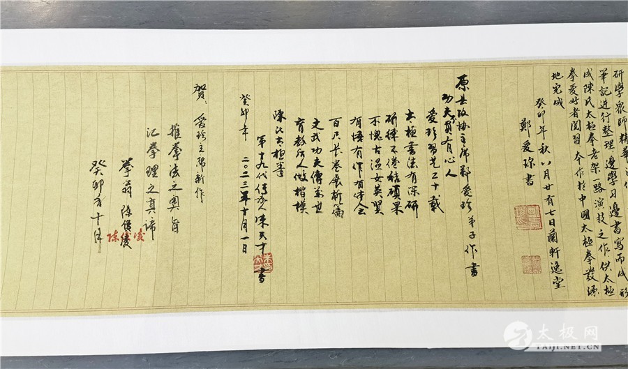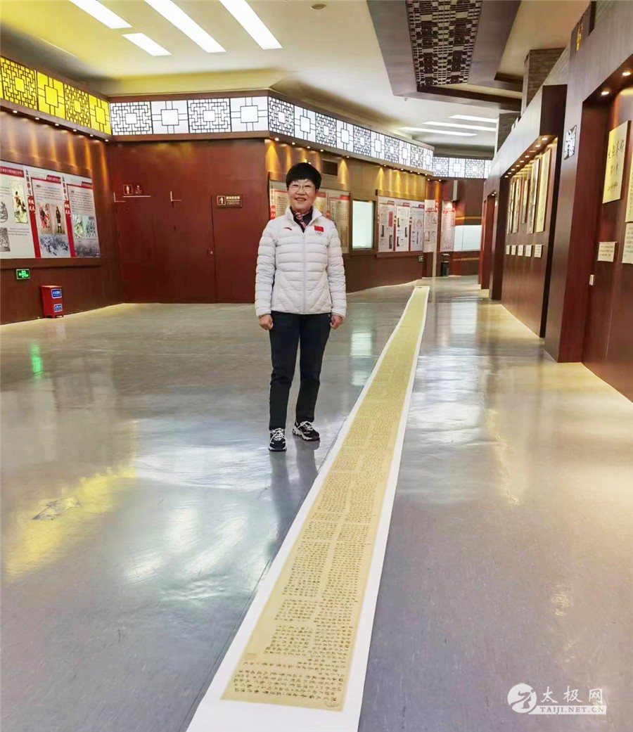 11月11日,政协温县第九届委员会主席郑爱珍历经一个多月精心创作的近30米长卷《陈式太极拳老架一路拳理技法》行楷书法作品在温县问世。 以笔寄意,以字传情。整个长卷画面长而不冗,繁而不乱,字迹工整清秀,令人耳目一新。由于书写行楷需要非常安静的环境,每天她都是关上房门,独自一人在屋里创作,将对太极拳的热爱融入笔尖,挥毫泼墨完成了这部书法长卷作品。 “我终于完成了一个心愿——为弘扬传承太极文化,用一个多月时间,对陈式太极拳老架一路的技法拳理及习拳二十多年感悟进行研习整理总结,并用楷书书写成近30米长卷,供太极拳爱好者阅习!”郑爱珍说。 太极拳大师朱天才和陈俊岭看后欣然题词以贺。朱天才贺:“爱珍习艺二十载,太极书法有深研,研练不倦结硕果,不愧古温女英贤,有悟有作有体会,百尺长卷展新篇,文武功夫傳万世,育教后人做楷模。”陈俊岭贺:“推拳法之奥旨,汇拳理之真谛。” “郑爱珍同志多年来倾力殚精于太极文化建设,对推动太极拳发展作出了卓越贡献。她身体力行,二十年习练寒暑不易,现将太极拳理论技法感悟书写成书法长卷,必将泽被乡梓惠及于民。”太极拳传承人陈小旺说。 《陈式太极拳老架一路拳理技法》行楷书法长近30米,宽40厘米,20000余字,用书法长卷的艺术形式弘扬太极文化,书写对太极拳的热爱与赤诚。 来源:焦作日报 编辑:小七 |
