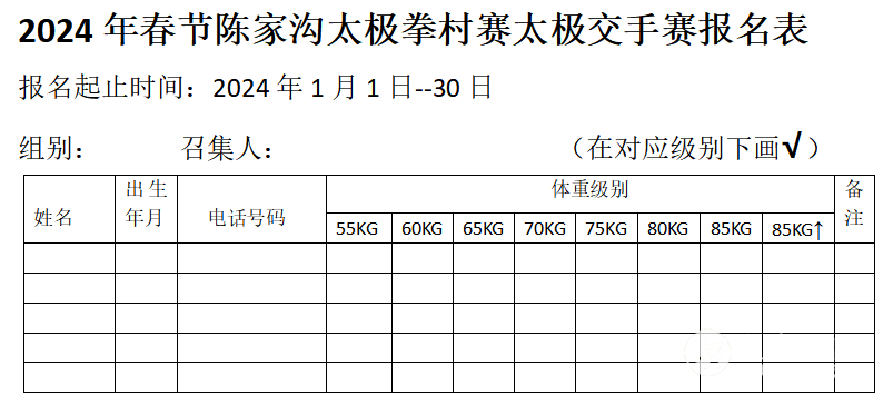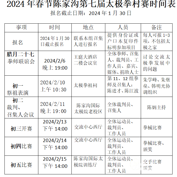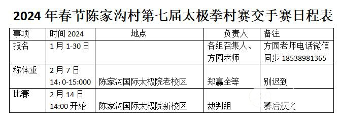 2024年春节陈家沟太极拳 “大咖国际”第七届村赛活动方案 一、赛事宣言 保持陈家沟太极拳的长盛不衰、延续村中世代习武风尚、守护太极拳发源地根脉,促进拳师间的交流团结、扩大村民习拳群体,夯实全村习拳基础,激发全村以习拳会拳为荣耀,发现和培养更多的优秀太极拳专业人才,带动周边村镇的太极拳文化活动,引领太极拳发展的时代潮流。 二、赛事介绍 本赛事由陈家沟村民委员会主办,陈家沟太极拳协会、陈家沟陈氏家族理事会承办,每年春节期间举行。参赛人员为陈家沟、陈新庄、辛堂、留村以及外迁的陈家沟原居民,活动支持方为陈家沟及周边诸多太极拳拳师以及各地的陈氏太极拳子弟。 赛事活动第一项为大年初一上午10:00在祖祠广场的半小时太极拳演练,将太极拳展演活动列为陈家沟初一祭祖仪式的首要内容。赛事活动的第二项为太极拳交流比赛,时间定为初三至初六每天下午14:00点开始。 本赛事自2016年春节起,将每年春节期间举办,生生不息、代代相传,成为陈家沟太极拳文化不断发展的象征和检验平台。 三、赛事组织 1、大赛名誉主席:陈小旺 陈正雷 王西安 朱天才 陈伯祥 陈全忠 陈沛林 2、大赛主席:陈小星 副主席:陈沛菊 3、大赛总指导:陈冲 4、大赛副总指导:陈自强 5、大赛顾问 (村内)陈天成、陈清环、陈立洲、陈保华、陈喜法、陈东海、陈东山、张永国、陈立法、陈全旺、陈为民、陈向乡、陈向红、陈向前、陈坤、李如意、陈迎军、陈鹏飞、陈三虎、陈万波、陈福旺、朱保林、朱向前、朱向怡、陈绍雷、陈恩、陈娟、陈琦、陈吉、陈小六、陈根全、 陈有利 、陈红 、吴战江 、李斌、 陈皂罗、谢蓓蕾、陈梦芝、陈艳、陈六有、陈启亮、陈启雷、翟全平、陈桂生、陈春生(西安)、陈淑丽、陈荣利、陈国胜、陈国庆、陈西鹏、陈西立(西安)、陈泽峰、陈晓剑(太原)、陈金生(西安)、陈秋菊、刘根齐、朱飞飞、李芳、王福礼、王虎、张福才、雒孬、黄满堂、王翠花、郑迪、郭西林、张保忠、陈战强、陈小根、原大伟、程伟、陈海军、王会战、陈长江、王向忠...(周边)王永、陈文革、陈建军、陈梅、陈根成、陈庆雷、张随胜、张涛、陈进才、曹二柱、陈小保、王东红、陈凤云、李立军、... 6、大赛组委会 陈军团 陈霞 陈志强 陈军营 陈军 陈自军 陈斌(10队) 陈媛媛 王战东 王战军 陈冲(5队) 朱向华 陈卫生 陈一华 陈绍杰 张福旺 陈二虎 朱学峰 陈冲(8队)陈铁柱 吴占涛 陈全胜 陈炳 组委会职责:负责大会工作的全面落实、把握赛事发展方向、筹备赛事资金、调配赛事人员及组织大会会议和确定工作方案。 7、大赛裁判及保障组 陈长军、陈向武、陈大虎、陈冠军、陈长峰、陈有雷、段卫星、陈金堂、陈德鹏、陈占成、张恒义、陈涛、陈庆源、陈国强、陈国太、陈绍冲、陈绍杰、陈建强、陈齐、陈硕、陈相林、陈大伟、陈朝霞、武小敏、陈鹏、张绍刚、李建中、吴战江、李民、冉永庆、王利娟、张绍东、王战国、王战营、吴淼、王全中、贺卫军、李相东、董芮希、郑赢全、侯永超、陈铮、陈志峰、申典雅、陈小栋、陈鑫、王海军、朱佳楠、陈辉、朱蒙蒙、陈腾超、陈建翔、王金、陈天庆、陈勇安、2队陈斌、朱向峰、陈志伟、陈新芳、陈爱群、陈国杰、陈迎喜、陈保林、陈沛杰、陈建民、陈方贤、陈向前、陈小群、陈亚军、陈庆云、陈麦香、陈雪飞、辛强、朱堡垒、陈飞鸿、陈超、陈巍、陈飞、陈永峰、王朝、陈斌(西安)、陈三根、陈焦生、宋志旭、陈庆、陈庆毅、陈杰、陈天森、陈天超、陈天视、王长宾、王大娟、王二娟、任明明、陈向坤、陈苏娟、陈跃、王帅、刘重阳、刘新新、陈俞良、张凤义、陈二伟、王苗、陈永昌、陈永浩、陈序、申绍杰、陈龙飞、陈腾飞、张沛娟、陈永波、吴飞、钦祥云、翟跃沛...... 裁判组职责:负责报名统计、赛程编排、秩序册编印、赛场布置、裁判安排和场上执裁。 保障组职责:全面协助赛场工作、维护和监管赛场秩序、根据大赛需要,随时到岗。 8、大会仲裁组:陈长流 陈照森 陈俊岭 陈素英 陈桂珍 陈春爱 陈瑞华 陈春生 陈庆雷 仲裁组职责:现场督导裁判工作、对比赛规则进行研究和完善。 9、大会财务组:王亚茹 陈霞 陈涛 财务组职责:严格管理好筹款的收支使用,保证账目清晰透明,接受财务监管组的核对。对大会购买的物资登记造册并妥善保管 。 因掌握信息有限,向未列入大赛名单者致歉,并请未列入者联系组委会13323895769陈炳,进行补录登记。 10、财务监管组: 安三旺 陈一华 陈 冲(村委) 财务监管组职责:对大会财务收支情况给予监督和张榜公布,发布筹款使用状况的监管评语。 四、赛事内容 1、陈氏太极拳老架一路(听裁判6分钟鸣哨截止,套路可节选) 2、陈氏太极拳老架二路(听裁判3分钟鸣哨截止,套路可节选) 3、陈氏太极拳小架一路(听裁判6分钟鸣哨截止,套路可节选) 4、陈氏太极拳小架二路(听裁判3分钟鸣哨截止,套路可节选) 5、陈氏太极拳新架一路(听裁判6分钟鸣哨截止,套路可节选) 6、陈氏太极拳新架二路(听裁判3分钟鸣哨截止,套路可节选) 7、陈氏太极单剑(全套完成或4分钟鸣哨停止) 8、陈氏太极单刀(全套完成或1分钟鸣哨停止) 9、陈氏太极枪(全套完成或3分钟鸣哨停止) 10、陈氏太极春秋大刀(全套完成或3分钟鸣哨停止) 11、陈氏太极十三杆(全套完