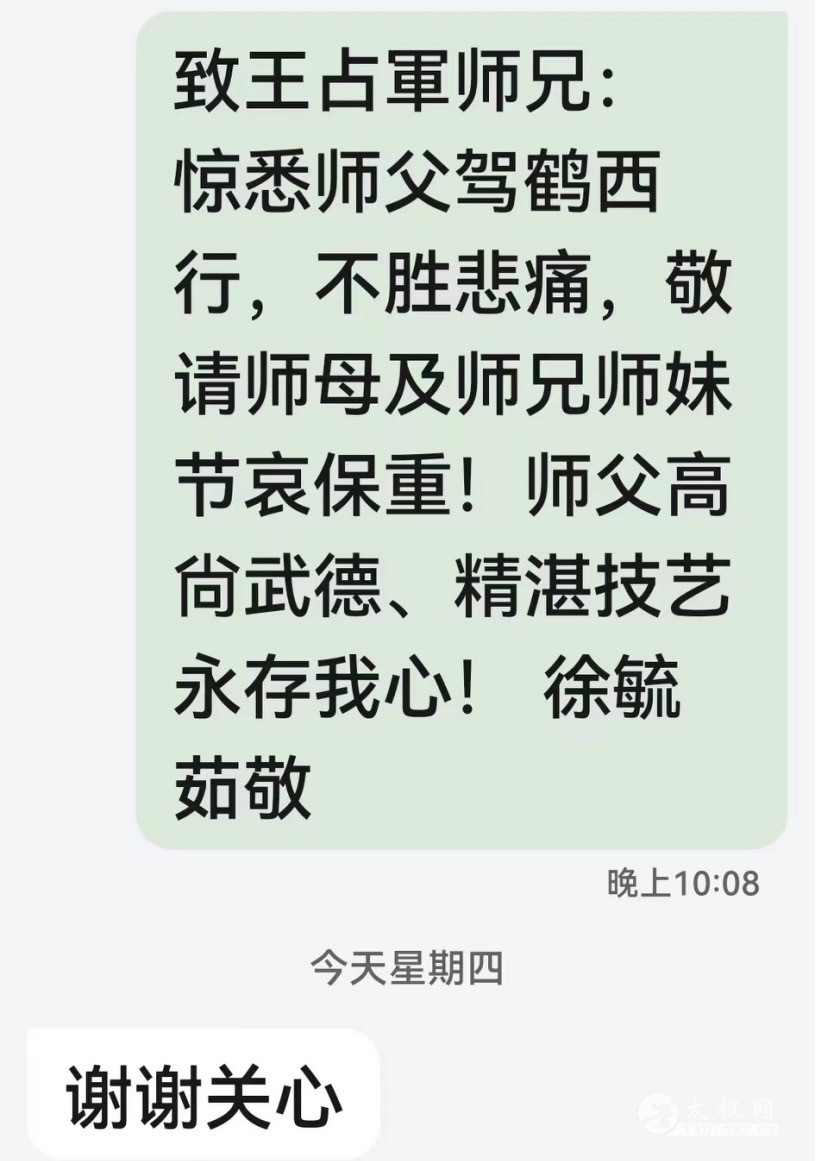 陕西武术网讯(武双安):著名武术家、国家首批非物质文化遗产(陈氏太极拳项目代表性)传承人、陈家沟太极拳“四大金刚”之一、陈式太极拳第十一代传人、国家武术高级教练王西安先生,于2024年2月6日逝世,享年81岁。王西安先生一生致力于陈式太极拳的传承与发展,为太极拳在世界范围内的传播与发展做出了巨大贡献。 惊闻陈式太极拳大师王西安仙逝,著名武术家、中国武术九段、陕西武术队太极拳专家徐毓茹老师第一时间发文悼念恩师王西安先生。与此同时,太极名将、高级教练吴雅楠也在朋友圈发文悼念,陕西武术队太极拳组教练宁彪带领诸位教练和队员深切追思缅怀一代宗师王西安先生。 本站责编:小七 |