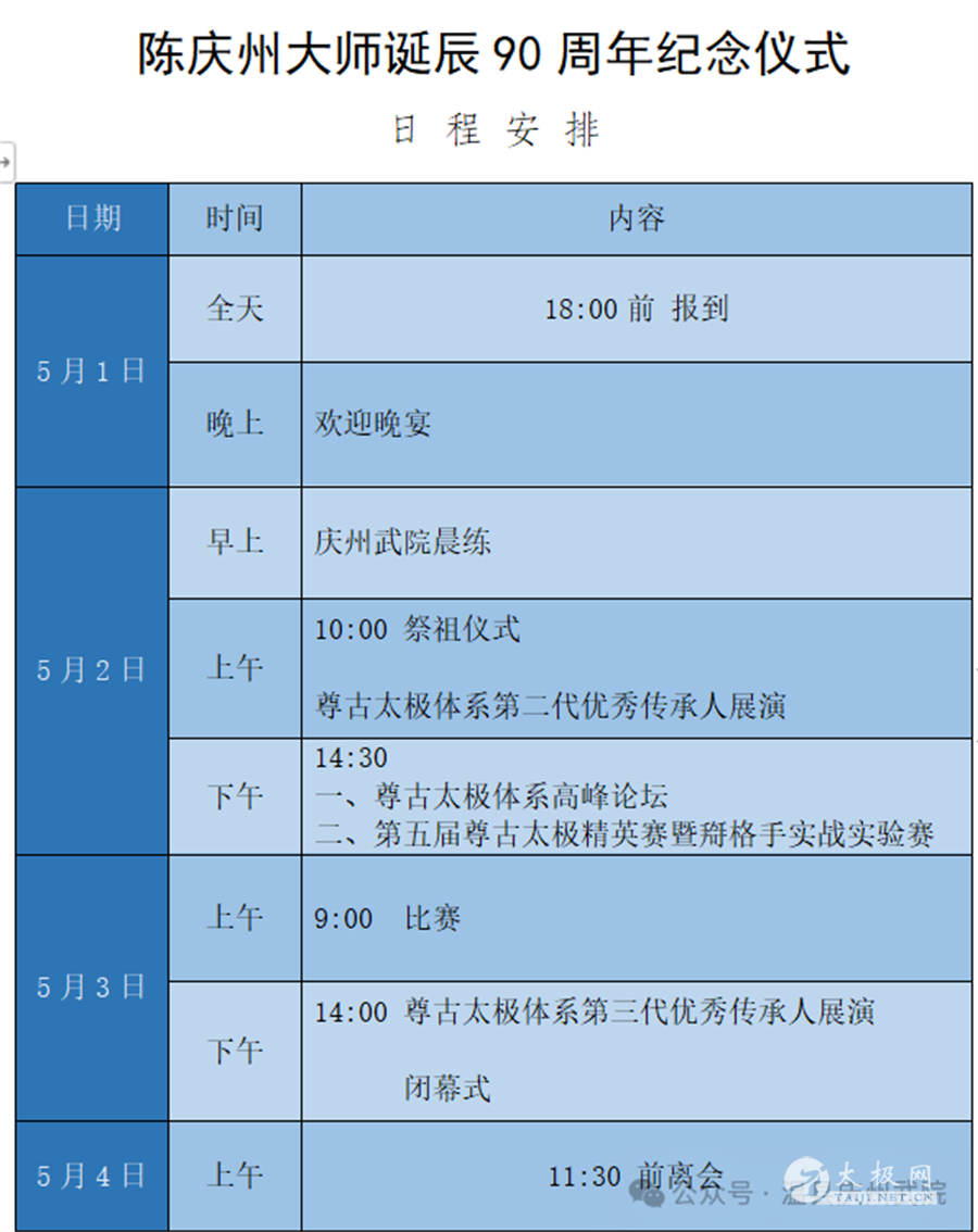 陈庆州大师诞辰90周年纪念活动 暨尊古太极体系高峰论坛 一、活动单位 主办单位:温县庆州武院 承办单位:温县尊古非物质文化发展中心 时光荏苒,岁月如梭。转眼间,陈庆州大师的90周年诞辰即将来临。在这个特别的日子里,我们怀着无比崇敬和感激的心情,诚挚地邀请您参加陈庆州大师诞辰九十周年的纪念仪式,共同缅怀、传承大师的功绩和精神。 回首往昔,陈庆州大师辛勤耕耘,无私奉献,以卓越的智慧和高尚的品德,为太极拳传承和繁荣做出了不可磨灭的贡献。他的教诲和关爱,如同一盏明灯,照亮了我们前行的道路;他的言传身教,更是激励着我们不断追求卓越,勇攀高峰。他不仅传授了我们精湛的武艺,更教导我们做人的道理。在他的引领下,尊古太极体系日益壮大,声名远扬。 在纪念仪式上,我们将回顾陈庆州大师的生平事迹,重温大师的教诲和恩情,举办太极套路以及搿格手实验擂台赛,并组织尊古二代、三代弟子们演练汇报。 同时,我们也将展望未来,继承和发扬陈庆州大师的精神,为尊古太极体系的发展和社会的进步贡献自己的力量。 在此,我们诚挚地邀请您莅临现场,与我们共度这个难忘的时刻。您的出席将使纪念仪式更加庄重、温馨,也将成为我们门派发展史上的重要一页。 二、活动时间、地点 (一)时间:2024年5月1日至5月4日 (二)地点:中国·温县 三、活动日程 四、参会(赛)人员 尊古太极体系传承人及学员、太极拳爱好者等。 五、收费标准 (一)会务费:300元/人(包含参赛费) (二)食宿费:780元/人 注:温县本地不需住宿的宾客,需缴纳1号晚宴和祭祖午宴餐费200元和会务费300元,共计500元。 六、报名、报到及离会 (一)报名 请各学员于3月20日前,将会务费及食宿费缴纳给联系人: 齐福民:18717938871(微信同号) 司孟辉:15993793718(微信同号) (二)报到 时间:2024年5月1日18:00前 地点:焦作市温县海旺大酒店 (三)离会:5月4日上午11:30前离会 七、其他事宜 参会人员往返差旅费、人身意外伤害保险费,提前报到或逾期离会食宿费等费用自理。 |