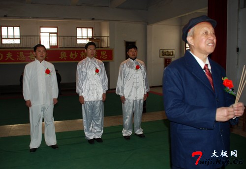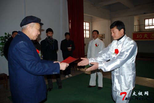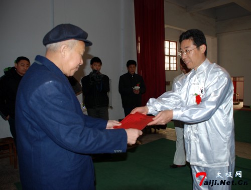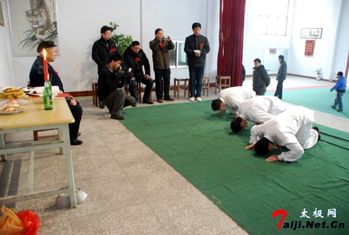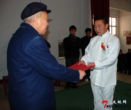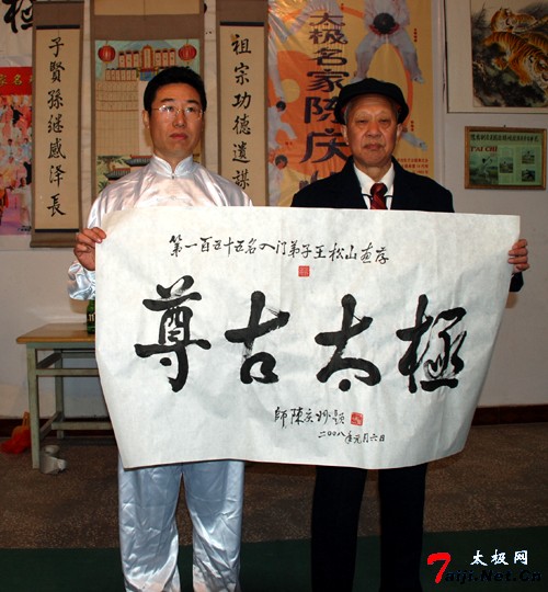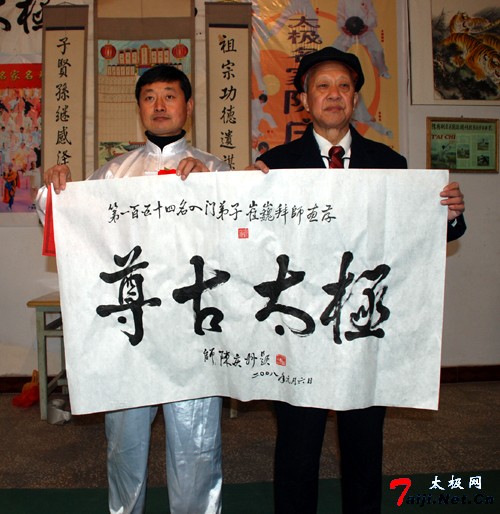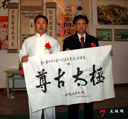新年伊始,喜事连连。元月6日,在温县陈庆州太极功夫院,来自哈尔滨、徐州等地的太极拳爱好者以及陈庆州大师的弟子们欢聚一堂,共同参加陈庆州大师的收徒仪式。这天,来自哈尔滨的太极拳爱好者、尊古太极的追随者崔巍、王松山以及来自漯河市的温籍拳师晁文涛有幸成为陈庆州大师的入门弟子。 陈庆州大师系陈氏太极拳十一代传人、国际太极拳大师。现任温县陈庆州太极功夫院总教练。中国温县国际太极拳年会副秘书长,河南教育学院武协顾问,韩国汉城太极拳协会常务顾问,美国陈庆州功夫研究会总教练等。曾多次应邀出国讲学,被授予“武术博士”称号。他在陈照丕恩师的指导下,习练尊古太极四十余载,掌握了陈式太极拳的全部精髓,其演练的太极球更是堪称一绝。 在拜师收徒仪式上,陈庆州大师首先祭拜先祖,随后,崔巍、王松山、晁文涛各自呈请并朗读拜师帖,并共同向恩师行拜师大礼。在得到恩师颁发的写有老师签名的传承书后,主持人又宣读了陈式太极拳门规戒律和太极拳门规师训。 在座的各位嘉宾见证了这一美好时刻。为了表示对三位新入门弟子的祝贺,来自徐州的陈庆州大师的入门弟子姜启健以师兄的身份发表讲话。三位新入门弟子也分别说出了此刻自己的真实感受和对恩情的感激。同时,在仪式现场,书法在拳界极有声誉的陈庆州大师又欣然向三位新入门弟子分别书写并赠送了自己的书法作品。