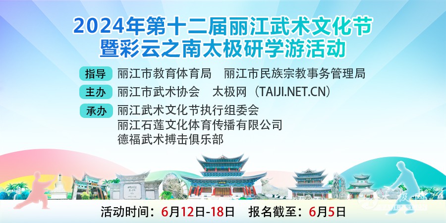 为积极响应国家体育总局、商务部、文旅部等部门于2024年3月印发的关于开展“体育赛事进景区、进街区、进商圈” 活动的号召,进一步促进体育与文旅深度融合发展,2024年第十二届丽江武术文化节暨彩云之南太极研学游活动即将启动,诚邀天下太极人,游学彩云之南。 作为中国体育旅游精品赛事之一,丽江武术文化节始终积极响应政府号召,不断调整和完善办赛模式,根据历届赛事活动反馈及广大拳友建议,经组委会研究决定,第十二届武术文化节将轻装上阵,暂不设置传统场馆武术比赛,并充分结合云南的丰富旅游资源,以太极研学为主题,组织太极人进景区、进街区、进商圈,集云南多景点游览体验、太极展演、名家论坛/展演于一体,为广大参会者带来极具意义的太极之旅。