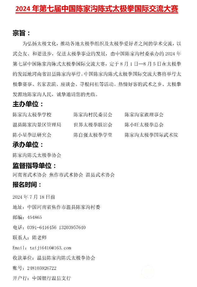 2024年第七届陈家沟陈式太极拳国际交流大赛竞赛规程 (一)陈式太极拳老架、新架、小架,演练时间3—5分钟。(二)陈式太极器械:短器械、长器械、双器械、其它器械,演练时间不少于1分钟。(三)集体项目:4至12人(含4人),男、女不限,拳、械内容不限,必须配乐(音乐自备),演练时间3—5分钟。(一)各代表队可派领队1人,医生1—2人,太极拳、械套路运动员人数及男、女不限。(二)太极拳、械套路每人限报拳术、器械各一项,每队限报1个集体项目。1、传统陈式太极拳、械套路与陈式竞赛套路运动员年龄分组参赛运动员报到时需提供县级以上医院出具的健康证明或报到期间运动员向大会签定的健康保证书。在比赛中,运动员由于健康原因出现的意外事故,均由本人(或本队)负责。太极推手运动员必须办理人身意外伤害保险。(二)传统太极拳套路必须是以最具传统风格特点为基本内容的套路形式。(三)集体项目每少一人在本队集体项目的最后得分中扣0.5分;未配音乐者,在集体项目的最后得分中扣0.2分。(四)本次比赛采用原国家体委审定的1993年《中国太极拳、剑竞赛规则》,集体项目采用全国太极拳锦标赛《集体项目评分标准》;太极散手采用中央五台举办的武林大会竞赛规则。(五)运动员的参赛服装不作规定,但要体现出民族特色、项目特色、运动特色和时代特色。(一)各组别各单项男女分别录取一等奖(四分之一)、二等奖(四分之二)。(三)太极散手:各组别各级别男、女分别录取前8名。(四)太极散手各级别或集体项目不足8人(队)时,减一录取,2人以内不录取名次;未进入名次和未获得一、二等奖的颁发表演奖。(五)设“体育道德风尚奖”和“优秀组织奖”(评定办法另定)。各参赛队或个人需填写好电子档报名表后,发送电子版至taiji6416@163.com邮箱,报名截止时间2024年7月18日。电话:13203957640 15225880058(二)报到:各参赛队、裁判员于8月1日到陈家沟村委,报到时各参赛队需交验身份证复印件、健康证明,散手运动员审验人身意外伤害保险单。8月1日晚7:30召开领队、教练员会议,务必准时参加。8月1日晚8:00散手运动员在陈家沟村委称量体重(一)各队交通费、食宿费自理。大会介绍住宿宾馆。各参赛队和个人需提前与组委会预定,标准为每人100元/天,每人150元/天两个档次。(二)本着以武养武,以赛养赛的精神,为弥补组织竞赛经费不足,每位与会人员需交会务费150元、参赛费450元(报到现场缴纳费用)。(三)比赛时如需临时更改参赛项目,每更改一项需交费500元。(一)仲裁委员会组成后,严格按照《仲裁委员会条例》执行。 |