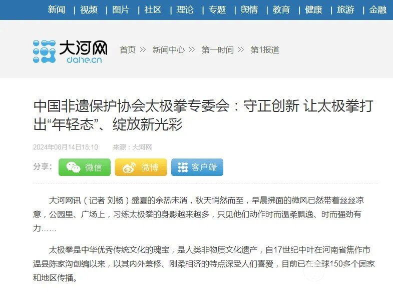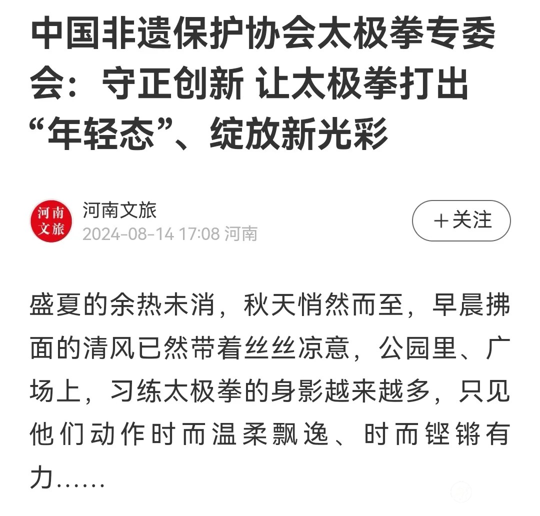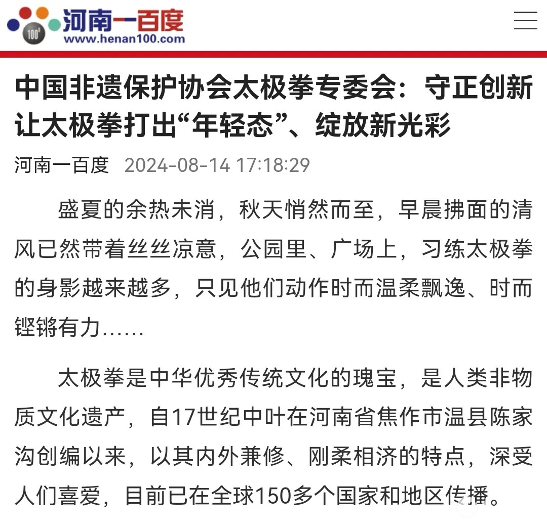 盛夏的余热未消,秋天悄然而至,早晨拂面的清风已然带着丝丝凉意,公园里、广场上,习练太极拳的身影越来越多,只见他们动作时而温柔飘逸、时而铿锵有力…… 太极拳是中华优秀传统文化的瑰宝,是人类非物质文化遗产,自17世纪中叶在河南省焦作市温县陈家沟创编以来,以其内外兼修、刚柔相济的特点,深受人们喜爱,目前已在全球150多个国家和地区传播。 进入新时代,在习近平文化思想指引下,中国非物质文化遗产保护协会太极拳专业委员会坚持保护、传承、弘扬的原则,守正创新、主动求变,积极推动太极拳“年轻化、时尚化、数字化、国际化”,太极拳正在焕发新的生机。 赓续文化基因 汇聚太极拳保护传承发展合力 洛水微波,黄河浩荡,位于河洛交汇处北岸的焦作温县陈家沟,是太极拳的发源地。其融合了健身、养生、悟道等功能,被誉为中华武术的精粹、东方文化的瑰宝,是黄河文化重要的代表性符号,是中国连接世界的国家名片。 “太极拳对于习练者的性别、年龄、体质、职业、民族没有限制,通过习练太极拳,人们在修身养性、强身健体的同时,也传承着中华民族的文化基因。”陈氏太极拳第十二代传人、省级代表性传承人陈炳在接受记者采访时说。 2020年太极拳被列入联合国教科文组织人类非物质文化遗产代表作名录。为广泛凝聚各方力量,推进太极拳的保护、传承和发展,2021年2月1日,中国非物质文化遗产保护协会太极拳专业委员会成立。 “专委会主要围绕太极拳的‘年轻化、时尚化、数字化、国际化’这条主线,叫响‘生命的能量 人类的遗产’,聚力陈氏、和氏、杨氏、武氏、吴氏、李氏、王其和等太极拳七大社区,联动政府部门、社会团体,坚持守正创新,积极推动太极拳的保护传承弘扬。”中国非物质文化遗产保护协会太极拳专业委员会主任姜继鼎说。