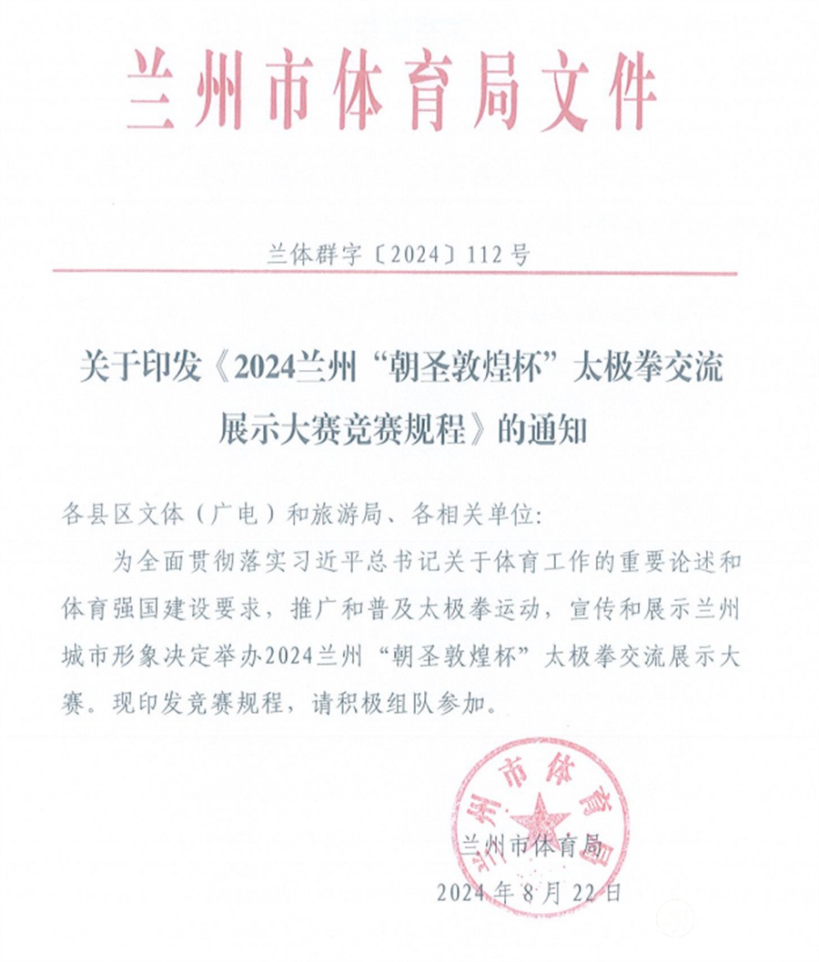 2020年由甘肃省太极拳协会、未来四方集团、太极网联合发起举办“文武盛会 朝圣敦煌——首届敦煌武术交流大赛”,来自全国各地的三百余名武术爱好者以武会友,相聚甘肃敦煌,共襄武术文旅盛会。2024年,经甘肃省太极拳协会与兰州市体育局协商决定,2024兰州“朝圣敦煌杯”太极拳交流展示大赛将于兰州市奥体中心网球馆举办,未来四方集团与太极网承办。太极英豪齐聚首,黄河之滨引客来。同时本届大赛设置现金大奖,团体(10人以上)总分前八名共有两万余元奖励,其中第一名6000元,第二名4000元,第三名3000元。 2024兰州“朝圣敦煌杯”太极拳交流展示大赛 竞赛规程 一、赛事名称 2024兰州“朝圣敦煌杯”太极拳交流展示大赛 二、主办单位 兰州市体育局 甘肃省太极拳协会 三、承办单位 未来四方集团 太极网 四、协办单位 兰州市全民健身指导中心 七里河区文化体育和旅游局 兰州奥体中心建设发展有限公司 城关区文化和旅游发展行业协会 五、比赛时间和地点 时间:10月11日-13日 地点:兰州奥体中心网球馆 六、参赛范围 省内外太极拳爱好者,个人或团体均可报名参赛。 七、竞赛项目 (一)个人项目 1.规定项目:陈式太极拳、杨式太极拳、吴式太极拳、武式太极拳、孙式太极拳、42式太极拳、24 式太极拳、42 式太极剑、32式太极剑、太极(八法五步)、其他武术类竞赛项目;2.传统项目:陈式太极拳(器械)、杨式太极拳(器械)吴式太极拳(器械)、孙式太极拳(器械)、武式太极拳(器)其他拳术传统项目(器械)。 (二)对练项目 1.太极拳徒手对练、号器械对练(含徒手与器械对练) 2.传统武术对练、器械对练(含徒手与器械对练) (三)集体项目 1.集体太极拳、械项目(含器械和拳术混编) 2.集体其他武术类拳、械项目(含器械和拳术混编) 八、参赛办法 (一)以各代表队为单位统一组队参赛,每队限报领队、教练各1名,运动员不限,个人可直接通过网上报名。 (二)每位运动员可报拳、器械各一项,可兼报对练和集体项目。每支运动队限报集体拳术、器械任选一个项目,每增加20人可增报1个集体项目,但每名运动员只能兼报一个集体项目。 (三)集体项目人数不得少于6人、多于20人,少于或多于规定人数则按照规则扣分。运动员性别、年龄组别不限,可混合编组。 (四)年龄分组 儿童组:(A)11周岁以下(2013年以后出生者) 少年组:(B)12岁至17岁(2007年12月31日至2012年1月1日出生者) 青年组:(C)18岁至39岁(2006年12月31日至1986年1月1日出生者) 中年组:(D)40岁至59岁(1985年12月31日至1965年1月1日出生者) 老年组:(E)60岁至70岁(1964年12月31日至1954年1月1日出生者) (五)个人套路项目按性别、年龄、拳种和器械类分组,不足五人与其他组别合并编组。 (六)对练项目按拳种分组 (七)集体项目不分年龄、性别,按集体拳术、集体器械分组,拳术与器械混编的按器械类编组。 (八)运动员个人必须购买个人意外伤害险,费用统一由承办方负责代为购买,每人16元。 (九)运动员报到时需提供健康体检报告(赛前15天内由县级以上医院出具的心电图、血压和脉搏检查证明)。 九、竞赛办法 (一)比赛执行中国武术协会审定的2024《传统武术套路竞赛规则》及有关补充规定。 (二)规定项目中陈式、杨式、吴式、孙式、武式、42式太极拳和42式太极剑均为原国家体委武术研究院审定的竞赛套路。 (三)完成套路时间 1.太极拳规定项目为 3-6分钟; 2.太极拳传统项目 3-4 分钟: 3.太极器械项目为 2-3分钟; 4.太极对练为 2-3分钟; 5.其他拳术及器械时间按照《传统武术套路竞赛规则》执行; 6.集体项目拳术、器械均为3-5分钟(除八法五步)。 (四)规定项目必须按照动作顺序演练,不得增减或改变动作。每增减一个动作或每改变动作一次,均扣0.1分,累计扣分。 (五)集体项目须配音乐(自备音乐,MP3格式)。音乐中不得出现说唱等内容,若出现说唱,由裁判长总扣0.1分;未配乐者,由裁判长总扣0.1分。比赛时,由本队教练或领队负责播放音乐。 十、录取与奖励办法 (一)个人项目:按各单项各年龄组别男、女分别录取设奖。-等奖 30%、二等奖40%、三等奖30%,颁发奖牌、证书。 (二)太极对练:徒手对练、器械对练(含徒手与器械对练)分别录取,一等奖30%、二等奖40%、三等奖30%,颁发奖牌、证书。 (三)集体项目:按拳术类、器械类(含拳械混编)分别录取,一等奖30%、二等奖30%、三等奖40%,颁发奖牌。 (四)团体总分奖 1.个人项目、对练前3名按6、4、2分计入团体总分,集体项目拳术类、器械类(含拳械混编)的一、二、三等奖,分别按6、4、2分,加倍计入团体总分。 2.团体总分录取前八名,(报名人数不足10人的队不计团体总分),颁发奖牌、奖金。奖励标准:第一名6000元,第二名 4000元,第三名 3000元,第四名 2500元,第五名 2000 元、第六名 1500元,第七名1000元,第八名500元。如团体总分相等,第一名多者名列前,如仍相等以此类推。 (五)设武德风尚奖、优秀组织者奖,评选办法另定。 十一、报名与报到 (一)报名 1、报名时间为2024年9月1日-9月25日。报名时需提供《参赛报名表》(附件1)、《责任声明书》(附件2)、身份证复印件。 2.报名联系方式: 甘肃省太极拳协会: 毛老师17726958897(微信同号) 张老师13919025706(微信同号) 邮箱:116273163@qq.com。 太极网: 邓豪杰13007659881 田丽17703916070 郭蕾13839131859 杨超15239150487 (二)报到 1.各参赛队及参赛个人于2024年10月10日下午18:00前到兰州市(组委会指定酒