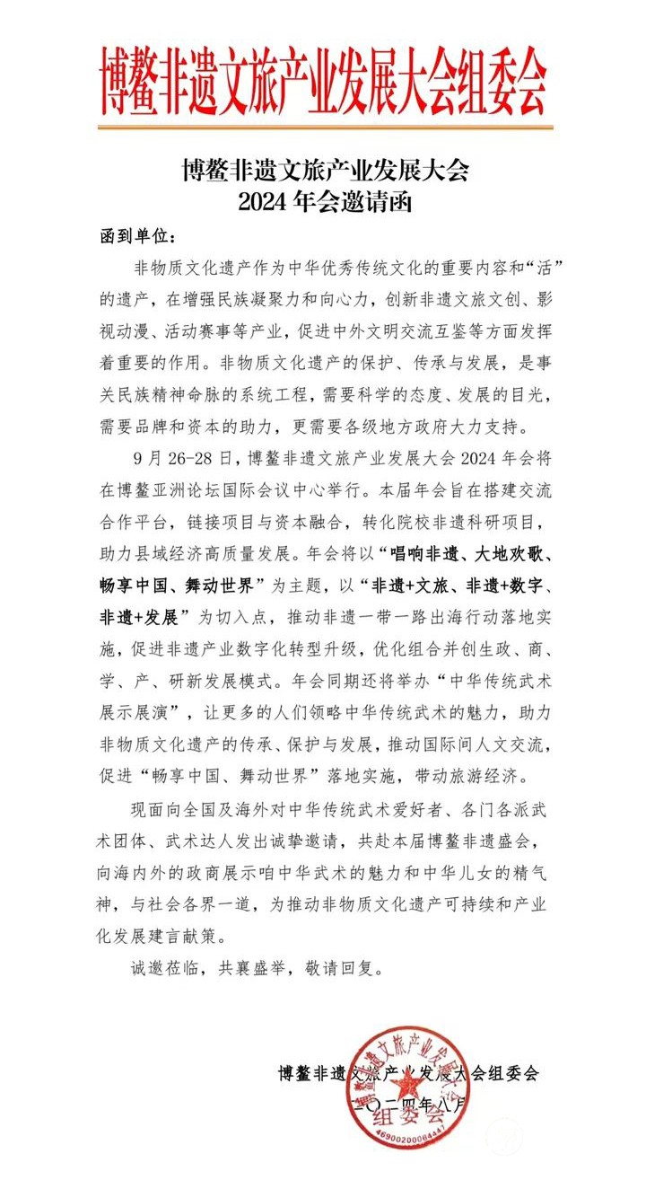 博鳌非遗文旅产业发展大会 2024年会邀请函 函到单位: 非物质文化遗产作为中华优秀传统文化的重要内容和“活”的遗产,在增强民族凝聚力和向心力,创新非遗文旅文创、影视动漫、活动赛事等产业,促进中外文明交流互鉴等方面发挥着重要的作用。非物质文化遗产的保护、传承与发展,是事关民族精神命脉的系统工程,需要科学的态度、发展的目光,需要品牌和资本的助力,更需要各级地方政府大力支持。 9月26-28日,博鳌非遗文旅产业发展大会2024年会将在博鳌亚洲论坛国际会议中心举行。本届年会旨在搭建交流合作平台,链接项目与资本融合,转化院校非遗科研项目,助力县域经济高质量发展。年会将以“唱响非遗、大地欢歌、畅享中国、舞动世界”为主题,以“非遗+文旅、非遗+数字、非遗+发展”为切入点,推动非遗一带一路出海行动落地实施,促进非遗产业数字化转型升级,优化组合并创生政、商、学、产、研新发展模式。年会同期还将举办“中华传统武术展示展演”,让更多的人们领略中华传统武术的魅力,助力非物质文化遗产的传承、保护与发展,推动国际间人文交流,促进“畅享中国、舞动世界”落地实施,带动旅游经济。 现面向全国及海外对中华传统武术爱好者、各门各派武术团体、武术达人发出诚挚邀请,共赴本届博鳌非遗盛会,向海内外的政商展示咱中华武术的魅力和中华儿女的精气神,与社会各界一道,为推动非物质文化遗产可持续和产业化发展建言献策。 诚邀莅临,共襄盛举,敬请回复。 博鳌非遗文旅产业发展大会组委会 二〇二四年八月 大会组委会联络人 张永林 136 5809 5066(秘书长) 吴传奎 138 1047 3459(中心主任) 刘玉强 151 0065 5555(中华武术) 胡 乾 199 1711 8860(中华武术) 刘洪奇 189 0391 2231(中华武术) |