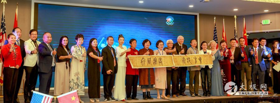 主持人张军先生、Michelle Liu 女士 为迎接2028年第34届洛杉矶奥林匹克运动会,本次庆典活动特别启动了“推动全民健身、武术与奥运健康同行”的系列活动,在未来的四年里将会联动中美两地、结合中美本土专业运动员、武术爱好者,举行各种武术推广交流及赛事活动,推动中华武术走进奧运、走向世界。美国中华艺术宫馆长鲁安博士现场赠送甲骨文书法作品《中华武术,奥运同行》。  主办方杨际洲先生【左一】,大会荣誉主席著名侨领张素久【中】、主办方盛丽娜女士【右一】