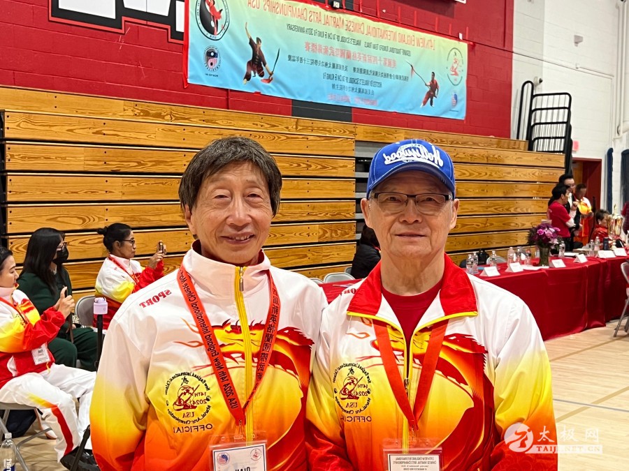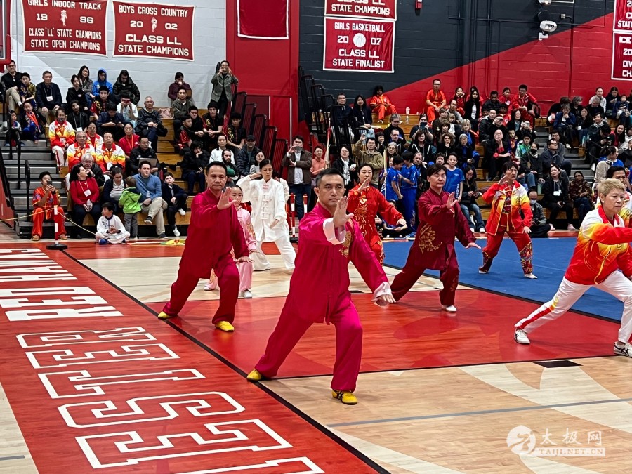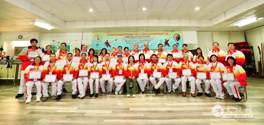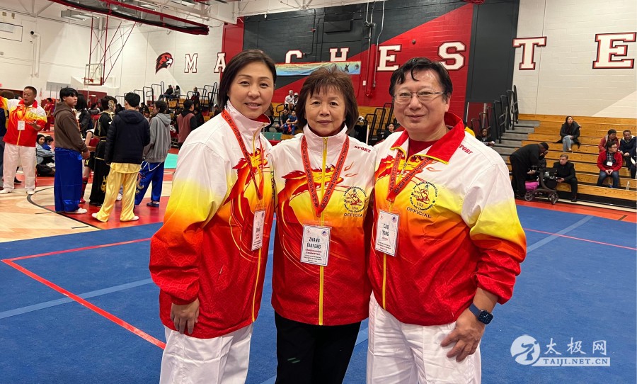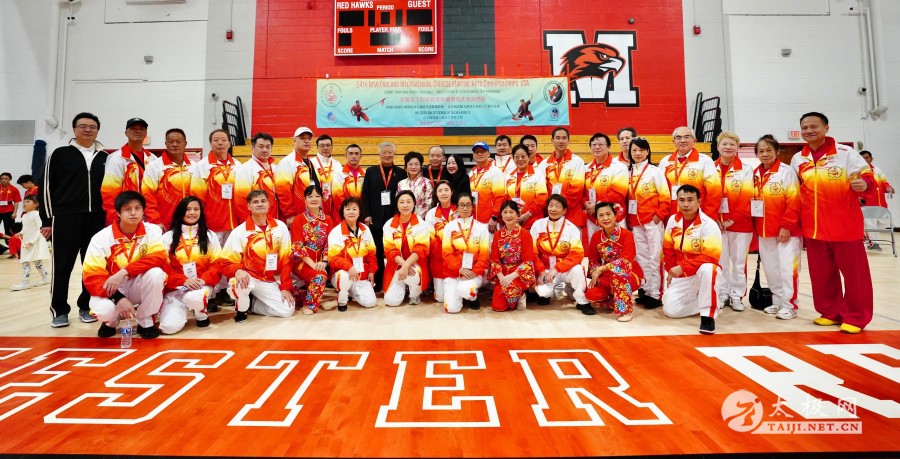 本次赛事武术国际级裁判、国家级裁判等合影(特邀记者钱承飞 )11月9日,美国第14届新英格兰国际武术锦标赛等赛事在康州孟彻斯特市高中体育场馆当天圆满闭幕,来自国内外350多名运动员等千余人参赛。其中85名运动员有幸可以参加明年举办的世界传统武术锦标赛。各运动队均有收获,这次美国河北武术学院由院长贾武忠带领的各族裔6名学员也获得上乘佳绩,来自美国得州奥斯汀教学的张芳女士获太极比赛六项金牌并获(女子40到59岁)全能冠军。  两位前世界太极拳冠军陈思坦、邹云建带领太极爱好者演练24式太极拳