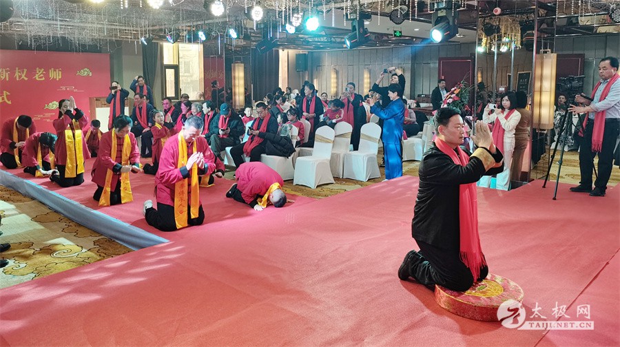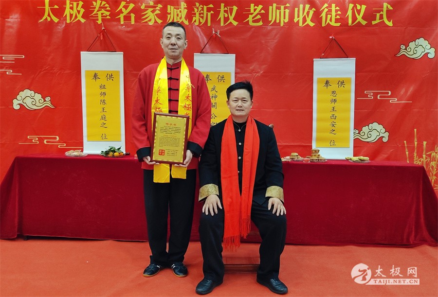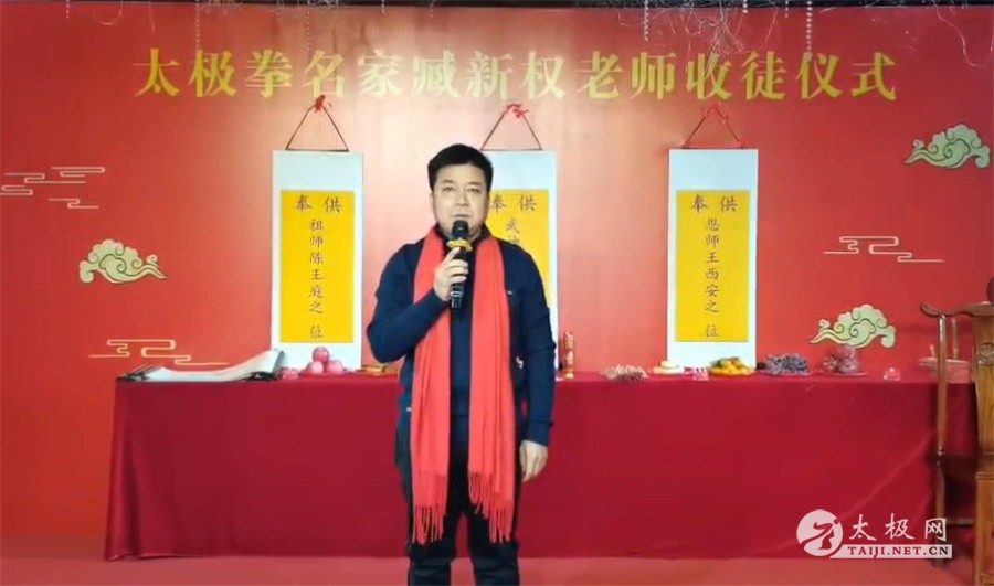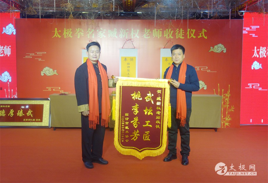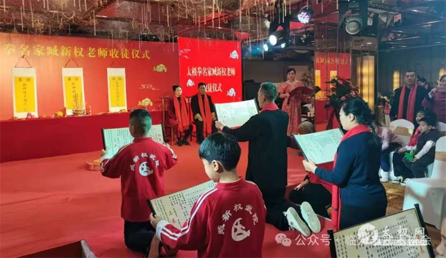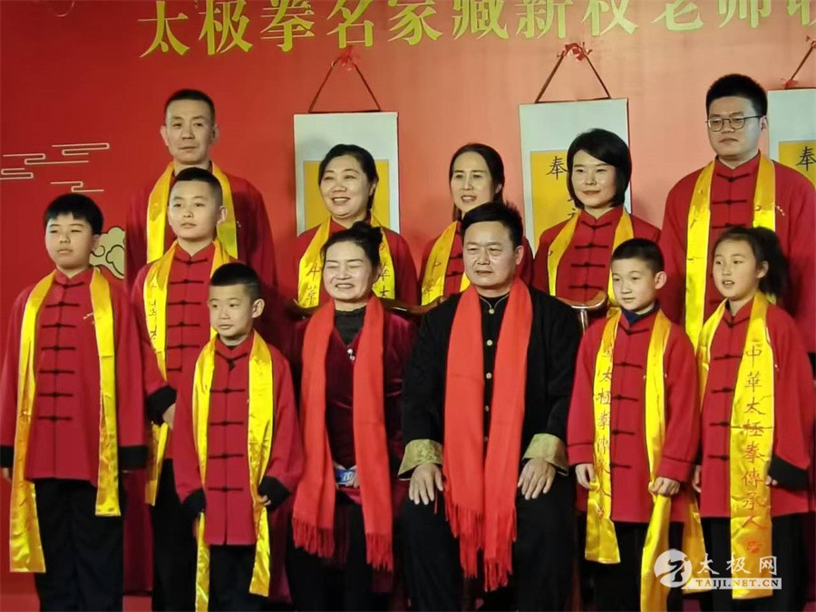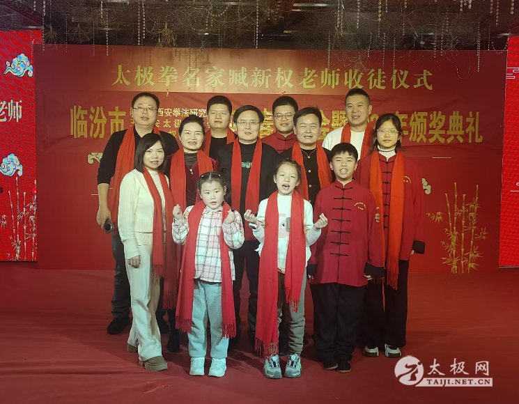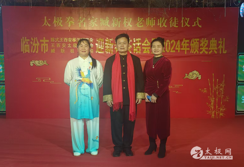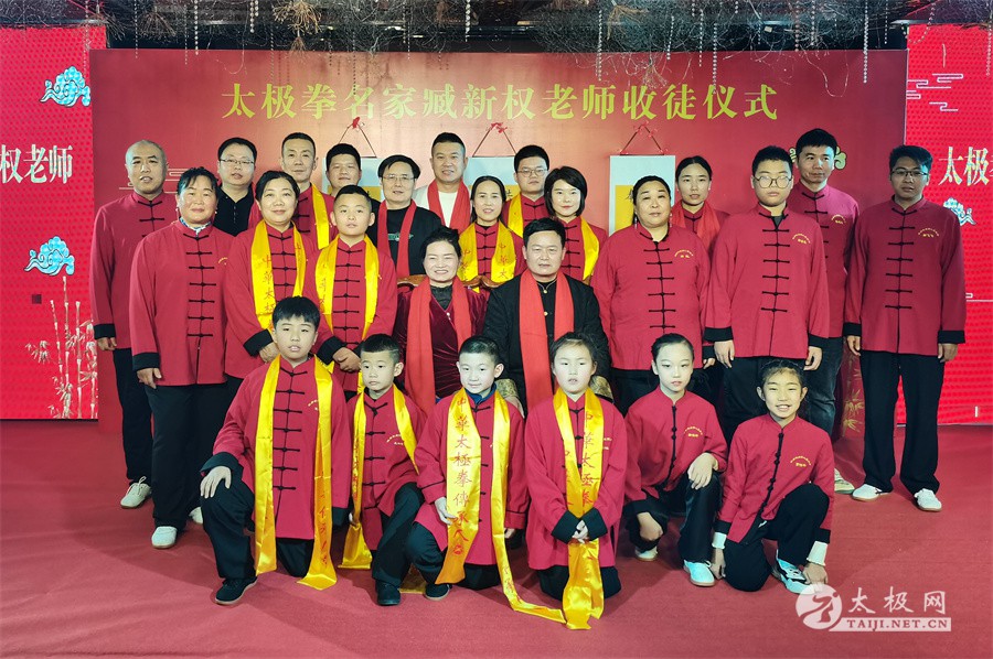 | (太极网讯)太极文化薪火相传,生生不息。2024年12月22日,王西安拳法研究会临汾分会会长、山西临汾臧新权武院院长臧新权收徒仪式在美仑国际酒店举行。宋文艺、邢桂花、尉丽娜、韩宝丽、臧辉、晋梓睿、文丞昕、白依鑫、成艺玮、王炜智10名太极拳爱好者被臧新权接纳为弟子,通过传统拜师仪式成为陈式太极拳第十三代传人。 臧新权,湖北天门臧家湾人,陈氏太极拳第12代传人,王西安大师亲传弟子。临汾市《臧新权武院》创始人,王西安拳法研究会临汾分会会长,山西省临汾市武术协会副秘书长,国家武术六段,国家一级武术裁判员,一级社会体育指导员,北京体育大学中级运动康养师,陈家沟太极拳高级教练,河南省高级拳师。