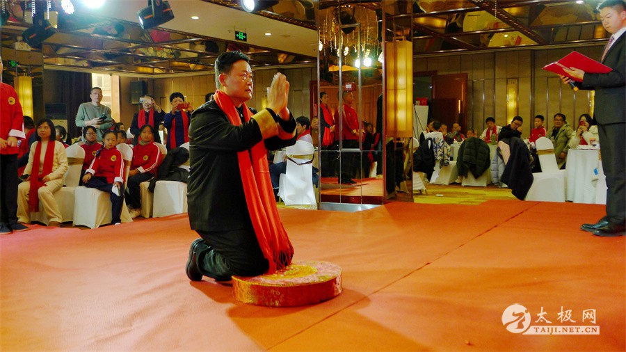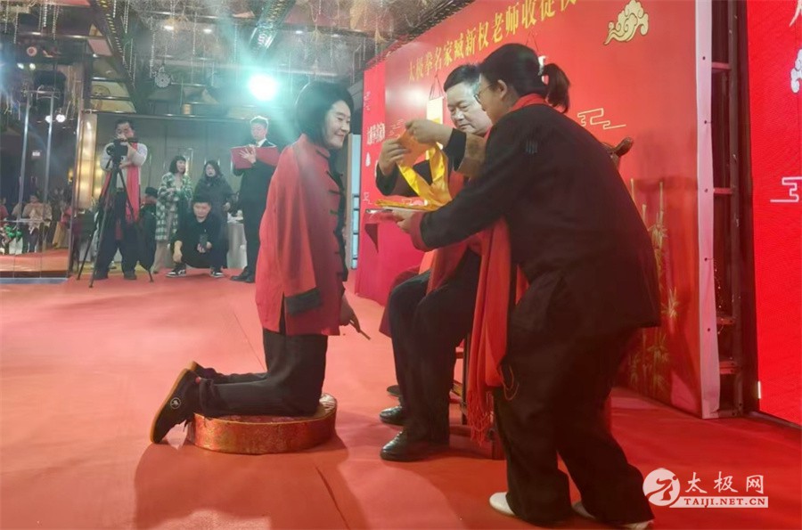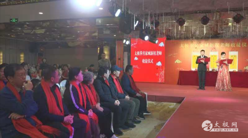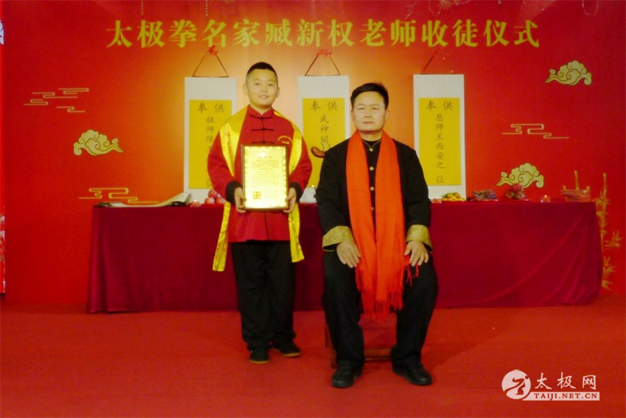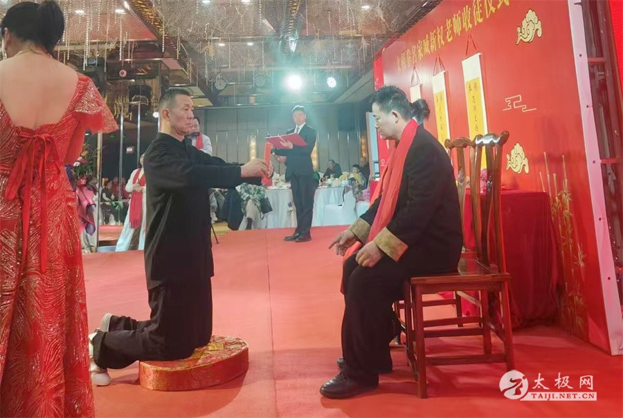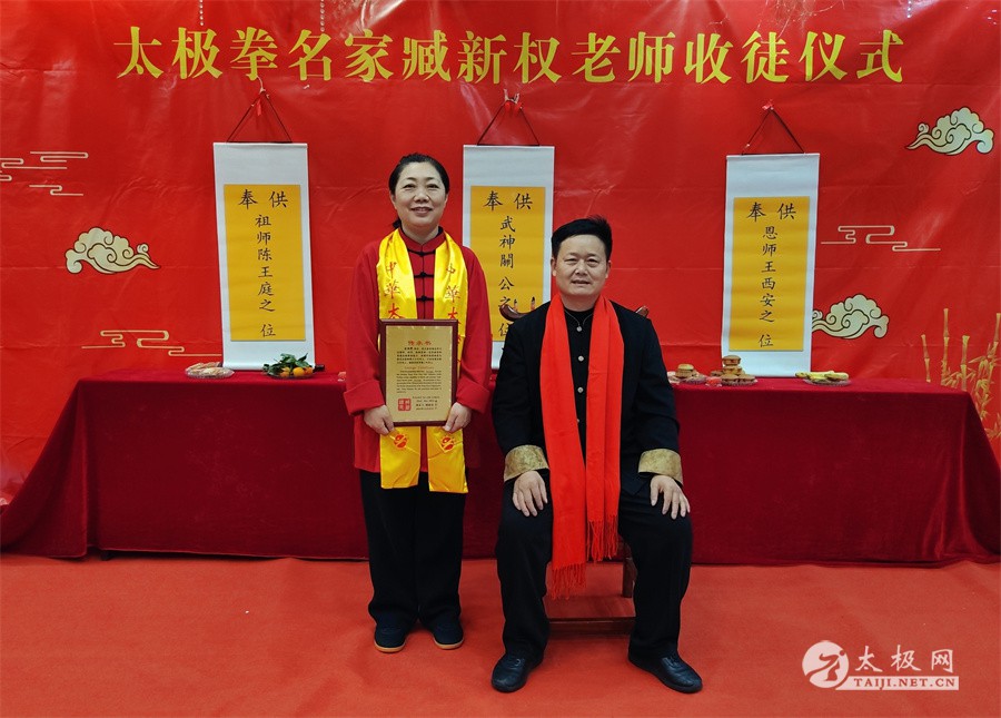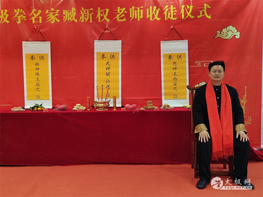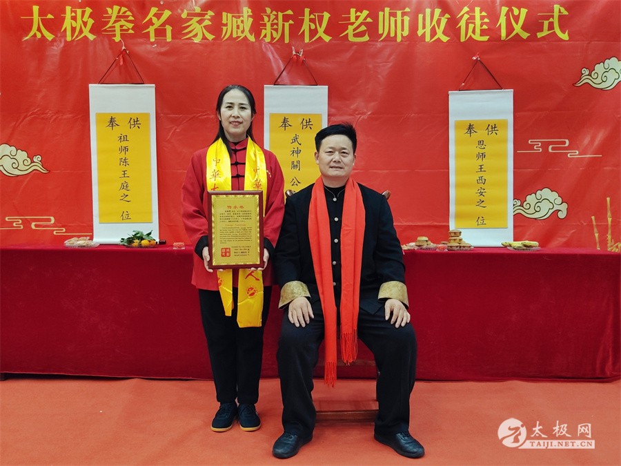 | (太极网讯)太极文化薪火相传,生生不息。2024年12月22日,王西安拳法研究会临汾分会会长、山西临汾臧新权武院院长臧新权收徒仪式在美仑国际酒店举行。宋文艺、邢桂花、尉丽娜、韩宝丽、臧辉、晋梓睿、文丞昕、白依鑫、成艺玮、王炜智10名太极拳爱好者被臧新权接纳为弟子,通过传统拜师仪式成为陈式太极拳第十三代传人。 臧新权,湖北天门臧家湾人,陈氏太极拳第12代传人,王西安大师亲传弟子。临汾市《臧新权武院》创始人,王西安拳法研究会临汾分会会长,山西省临汾市武术协会副秘书长,国家武术六段,国家一级武术裁判员,一级社会体育指导员,北京体育大学中级运动康养师,陈家沟太极拳高级教练,河南省高级拳师。