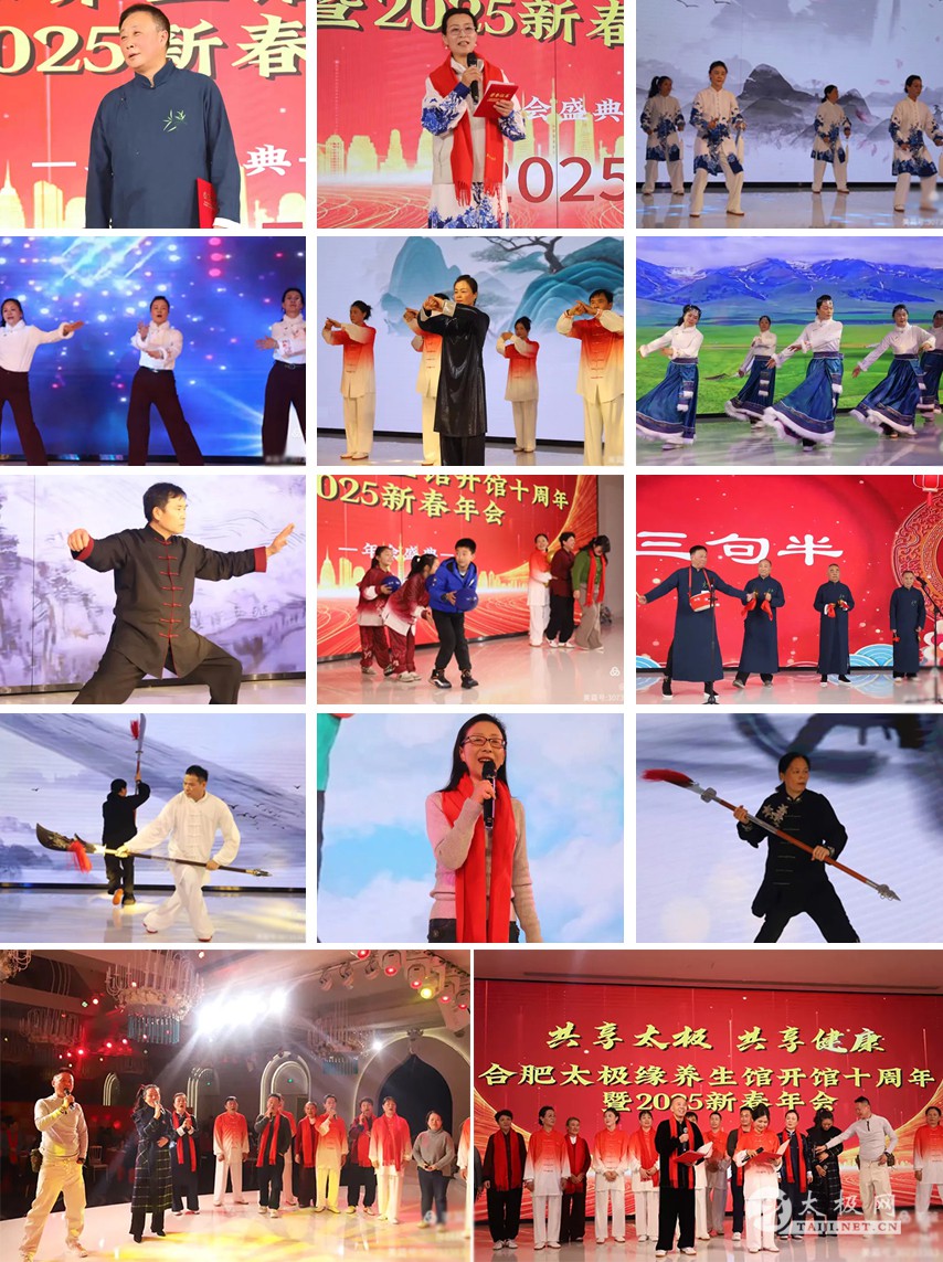 2025年1月5日,合肥太极缘养生馆在同庆楼宴会大厅内举办了开馆10周年庆典暨2025年新春年会。现场张灯结彩,座无虚席,气氛热烈非凡。众多拳友与嘉宾欢聚一堂,共同见证了这一荣耀时刻,并畅享了一场太极文化盛宴。 十年磨砺,风华正茂。庆典一开始,一段精心编排的视频引领大家回顾了拳馆十年来的发展历程。马智萍馆长深情回顾了太极缘自2015年创立以来的心路历程,分享了十年间与拳友们共同度过的美好而难忘的时刻,并对各界朋友的支持与帮助表达了衷心的感谢。同时,马老师也向大家送上了美好的新年祝福。她表示,将不忘初心,继续以传承太极文化为使命,开启下一个十年的崭新征程。 精彩的节目表演拉开序幕。大家精心筹备的节目种类繁多,不仅有经典的太极拳及太极器械表演,还有充满创意的禅舞、演唱、舞蹈和三句半等。这些节目充分展示了太极缘人的多才多艺和昂扬向上的精神面貌。尤其是太极拳的各种传统套路以及刀、剑、扇等表演,动作飘逸轻盈,犹如行云流水,美不胜收,动静结合间尽显太极的神韵,完美融合了力量与美感。精彩的表演配以完美的音乐,赢得了观众阵阵掌声与喝彩,现场气氛热烈非凡,高潮不断,宛如欢乐的海洋,大家的热情被不断点燃!