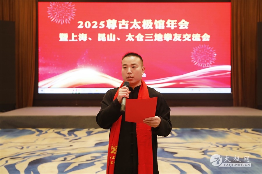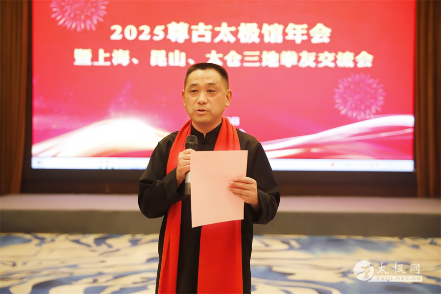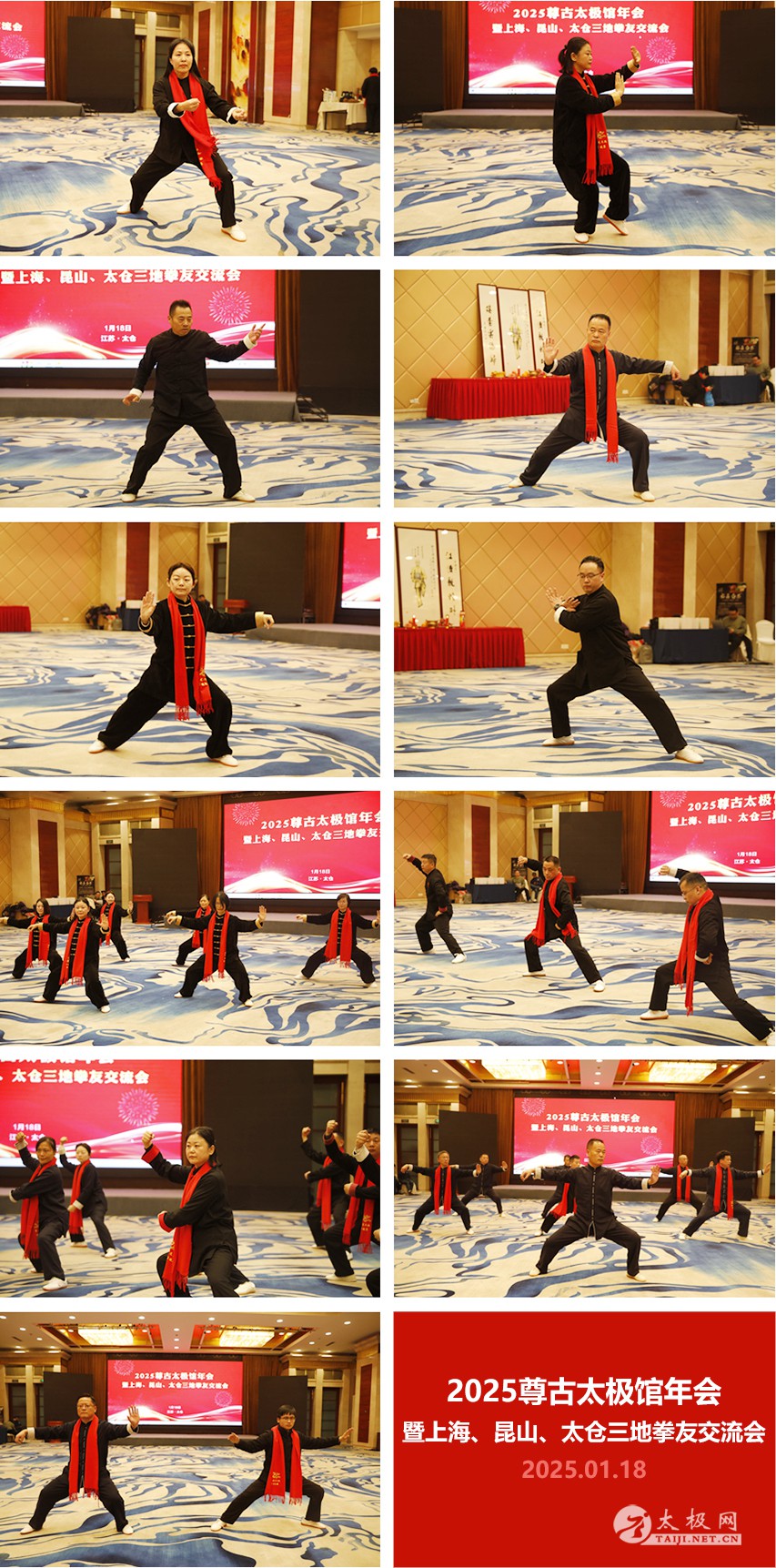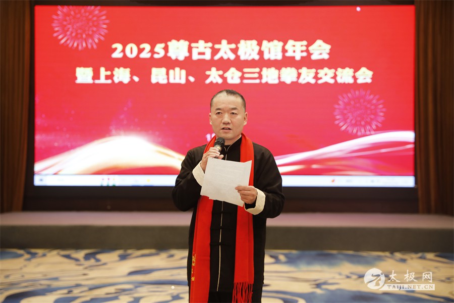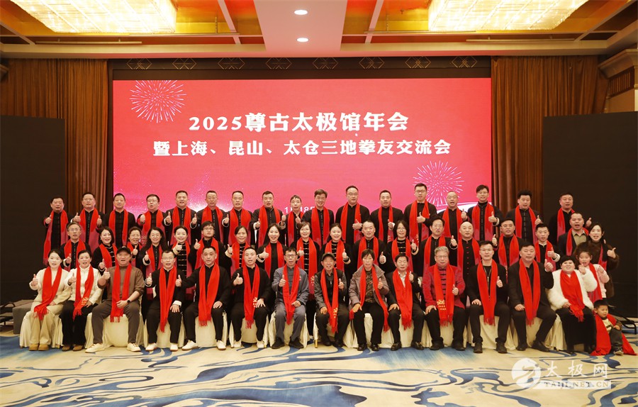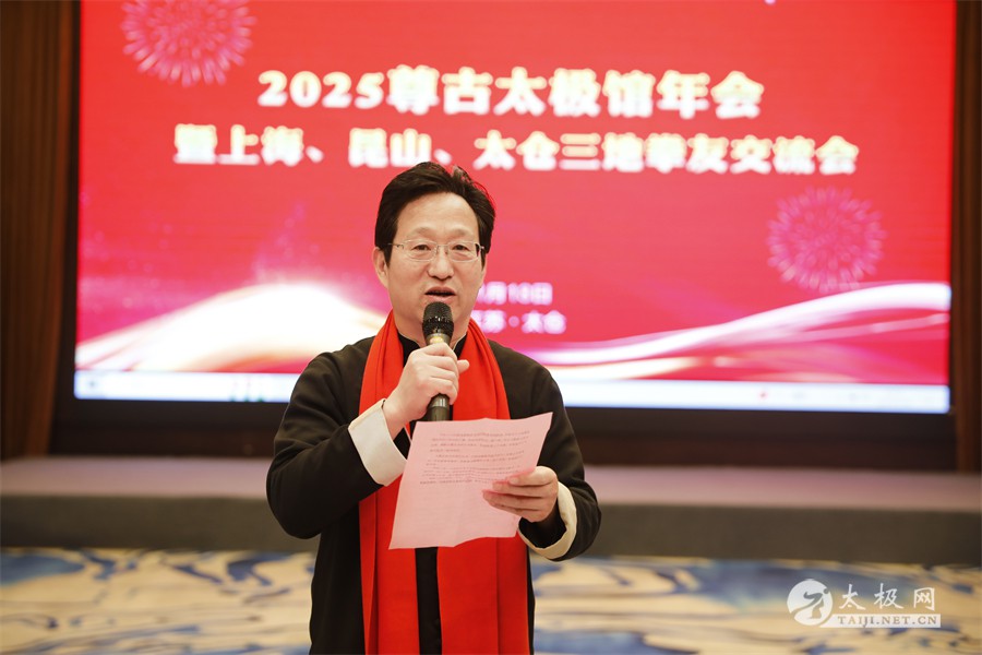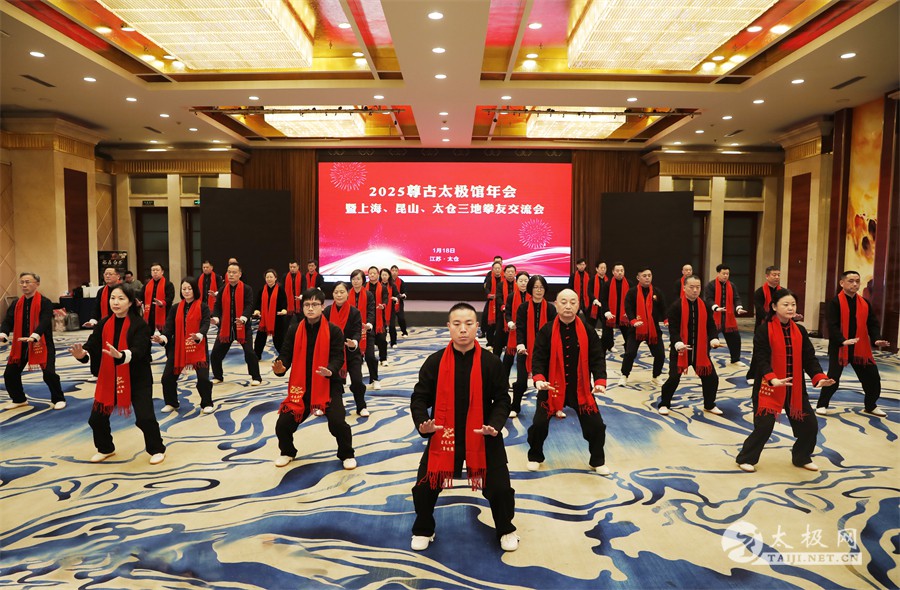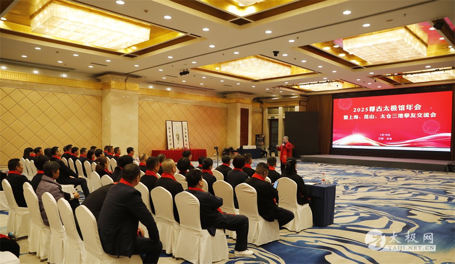 (太极网讯)武术之乡,太极盛会。1月18日,太仓锦江国际酒店内高朋满座、热闹非凡,2025年尊古太极馆年会暨上海、昆山、太仓三地拳友交流会在这里盛大启幕。太仓尊古太极馆馆长褚亚龙率50余名精英弟子与学员欢聚一堂,参与和见证这场年度盛会。太极拳祭祖、嘉宾致辞、汇报展演、名家展示、颁奖表彰、交流发言,精心筹备的活动在热烈和谐的氛围中有序展开。