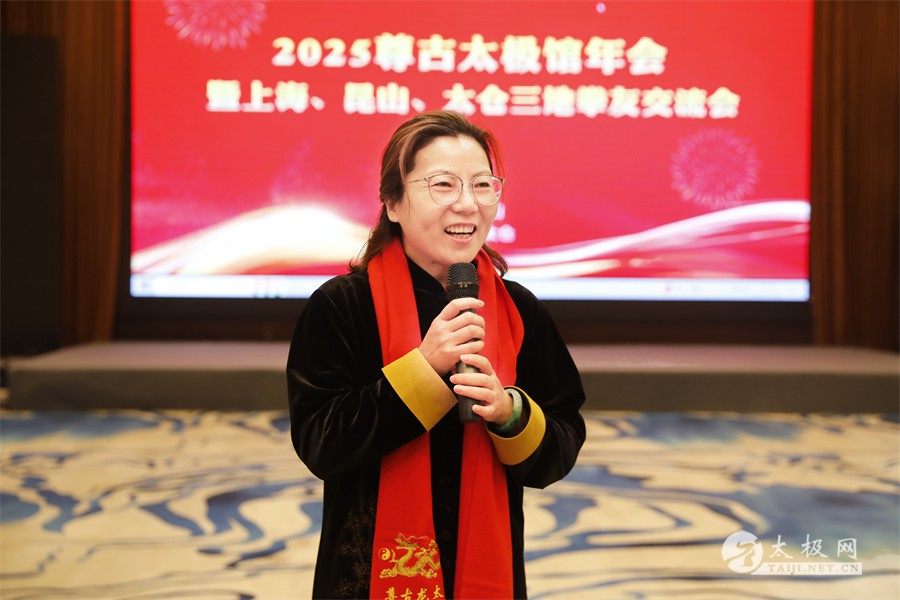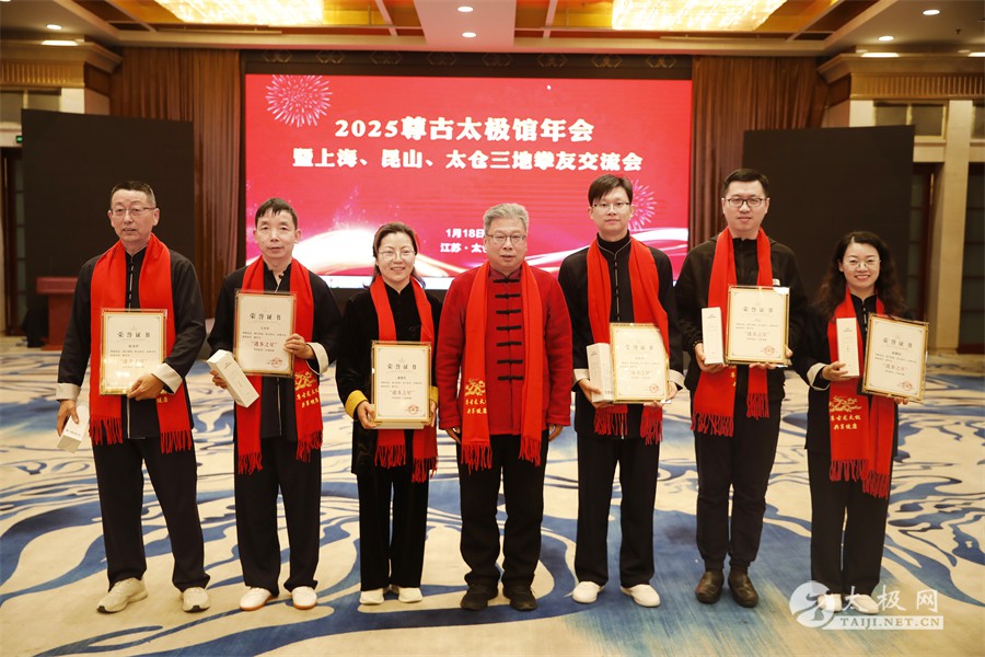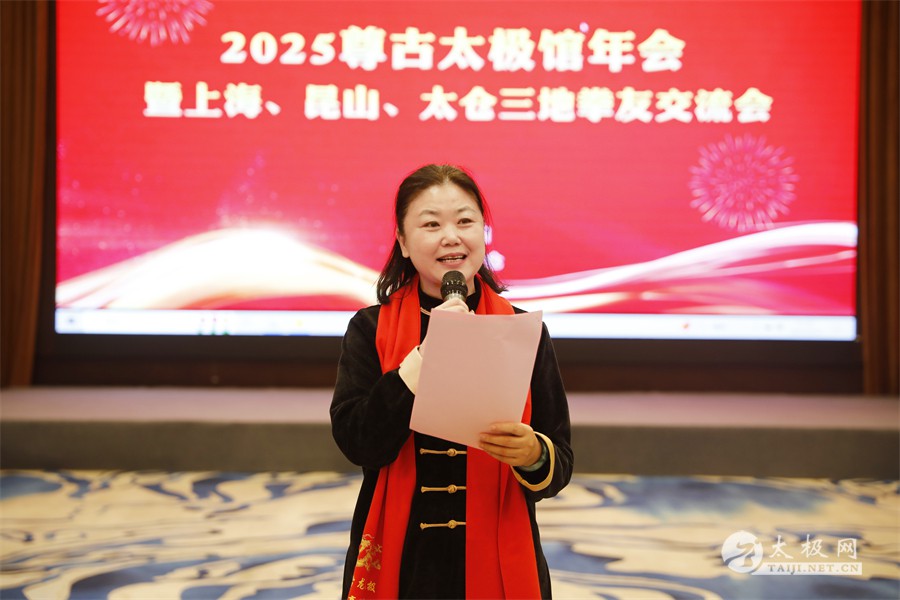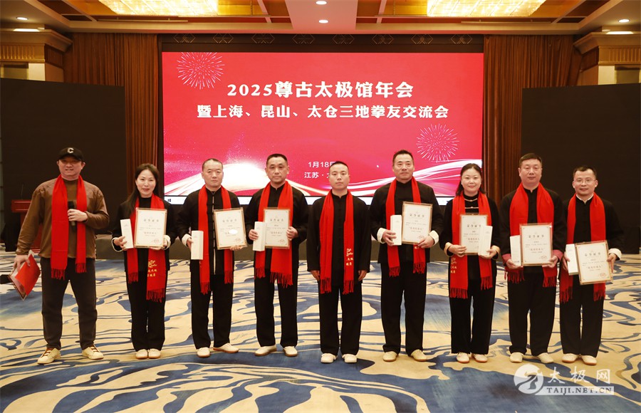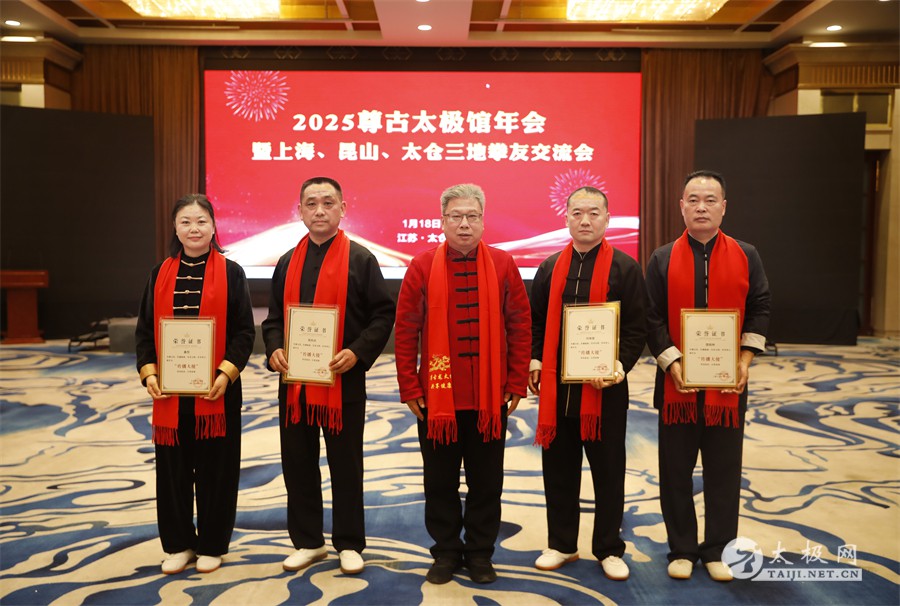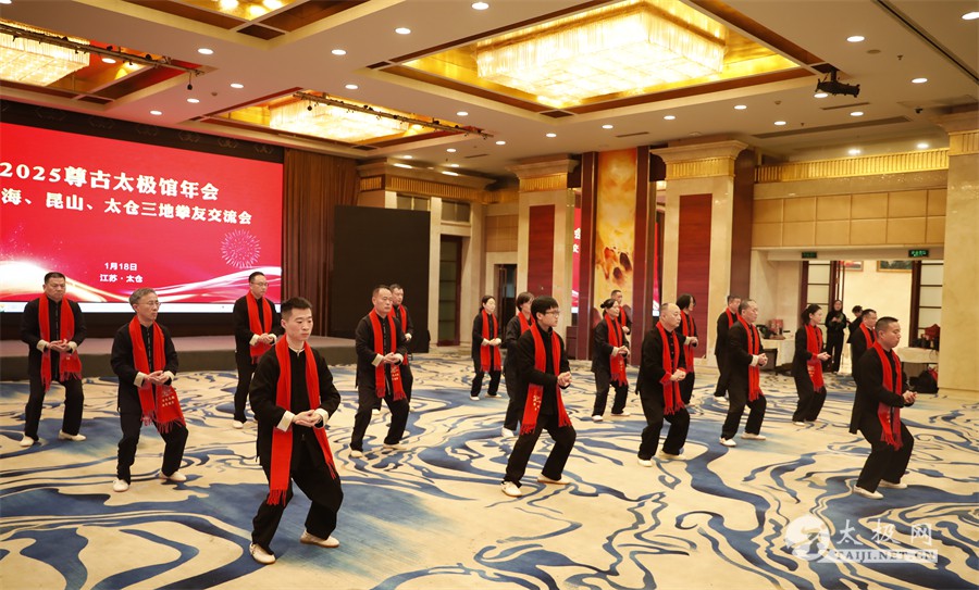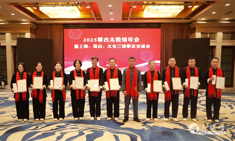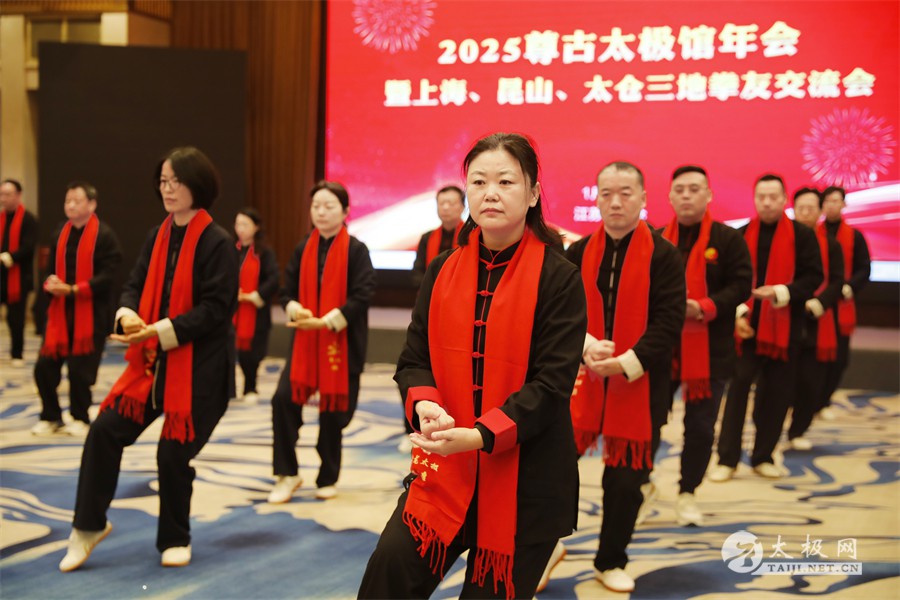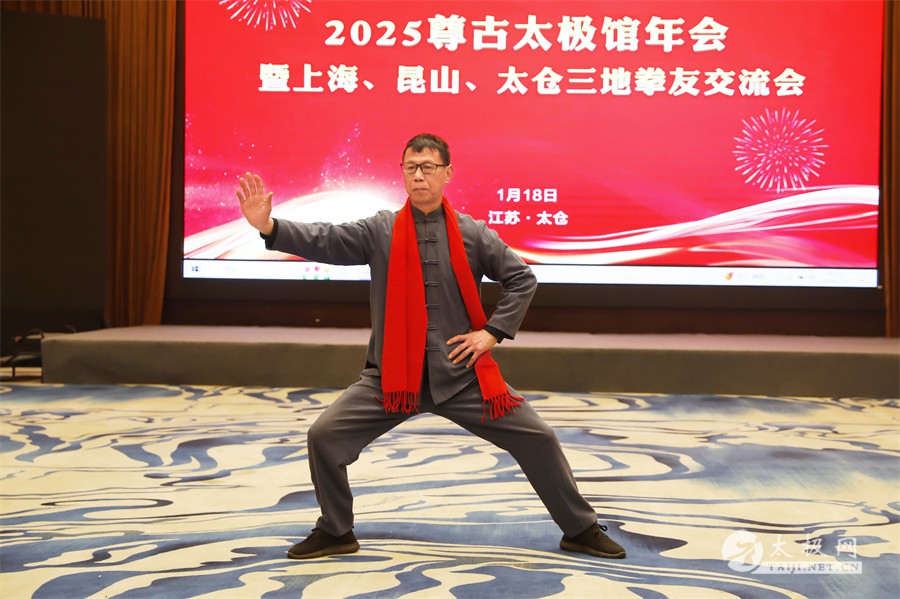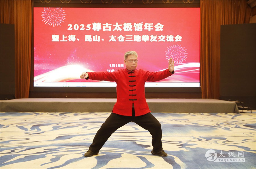 (太极网讯)武术之乡,太极盛会。1月18日,太仓锦江国际酒店内高朋满座、热闹非凡,2025年尊古太极馆年会暨上海、昆山、太仓三地拳友交流会在这里盛大启幕。太仓尊古太极馆馆长褚亚龙率50余名精英弟子与学员欢聚一堂,参与和见证这场年度盛会。太极拳祭祖、嘉宾致辞、汇报展演、名家展示、颁奖表彰、交流发言,精心筹备的活动在热烈和谐的氛围中有序展开。