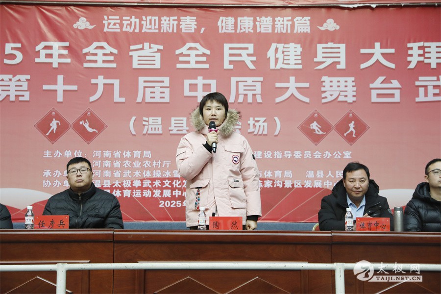 河南省武术体操冰雪运动中心社会体育科负责人陶然、副科长任彦兵,温县太极拳武术文化发展中心党组书记、体育运动发展中心党支部书记任海林,焦作市体育局群体科秦文星,温县赵堡镇镇长徐欣,太极拳优秀传承人陈志强等领导嘉宾出席活动。