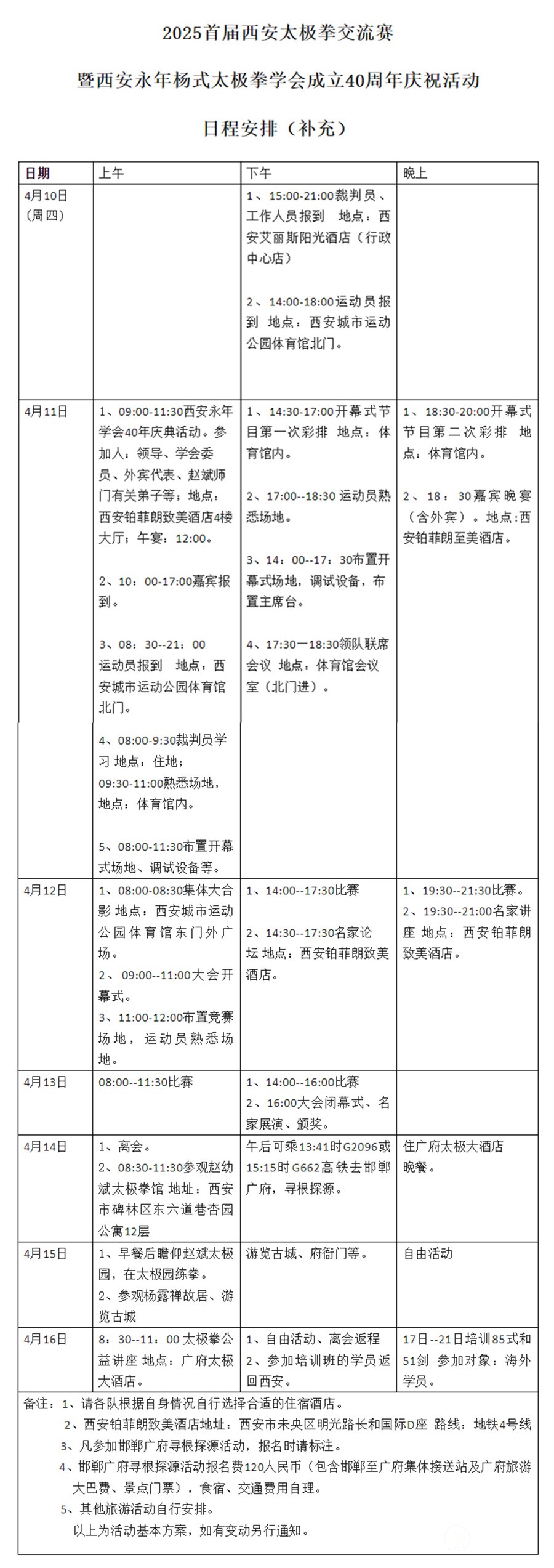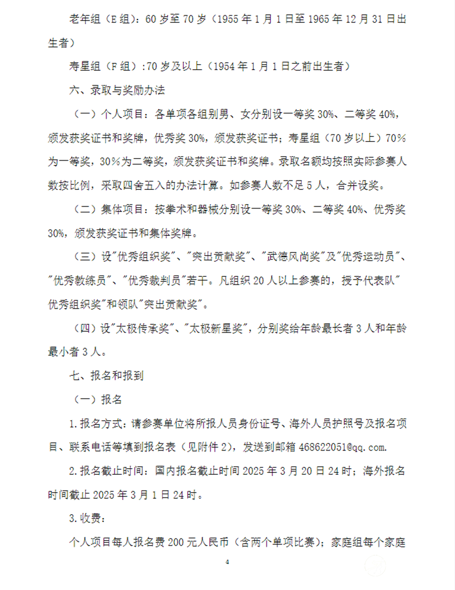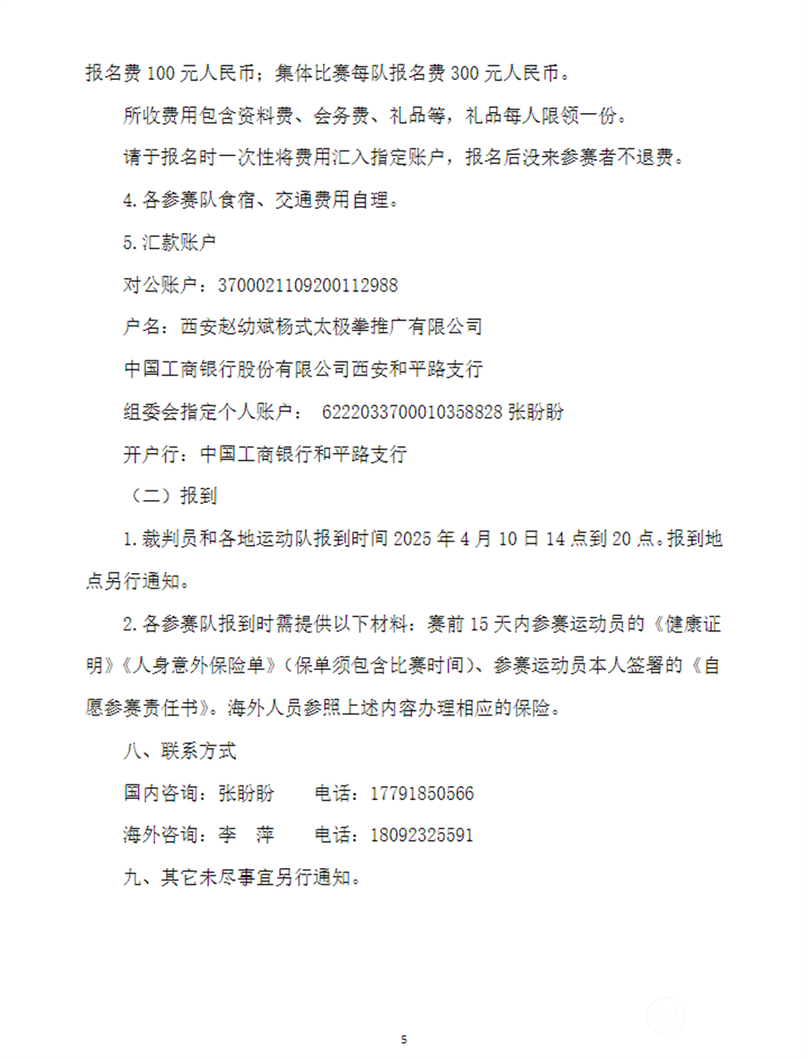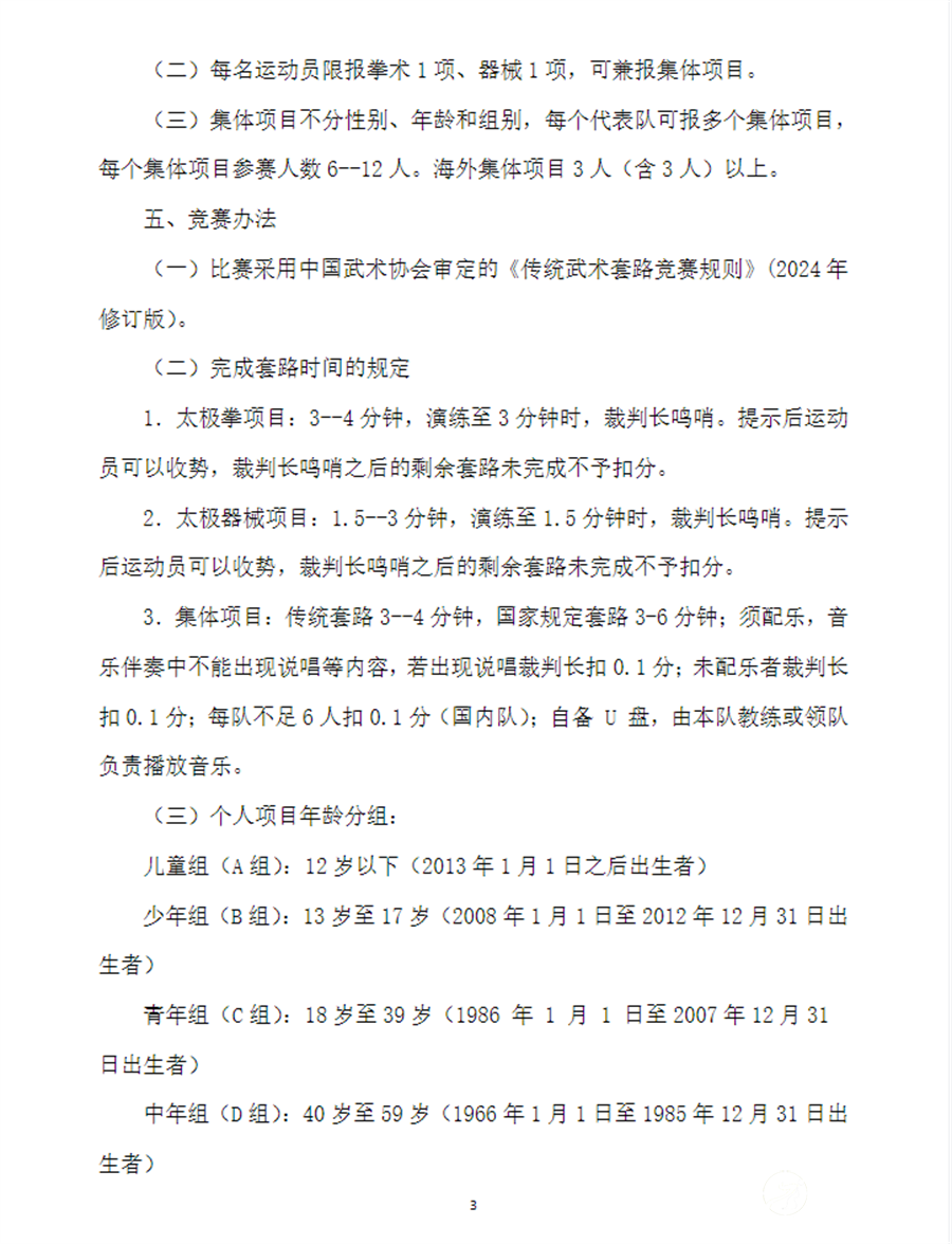 2025首届西安太极拳交流赛竞赛规程 一、竞赛日期和地点 日期:2025年4月10至14日(10日报到,14日离会) 地点:陕西省西安城市运动公园体育馆 地址:西安市未央区未央路168号 二、参赛单位 国内各武术协会、院校、武术太极拳社团组织及海外相关武术太极拳单位、团体和个人。 三、竞赛项目 (一)个人项目 1.国家规定项目:陈式太极拳、杨式太极拳、吴式太极拳、武式太极拳、孙式太极拳,24式太极拳、42式太极拳。 2.传统项目:陈式太极拳、陈式小架太极拳、杨式太极拳、吴式太极拳、武式太极拳、孙式太极拳、赵堡和式太极拳、王其和式太极拳,其他流派太极拳。 3.国家规定套路32式太极剑、42式太极剑;传统太极器械。 (二)集体项目 1.按拳术类、器械类(拳术和器械混编项目归器械类),不分年龄、性别参赛。 2.本次特设家庭组,夫妻或一家两代、三代组成,每个家庭限报一项。 四、参加办法 (一)每队可报领队、教练各1名,运动员人数不限。 (二)每名运动员限报拳术1项、器械1项,可兼报集体项目。 (三)集体项目不分性别、年龄和组别,每个代表队可报多个集体项目,每个集体项目参赛人数6--12人。海外集体项目3人(含3人)以上。 五、竞赛办法 (一)比赛采用中国武术协会审定的《传统武术套路竞赛规则》(2024年修订版)。 (二)完成套路时间的规定 1.太极拳项目:3--4分钟,演练至3分钟时,裁判长鸣哨。提示后运动员可以收势,裁判长鸣哨之后的剩余套路未完成不予扣分。 2.太极器械项目:1.5--3分钟,演练至1.5分钟时,裁判长鸣哨。提示后运动员可以收势,裁判长鸣哨之后的剩余套路未完成不予扣分。 3.集体项目:传统套路3--4分钟,国家规定套路3-6分钟;须配乐,音乐伴奏中不能出现说唱等内容,若出现说唱裁判长扣0.1分;未配乐者裁判长扣0.1分;每队不足6人扣0.1分(国内队);自备 U 盘,由本队教练或领队负责播放音乐。 (三)个人项目年龄分组: 儿童组(A组):12岁以下(2013年1月1日之后出生者) 少年组(B组):13岁至17岁(2008年1月1日至2012年12月31日出生者) 青年组(C组):18岁至39岁(1986 年 1 月 1 日至2007年12月31日出生者) 中年组(D组):40岁至59岁(1966年1月1日至1985年12月31日出生者) 老年组(E组):60岁至70岁(1955年1月1日至1965年12月31日出生者) 寿星组(F组):70岁及以上(1954年12月31日之前出生者) 六、录取与奖励办法 (一)个人项目:各单项各组别男、女分别设一等奖30%、二等奖40%,颁发获奖证书和奖牌,优秀奖30%,颁发获奖证书;寿星组(70岁以上)70%为一等奖,30%为二等奖,颁发获奖证书和奖牌。录取名额均按照实际参赛人数按比例,采取四舍五入的办法计算。如参赛人数不足5人,合并设奖。 (二)集体项目:按拳术和器械分别设一等奖30%、二等奖40%、优秀奖30%,颁发获奖证书和集体奖牌。 (三)设"优秀组织奖"、"突出贡献奖"、"武德风尚奖"及"优秀运动员"、"优秀教练员"、"优秀裁判员"若干。凡组织20人以上参赛的,授予代表队"优秀组织奖"和领队"突出贡献奖"。 (四)设"太极传承奖"、"太极新星奖",分别奖给年龄最长者3人和年龄最小者3人。 七、报名和报到 (一)报名 1.报名方式:请参赛单位将所报人员身份证号、回乡证、台胞证、护照海外人员护照号及报名项目、联系电话等填到报名表(见附件2),发送到邮箱468622051@qq.com. 2.报名截止时间:国内报名截止时间2025年3月20日24时;海外报名时间截止2025年3月1日24时。 3.收费:个人项目每人报名费200元人民币(含两个单项比赛);家庭组每个家庭报名费100元人民币;集体比赛每项报名费300元人民币。所收费用包含资料费、会务费、礼品等,礼品每人限领一份。请于报名时一次性将费用汇入指定账户,报名后没来参赛者不退费。 4.各参赛队食宿、交通费用自理。 5.汇款账户 对公账户:3700021109200112988 户名:西安赵幼斌杨式太极拳推广有限责任公司 中国工商银行股份有限公司西安和平路支行 组委会指定个人账户:6222 0337 0001 0358 828 张盼盼 开户行:中国工商银行和平路支行 微信支付:王雨婷 (二)报到 1.裁判员和各地运动队报到时间2025年4月10日14点到20点。报到地点另行通知。 2.各参赛队报到时需提供以下材料:赛前15天内参赛运动员的《健康证明》《人身意外保险单》(保单须包含比赛时间)、参赛运动员本人签署的《自愿参赛责任书》。港澳台、海外人员参照上述内容提供相应的保险证明,签署《自愿参赛责任书》,不需医院体体检证明。 八、联系方式 国内咨询:张盼盼 电话:17791850566 海外咨询:李 萍 电话:18092325591 九、其它未尽事宜另行通知。 2025首届西安太极拳交流赛组委会 |