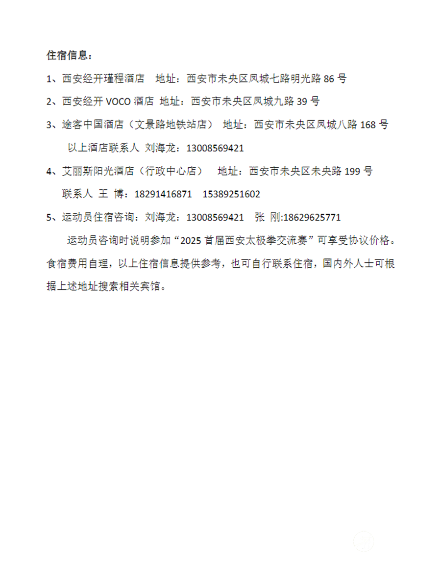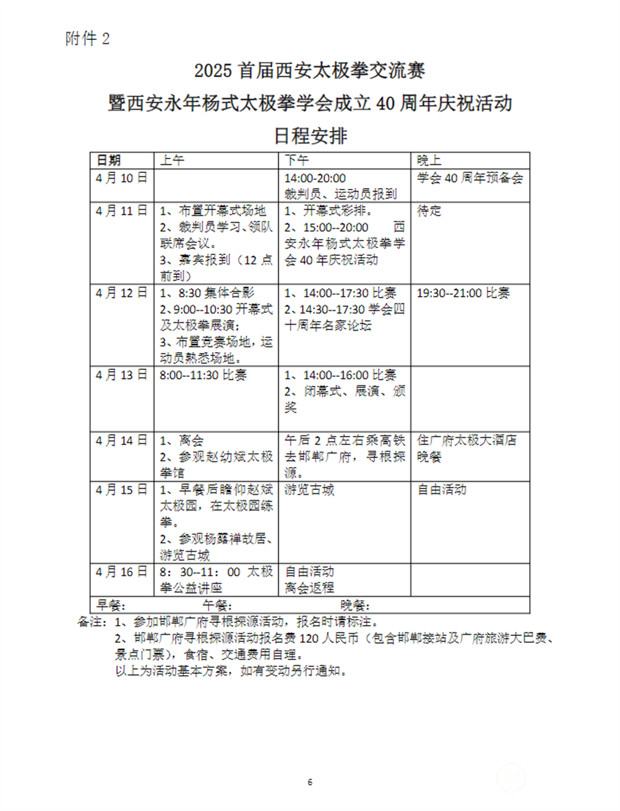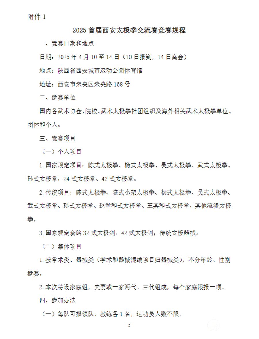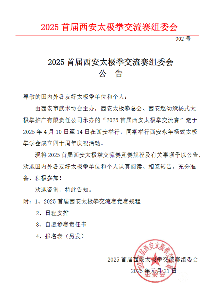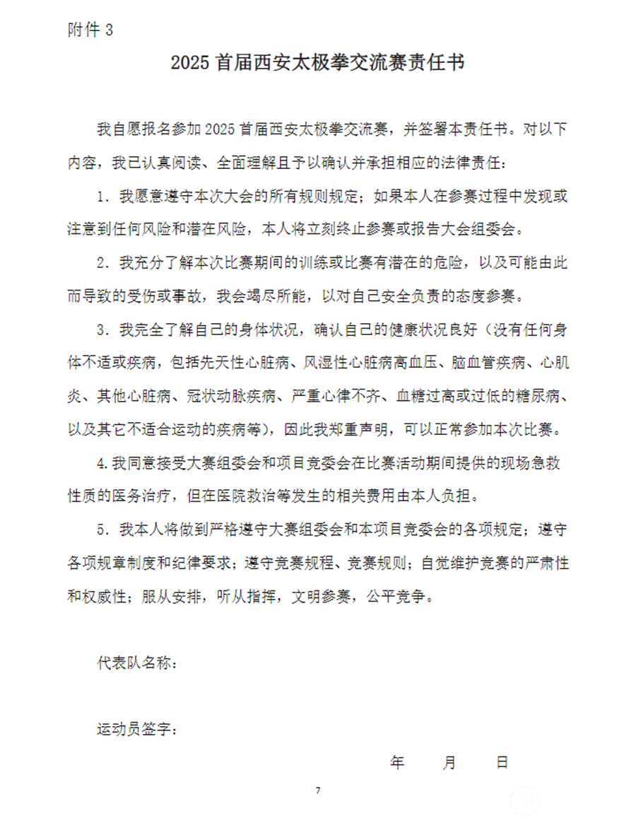 2025首届西安太极拳交流赛竞赛规程 一、竞赛日期和地点 日期:2025年4月10至14日(10日报到,14日离会) 地点:陕西省西安城市运动公园体育馆 地址:西安市未央区未央路168号 二、参赛单位 国内各武术协会、院校、武术太极拳社团组织及海外相关武术太极拳单位、团体和个人。 三、竞赛项目 (一)个人项目 1.国家规定项目:陈式太极拳、杨式太极拳、吴式太极拳、武式太极拳、孙式太极拳,24式太极拳、42式太极拳。 2.传统项目:陈式太极拳、陈式小架太极拳、杨式太极拳、吴式太极拳、武式太极拳、孙式太极拳、赵堡和式太极拳、王其和式太极拳,其他流派太极拳。 3.国家规定套路32式太极剑、42式太极剑;传统太极器械。 (二)集体项目 1.按拳术类、器械类(拳术和器械混编项目归器械类),不分年龄、性别参赛。 2.本次特设家庭组,夫妻或一家两代、三代组成,每个家庭限报一项。 四、参加办法 (一)每队可报领队、教练各1名,运动员人数不限。 (二)每名运动员限报拳术1项、器械1项,可兼报集体项目。 (三)集体项目不分性别、年龄和组别,每个代表队可报多个集体项目,每个集体项目参赛人数6--12人。海外集体项目3人(含3人)以上。 五、竞赛办法 (一)比赛采用中国武术协会审定的《传统武术套路竞赛规则》(2024年修订版)。 (二)完成套路时间的规定 1.太极拳项目:3--4分钟,演练至3分钟时,裁判长鸣哨。提示后运动员可以收势,裁判长鸣哨之后的剩余套路未完成不予扣分。 2.太极器械项目:1.5--3分钟,演练至1.5分钟时,裁判长鸣哨。提示后运动员可以收势,裁判长鸣哨之后的剩余套路未完成不予扣分。 3.集体项目:传统套路3--4分钟,国家规定套路3-6分钟;须配乐,音乐伴奏中不能出现说唱等内容,若出现说唱裁判长扣0.1分;未配乐者裁判长扣0.1分;每队不足6人扣0.1分(国内队);自备 U 盘,由本队教练或领队负责播放音乐。 (三)个人项目年龄分组: 儿童组(A组):12岁以下(2013年1月1日之后出生者) 少年组(B组):13岁至17岁(2008年1月1日至2012年12月31日出生者) 青年组(C组):18岁至39岁(1986 年 1 月 1 日至2007年12月31日出生者) 中年组(D组):40岁至59岁(1966年1月1日至1985年12月31日出生者) 老年组(E组):60岁至70岁(1955年1月1日至1965年12月31日出生者) 寿星组(F组):70岁及以上(1954年12月31日之前出生者) 六、录取与奖励办法 (一)个人项目:各单项各组别男、女分别设一等奖30%、二等奖40%,颁发获奖证书和奖牌,优秀奖30%,颁发获奖证书;寿星组(70岁以上)70%为一等奖,30%为二等奖,颁发获奖证书和奖牌。录取名额均按照实际参赛人数按比例,采取四舍五入的办法计算。如参赛人数不足5人,合并设奖。 (二)集体项目:按拳术和器械分别设一等奖30%、二等奖40%、优秀奖30%,颁发获奖证书和集体奖牌。 (三)设"优秀组织奖"、"突出贡献奖"、"武德风尚奖"及"优秀运动员"、"优秀教练员"、"优秀裁判员"若干。凡组织20人以上参赛的,授予代表队"优秀组织奖"和领队"突出贡献奖"。 (四)设"太极传承奖"、"太极新星奖",分别奖给年龄最长者3人和年龄最小者3人。 七、报名和报到 (一)报名 1.报名方式:请参赛单位将所报人员身份证号、回乡证、台胞证、护照海外人员护照号及报名项目、联系电话等填到报名表(见附件2),发送到邮箱468622051@qq.com. 2.报名截止时间:国内报名截止时间2025年3月20日24时;海外报名时间截止2025年3月1日24时。 3.收费:个人项目每人报名费200元人民币(含两个单项比赛);家庭组每个家庭报名费100元人民币;集体比赛每项报名费300元人民币。所收费用包含资料费、会务费、礼品等,礼品每人限领一份。请于报名时一次性将费用汇入指定账户,报名后没来参赛者不退费。 4.各参赛队食宿、交通费用自理。 5.汇款账户 对公账户:3700021109200112988 户名:西安赵幼斌杨式太极拳推广有限责任公司 中国工商银行股份有限公司西安和平路支行 组委会指定个人账户:6222 0337 0001 0358 828 张盼盼 开户行:中国工商银行和平路支行 微信支付:王雨婷 (二)报到 1.裁判员和各地运动队报到时间2025年4月10日14点到20点。报到地点另行通知。 2.各参赛队报到时需提供以下材料:赛前15天内参赛运动员的《健康证明》《人身意外保险单》(保单须包含比赛时间)、参赛运动员本人签署的《自愿参赛责任书》。港澳台、海外人员参照上述内容提供相应的保险证明,签署《自愿参赛责任书》,不需医院体体检证明。 八、联系方式 国内咨询:张盼盼 电话:17791850566 海外咨询:李 萍 电话:18092325591 九、其它未尽事宜另行通知。 2025首届西安太极拳交流赛组委会 |